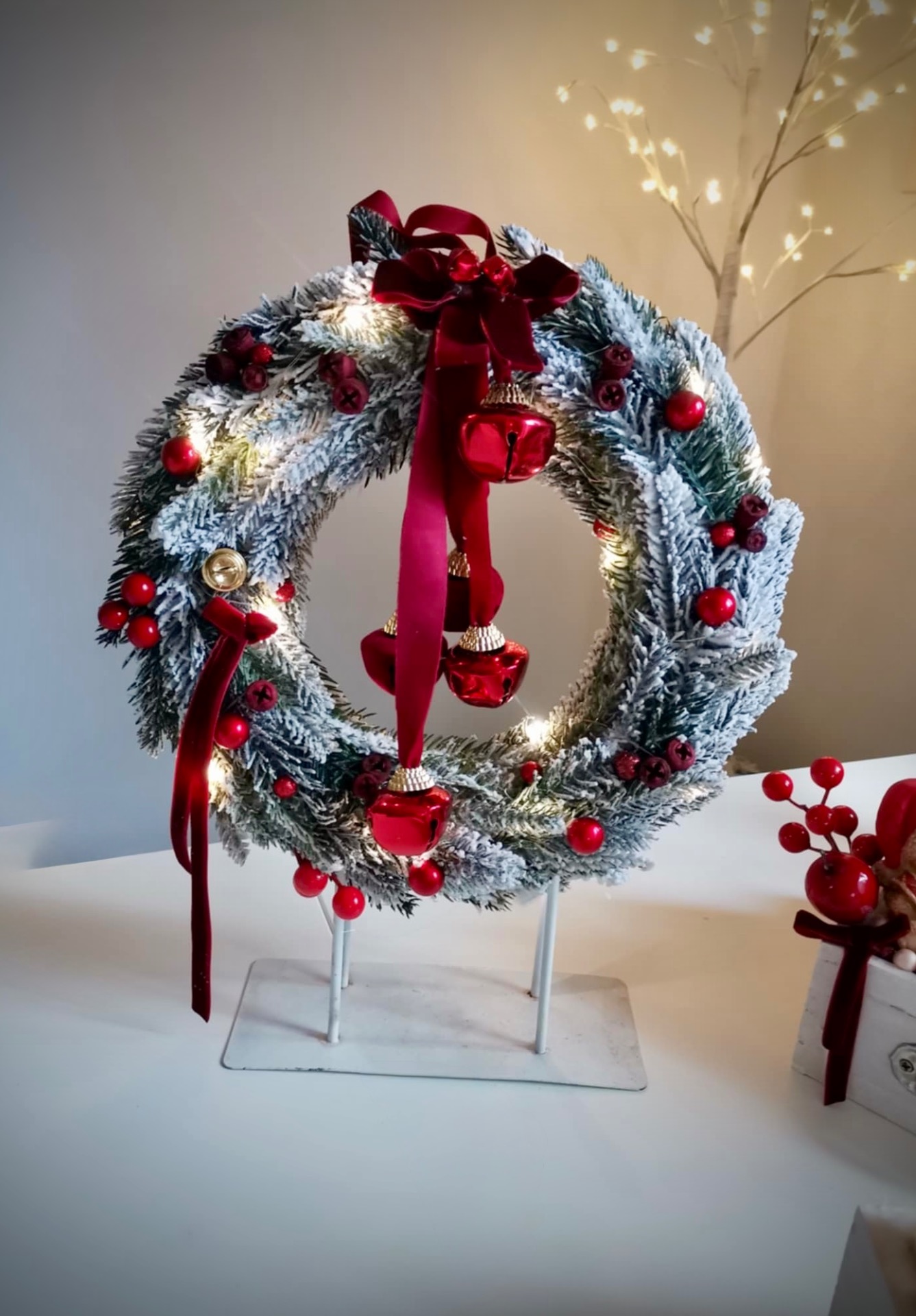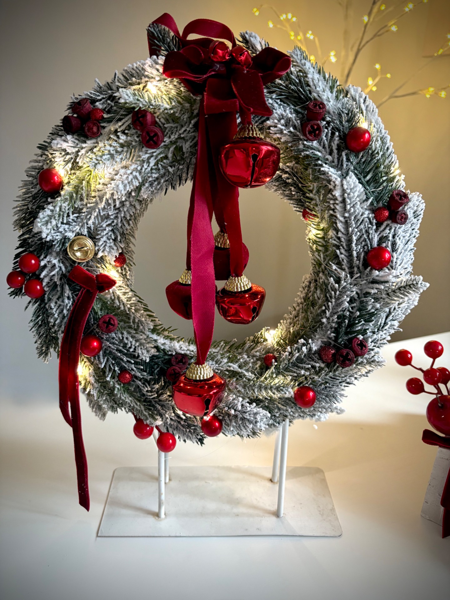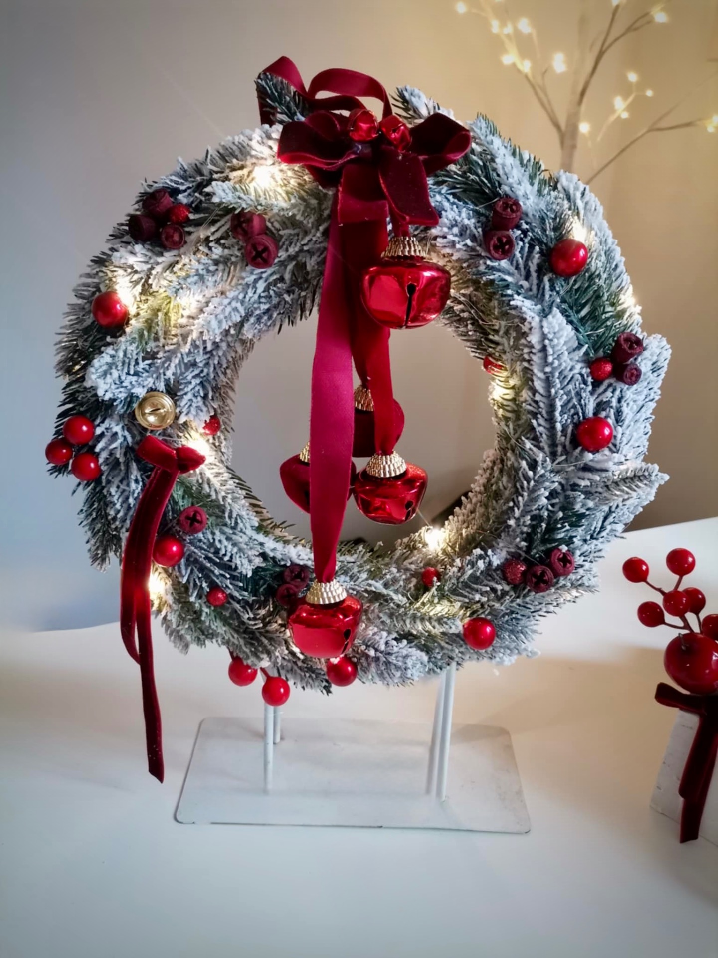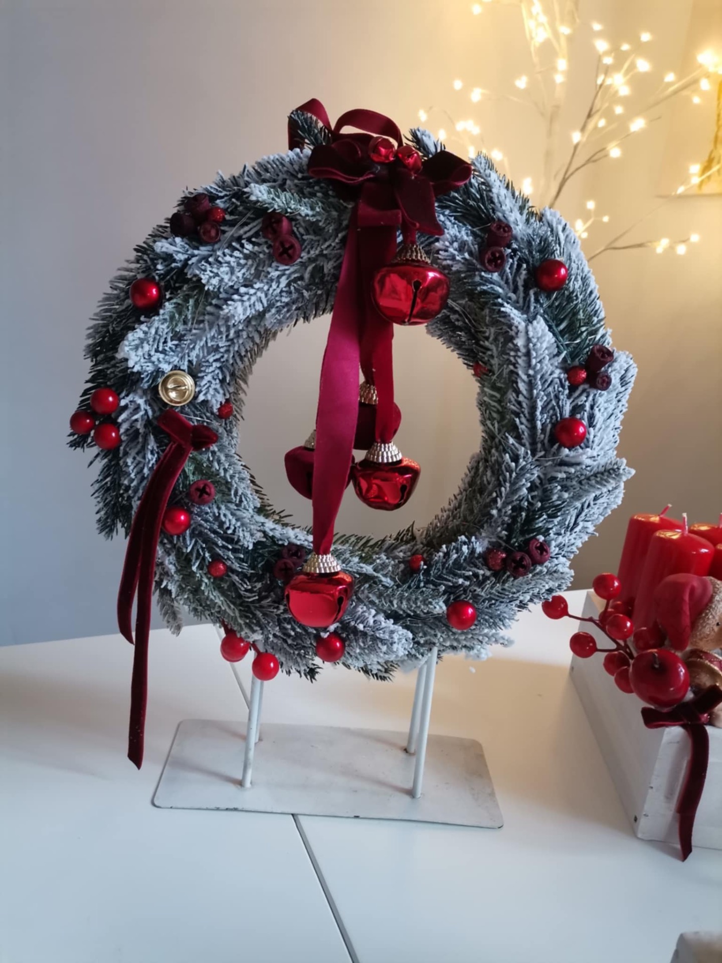 Idén is hódít a piros! 25 centis alappal dolgoztam, a kész termék átmérője kb 30 cm. Az alap plüssel bevont, csengettyűvel díszített. A kopogtató világítása elemmel működik, 3 féle valasztható világítási móddal!