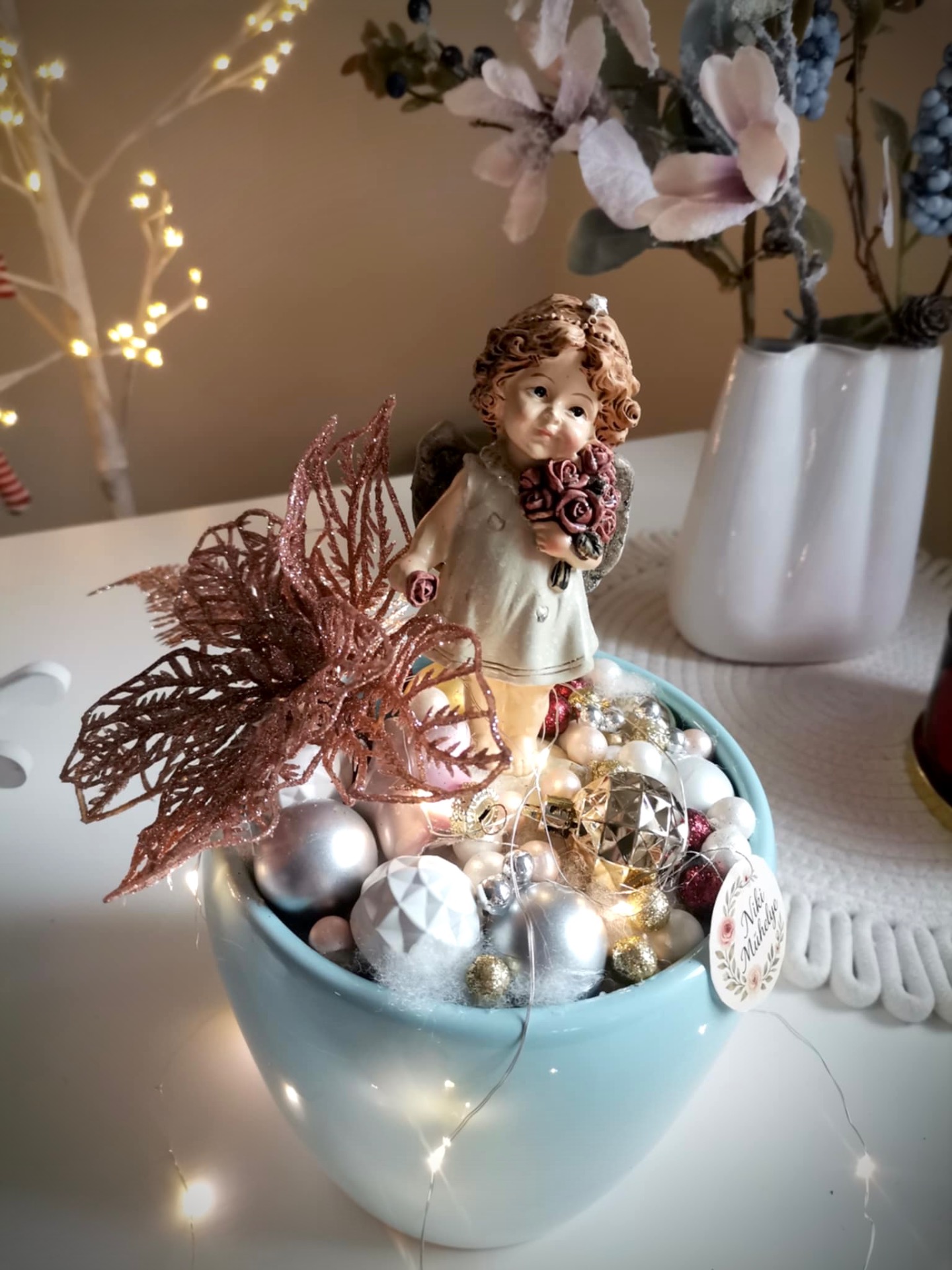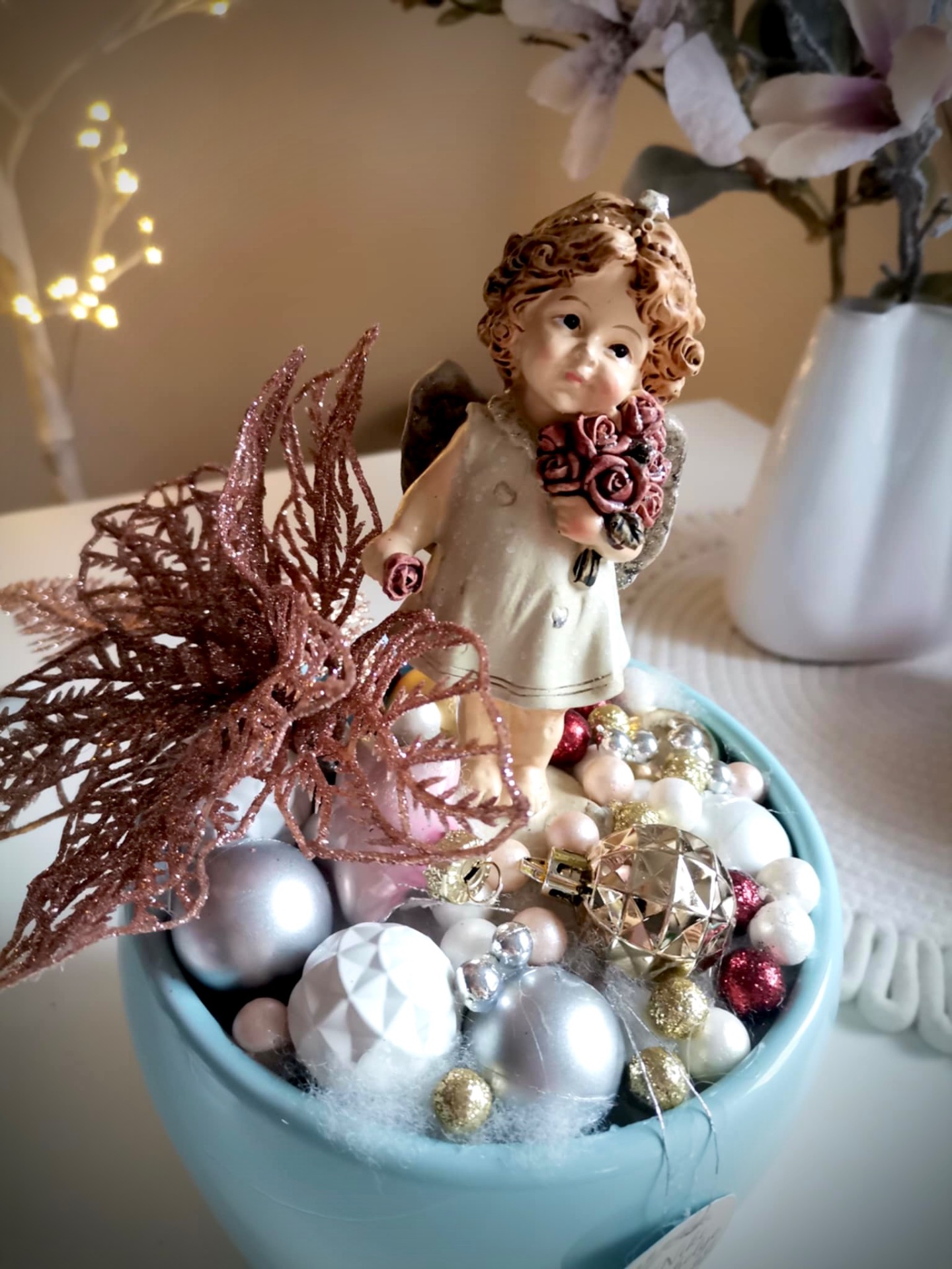 Különleges, Angyalka asztaldísz. Magas fényű, kerámia kaspóban. A világítás elemmel működik, 3 féle választható világítási móddal! Minden része maradandó!
