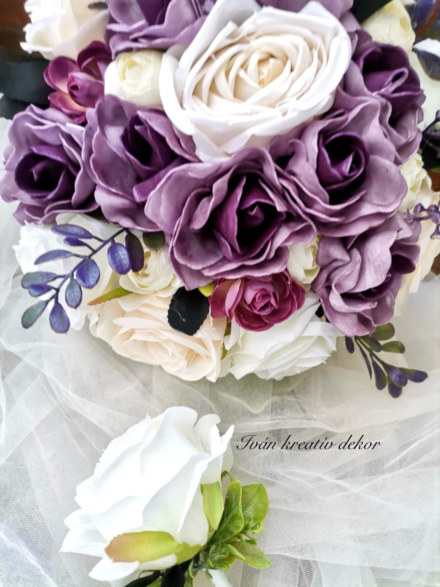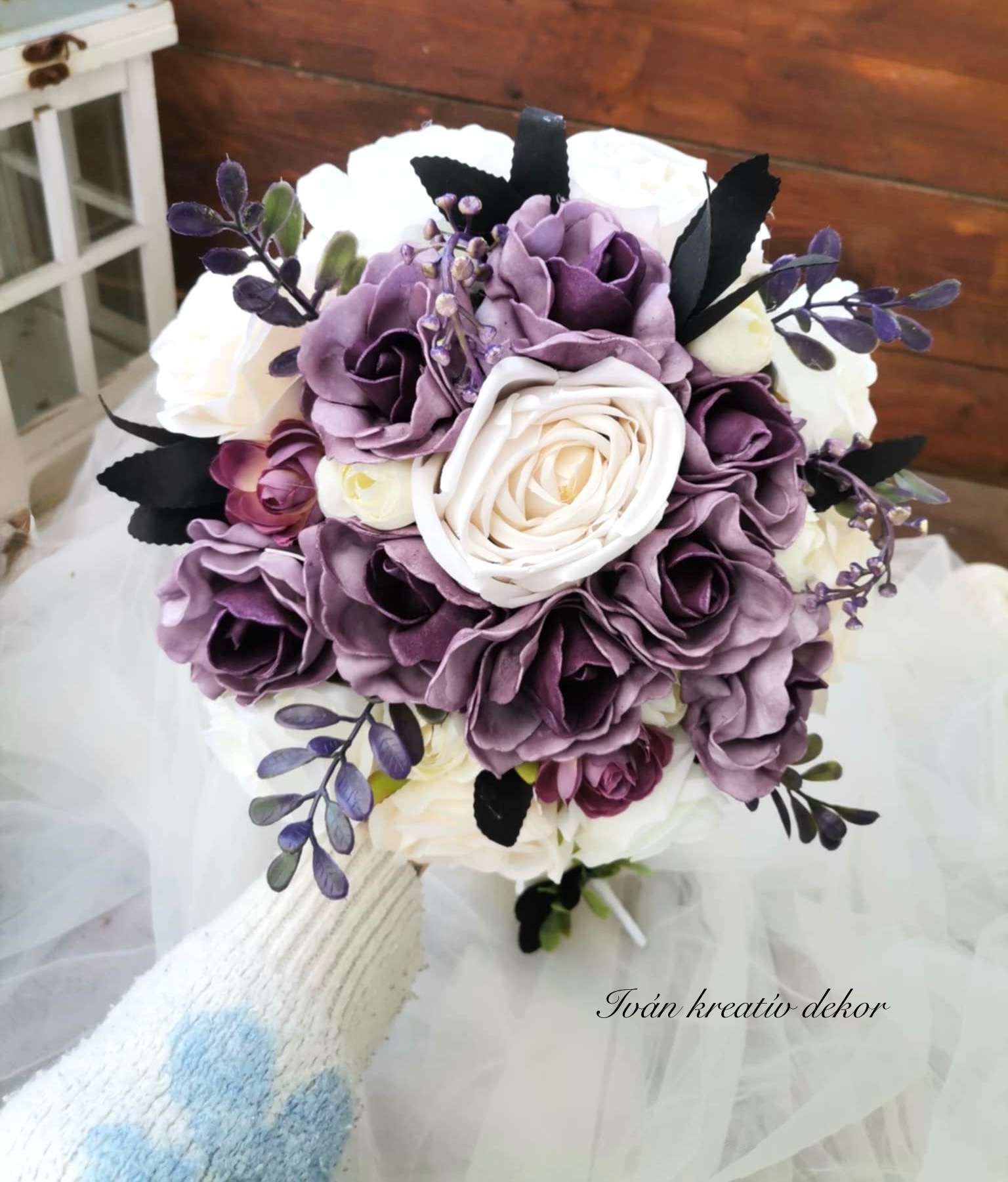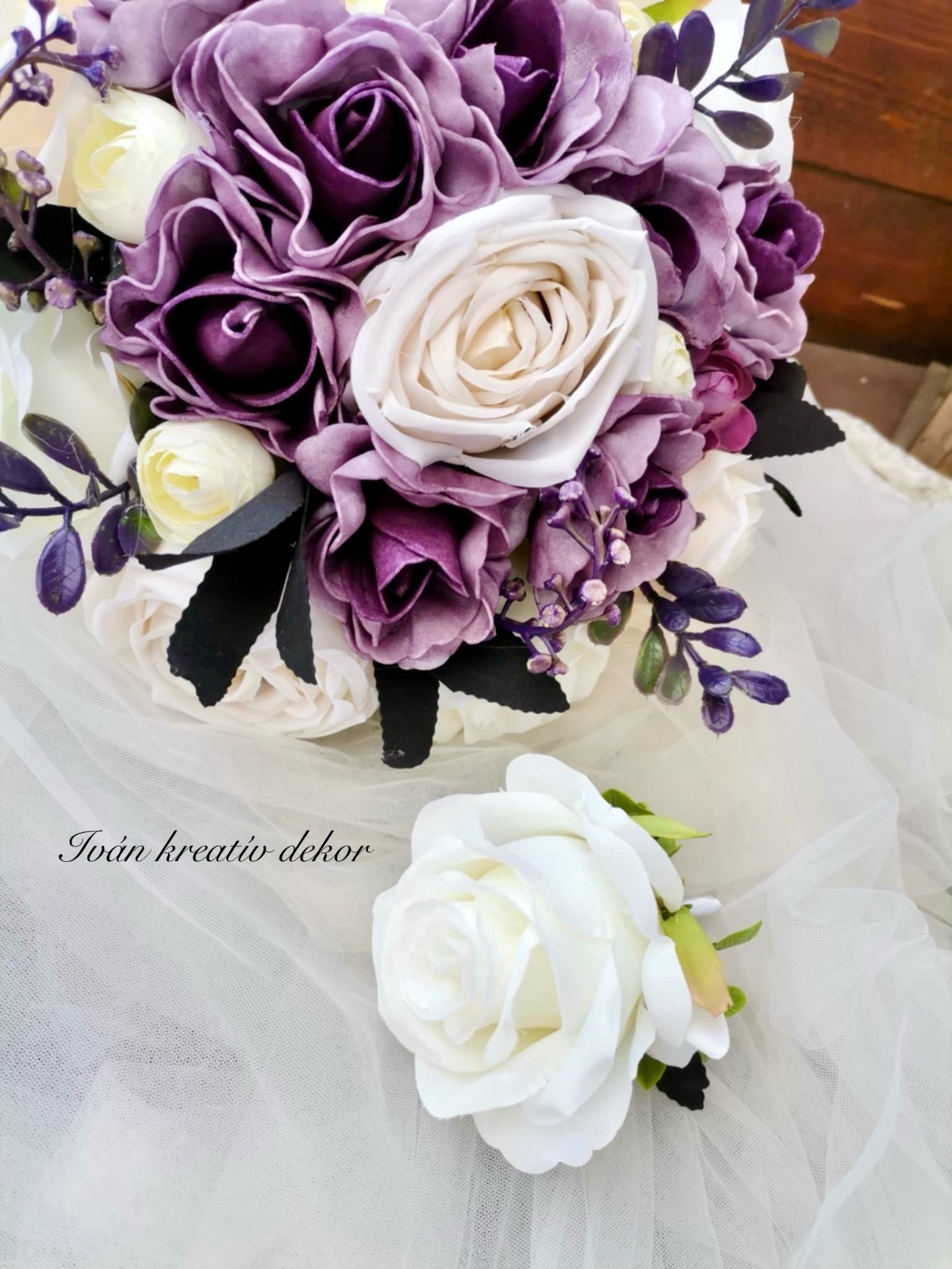 Antik lila (minőségi polifoam virág) a fehér rózsa (selyemvirág).