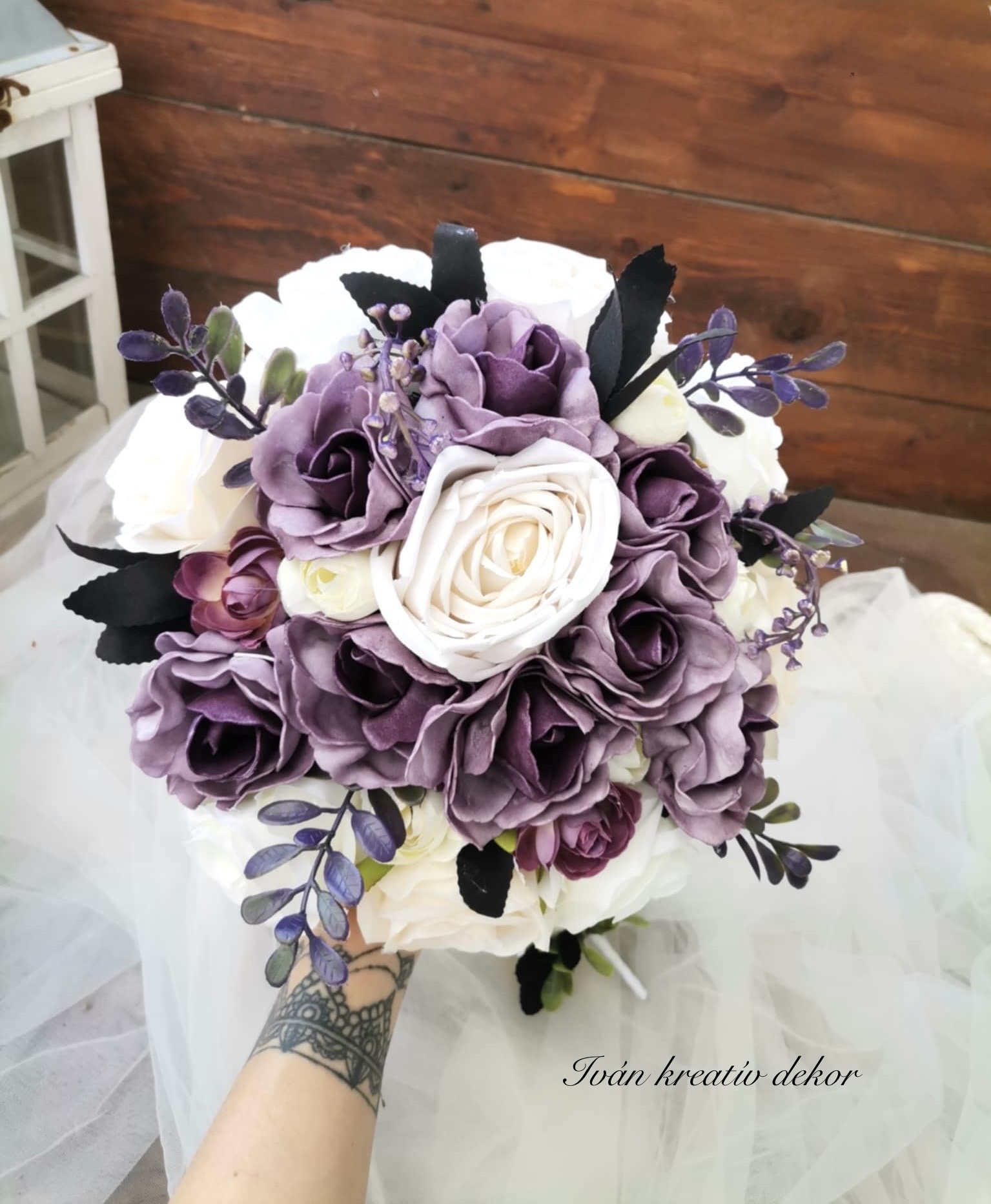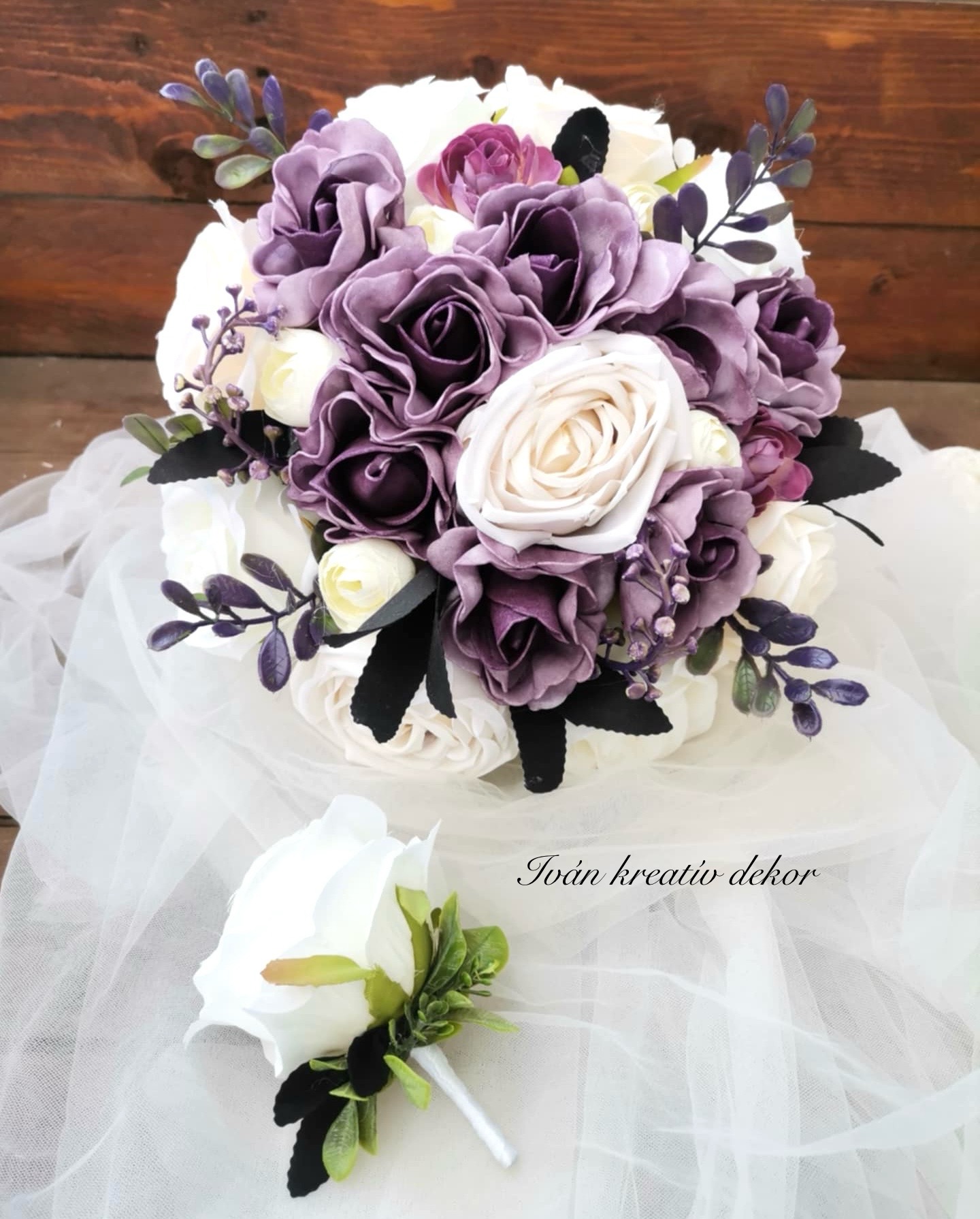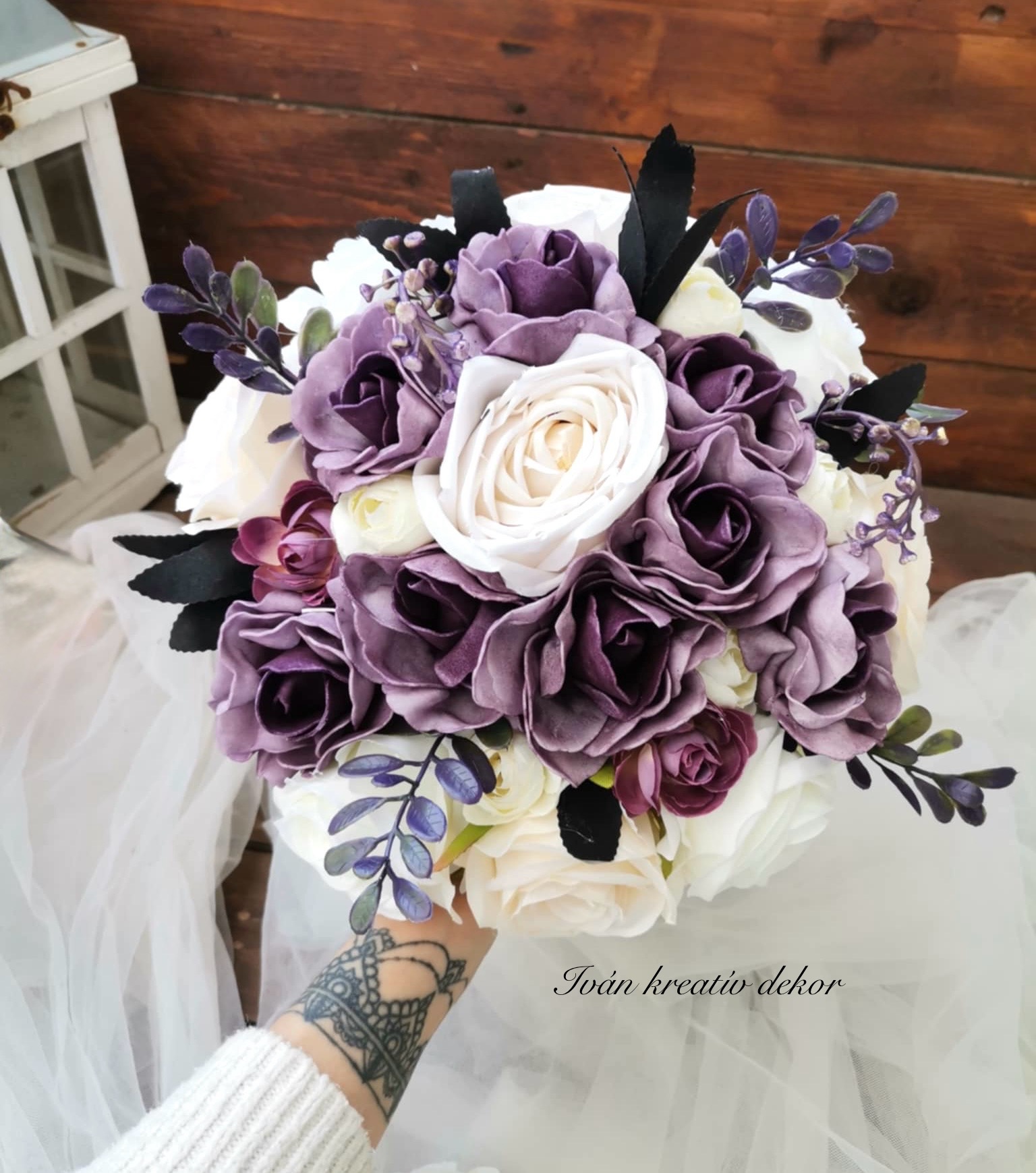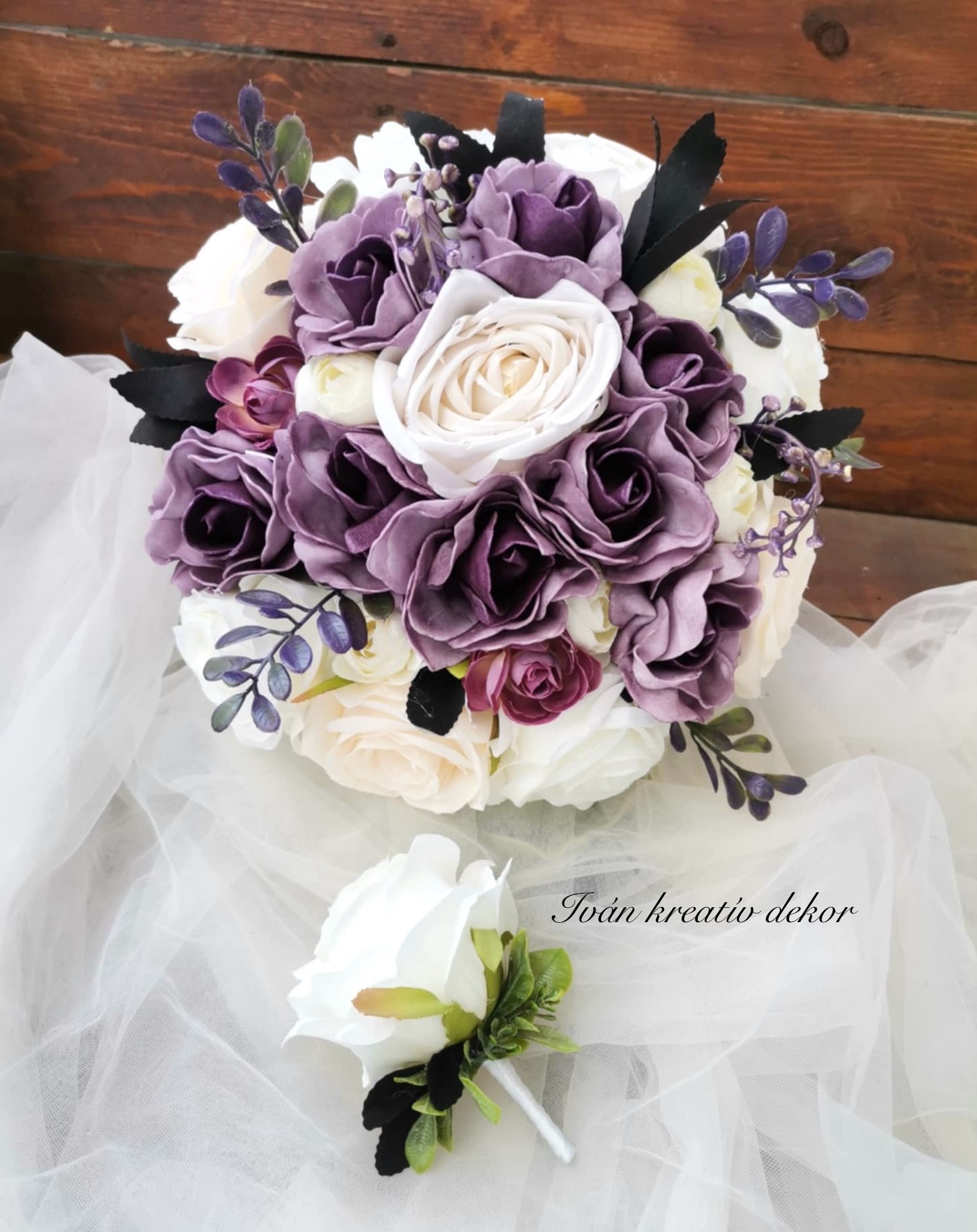 Antik lila (minőségi polifoam virág) a fehér rózsa (selyemvirág).