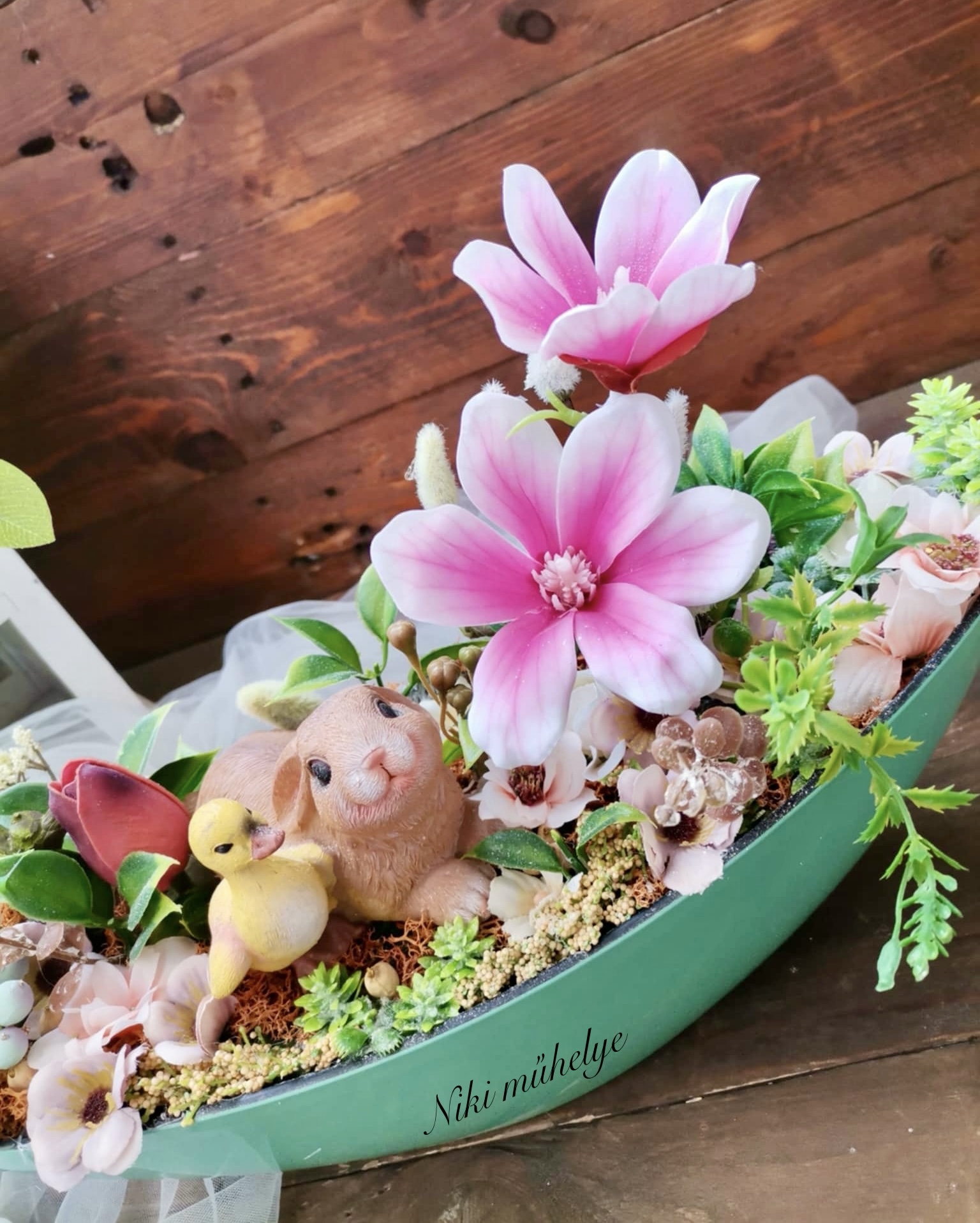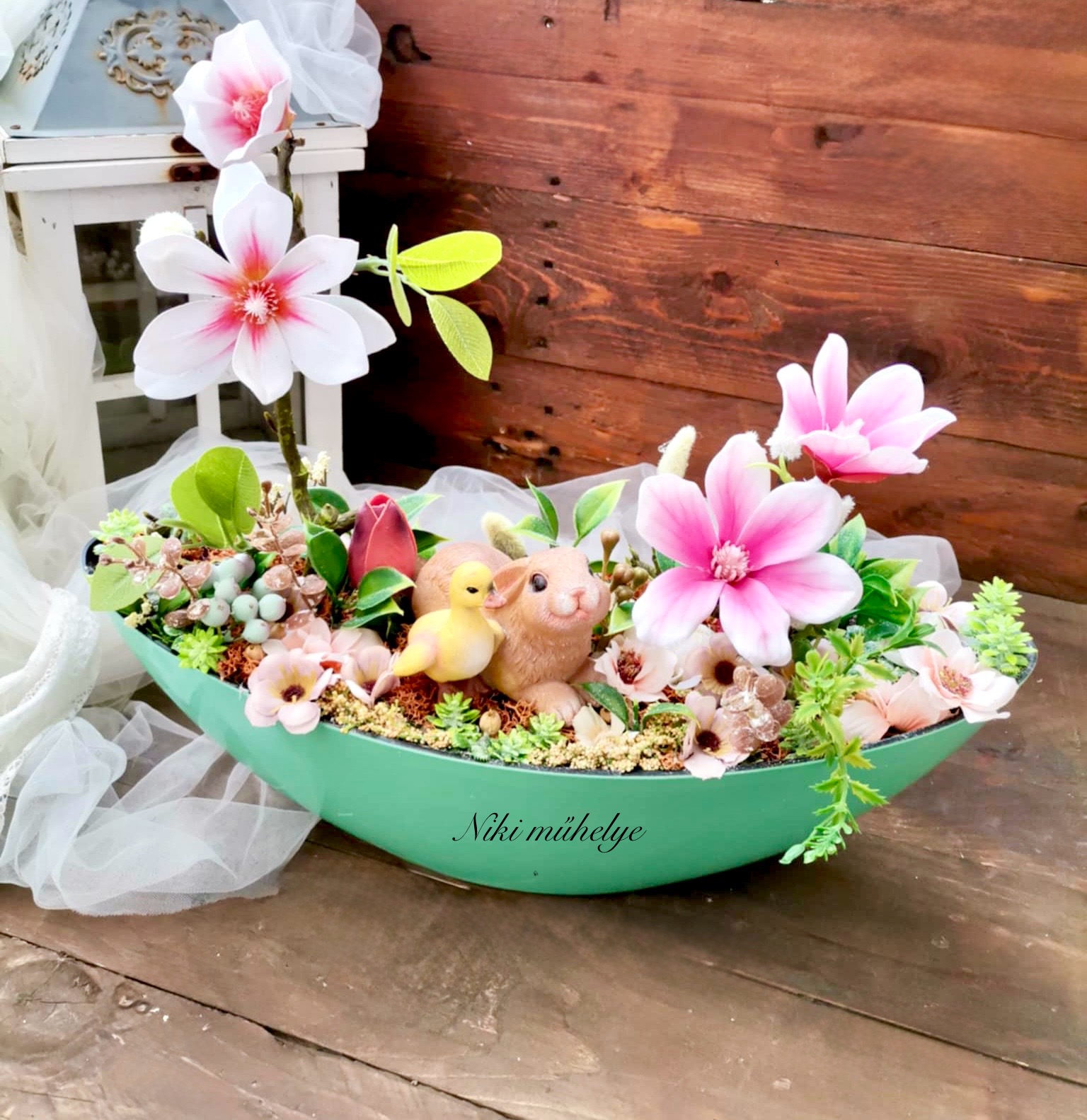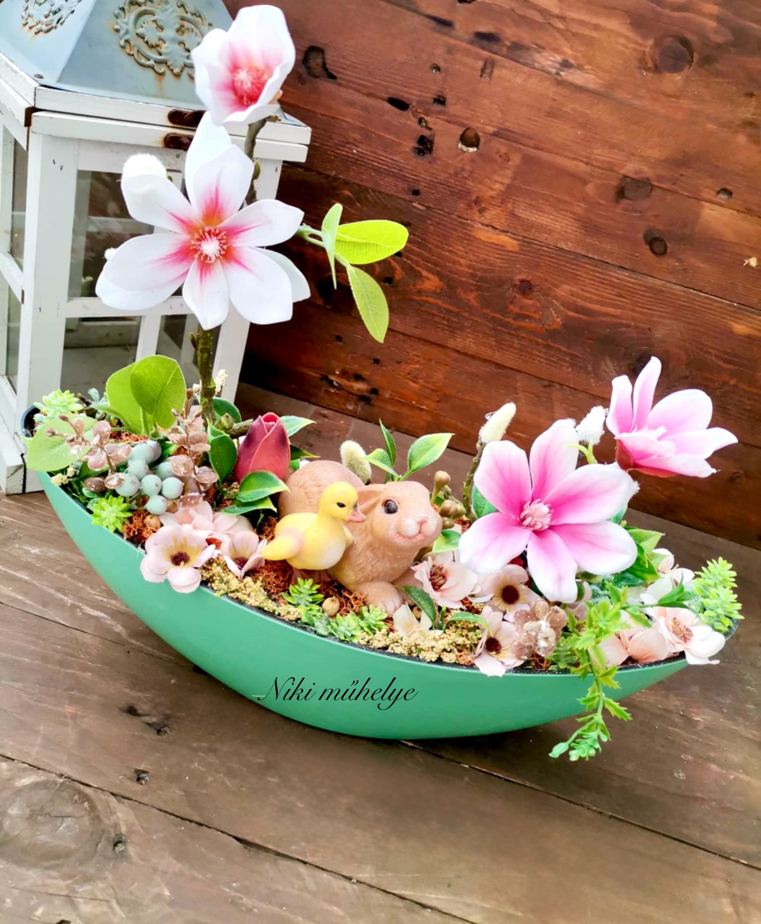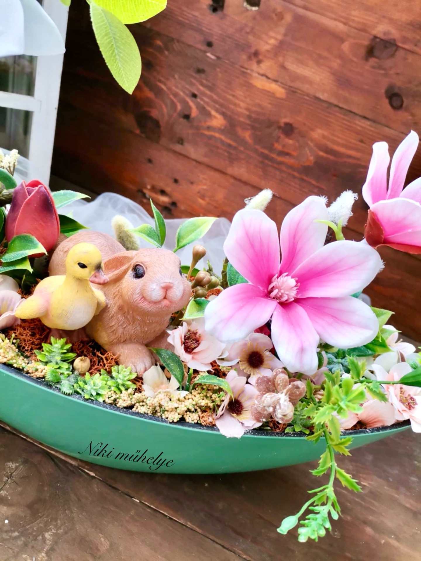 Nyuszi és kacsa pajtik. Magas fényű, műanyag kaspóban készült dekoràció.