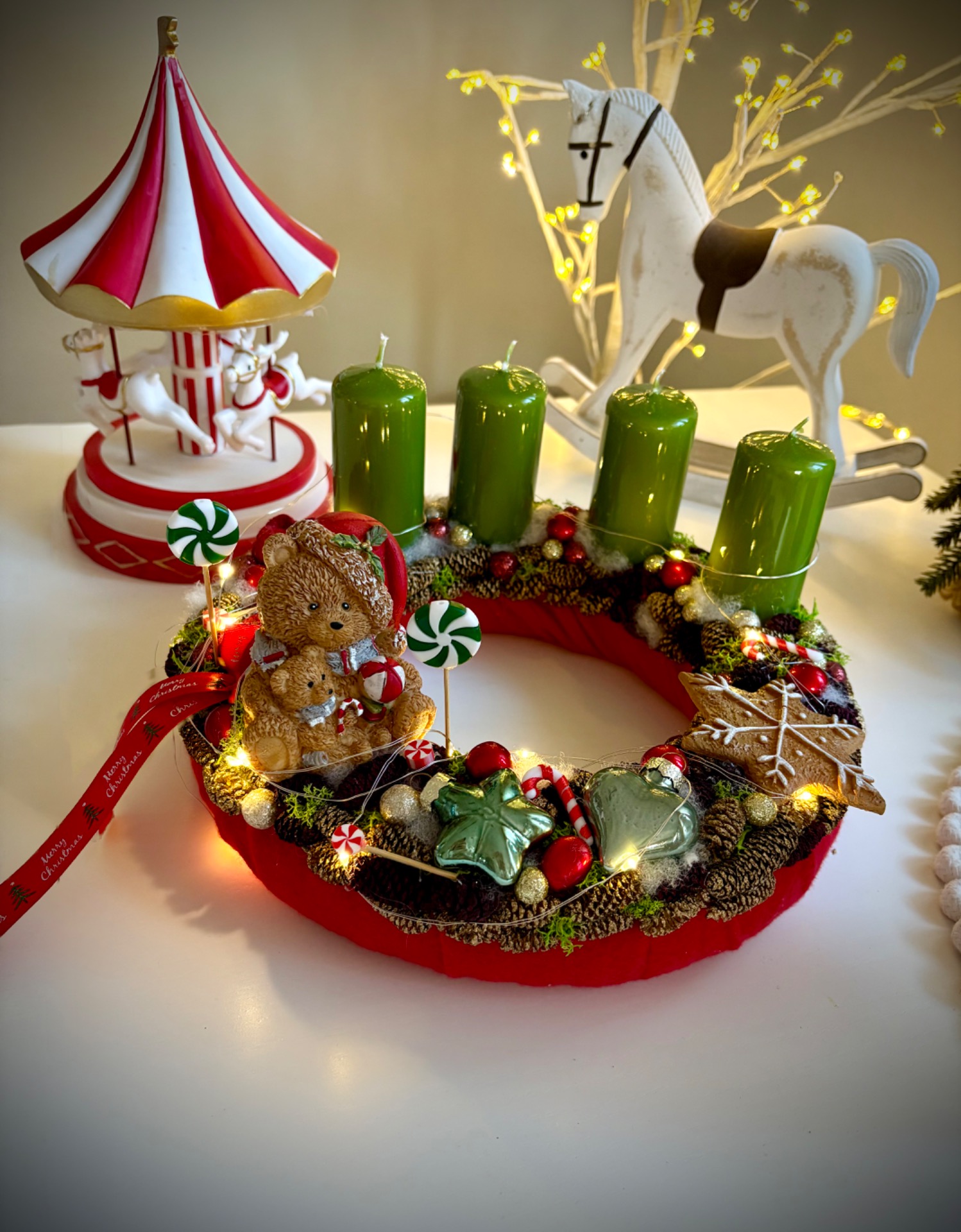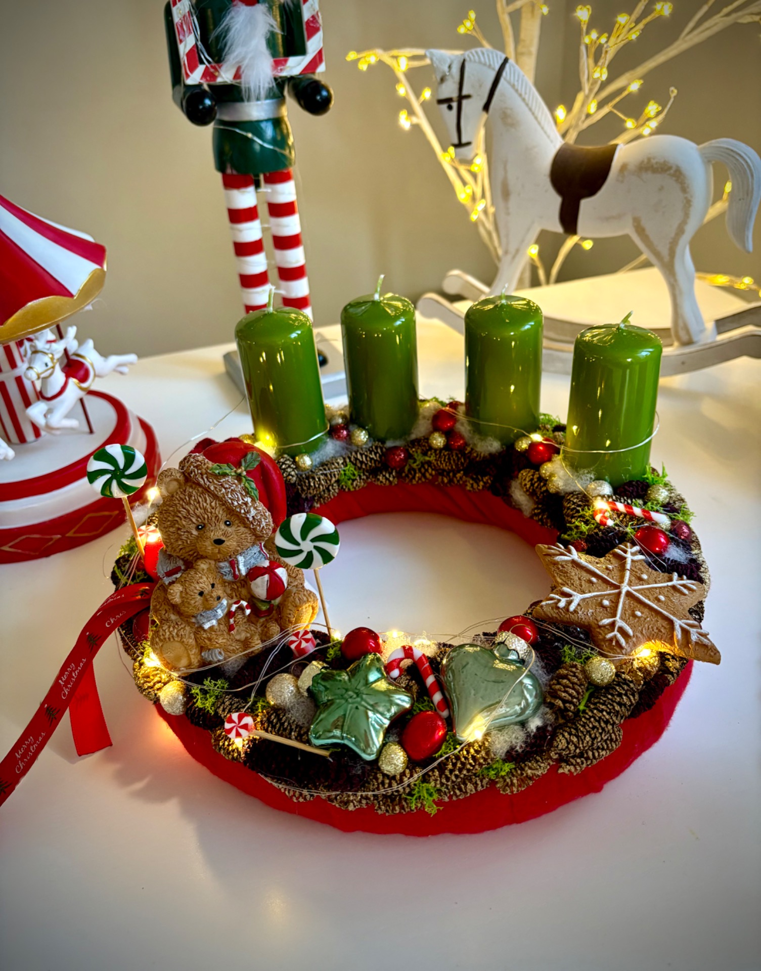 Hagyományos piros, zöld színekben készült adventi koszorú.