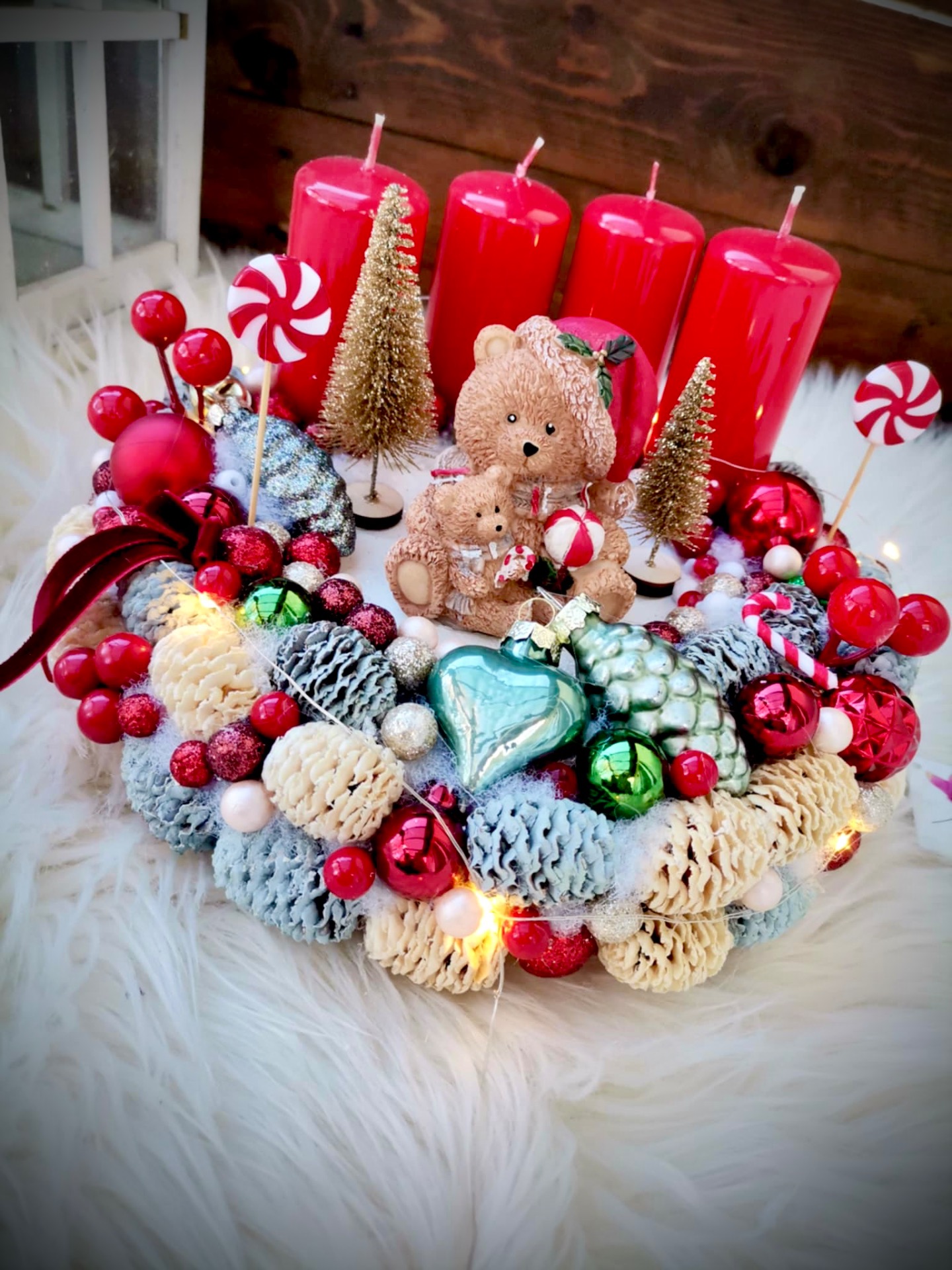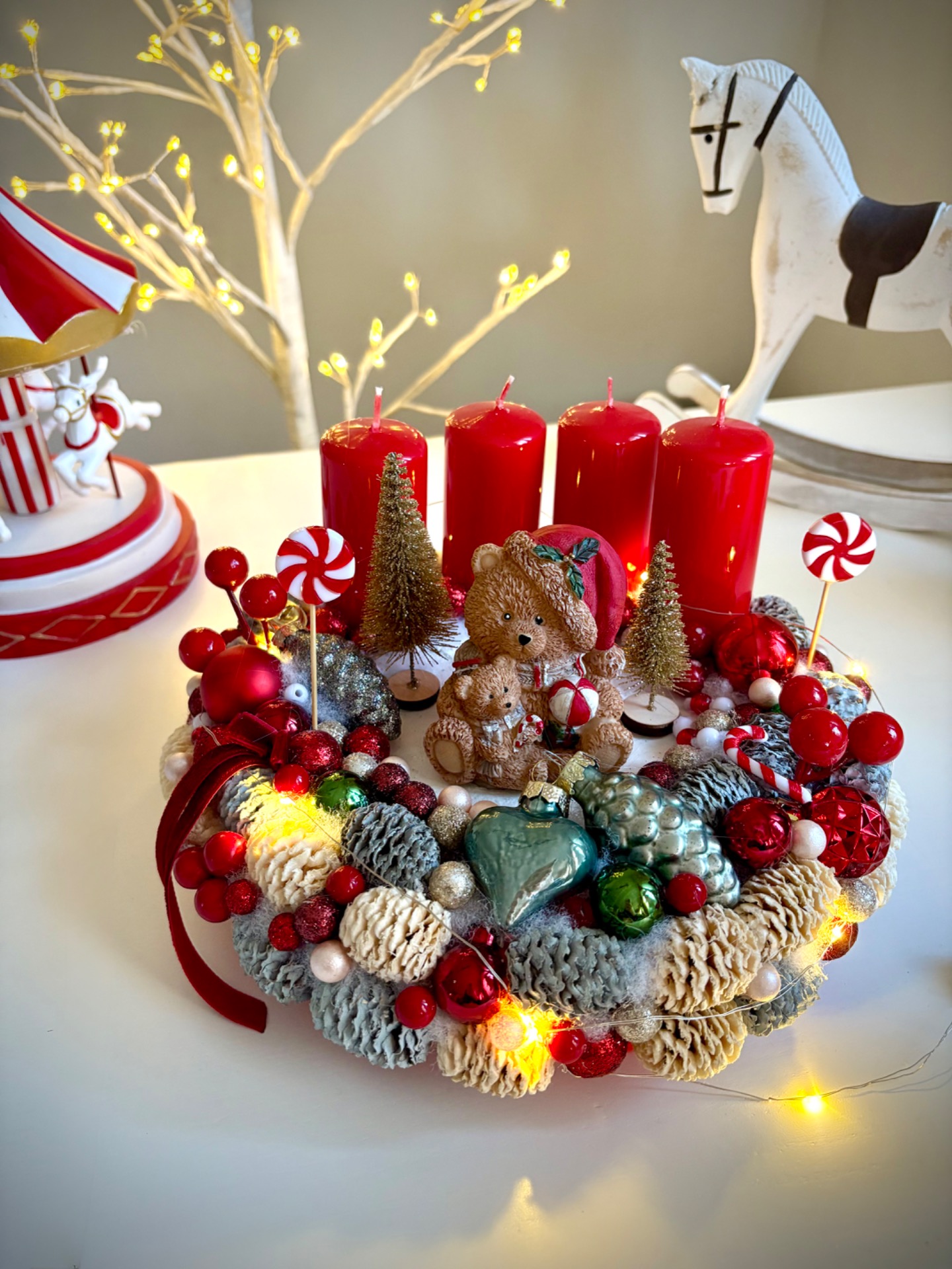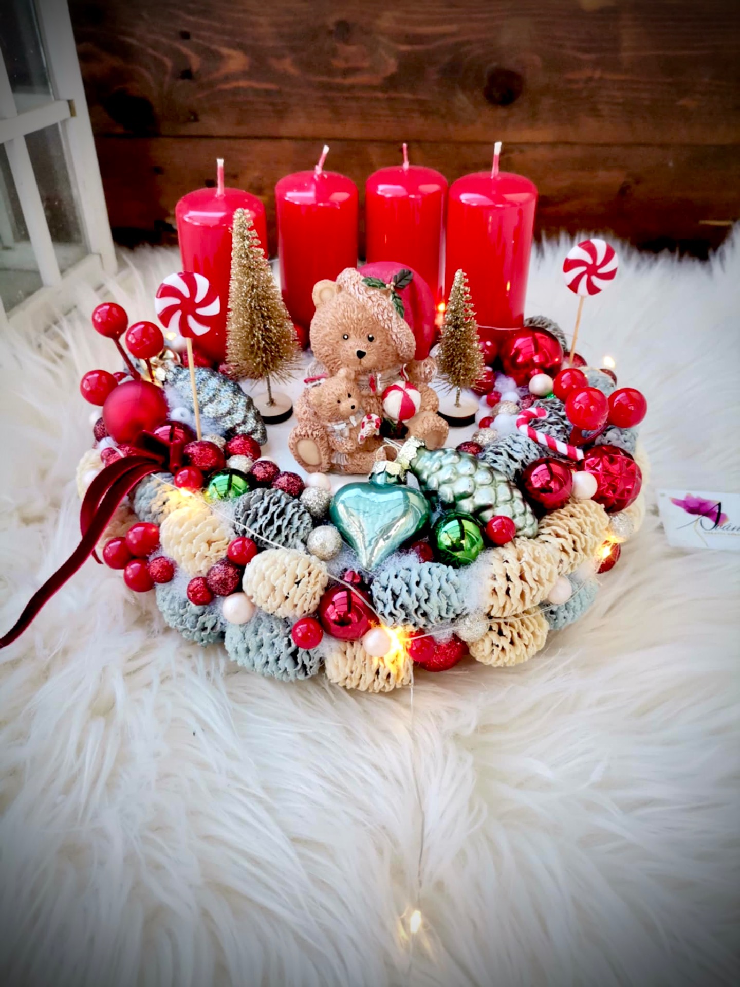 20 centis alappal dolgoztam, plüssel vontam be. A koszorú világítása elemmel működik, 3 féle valasztható világítási móddal! A gyertyákat gyertytüskékkel rögzítettem, így később cserélhető.