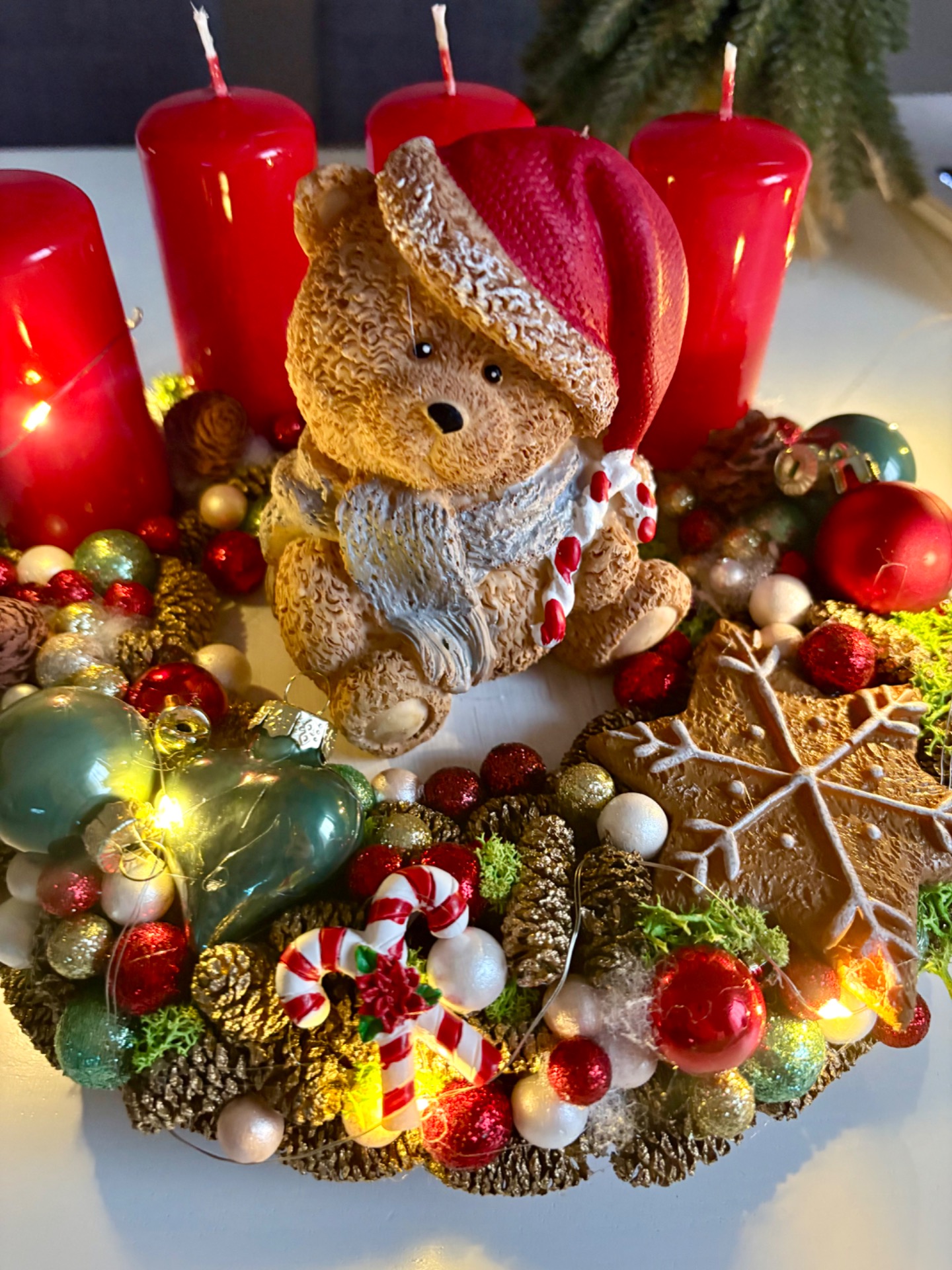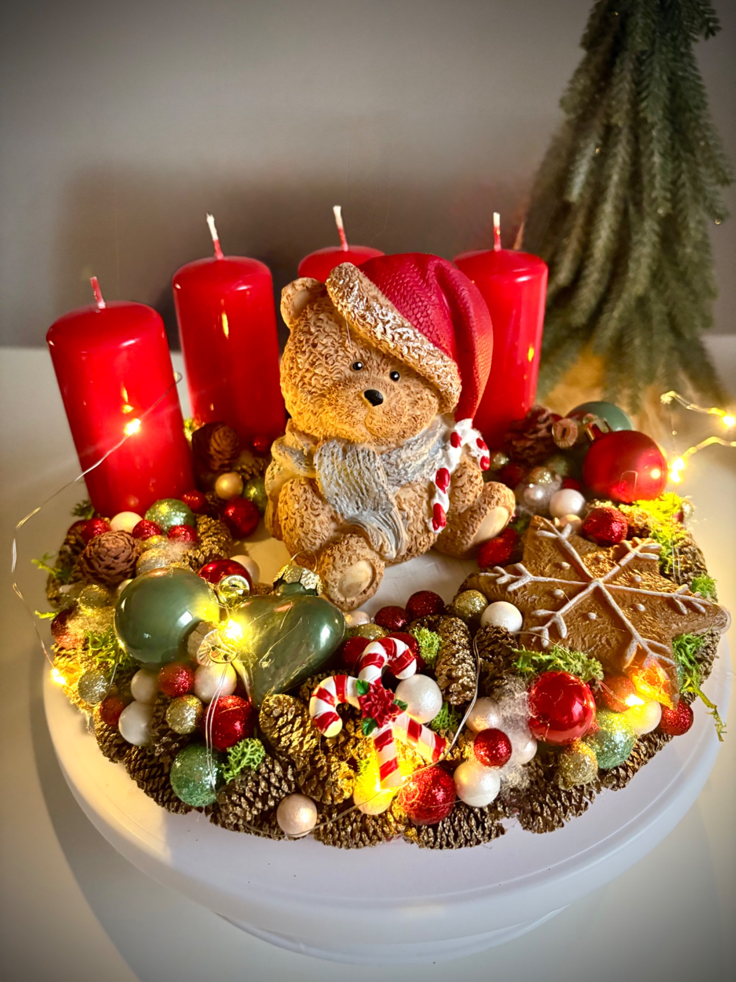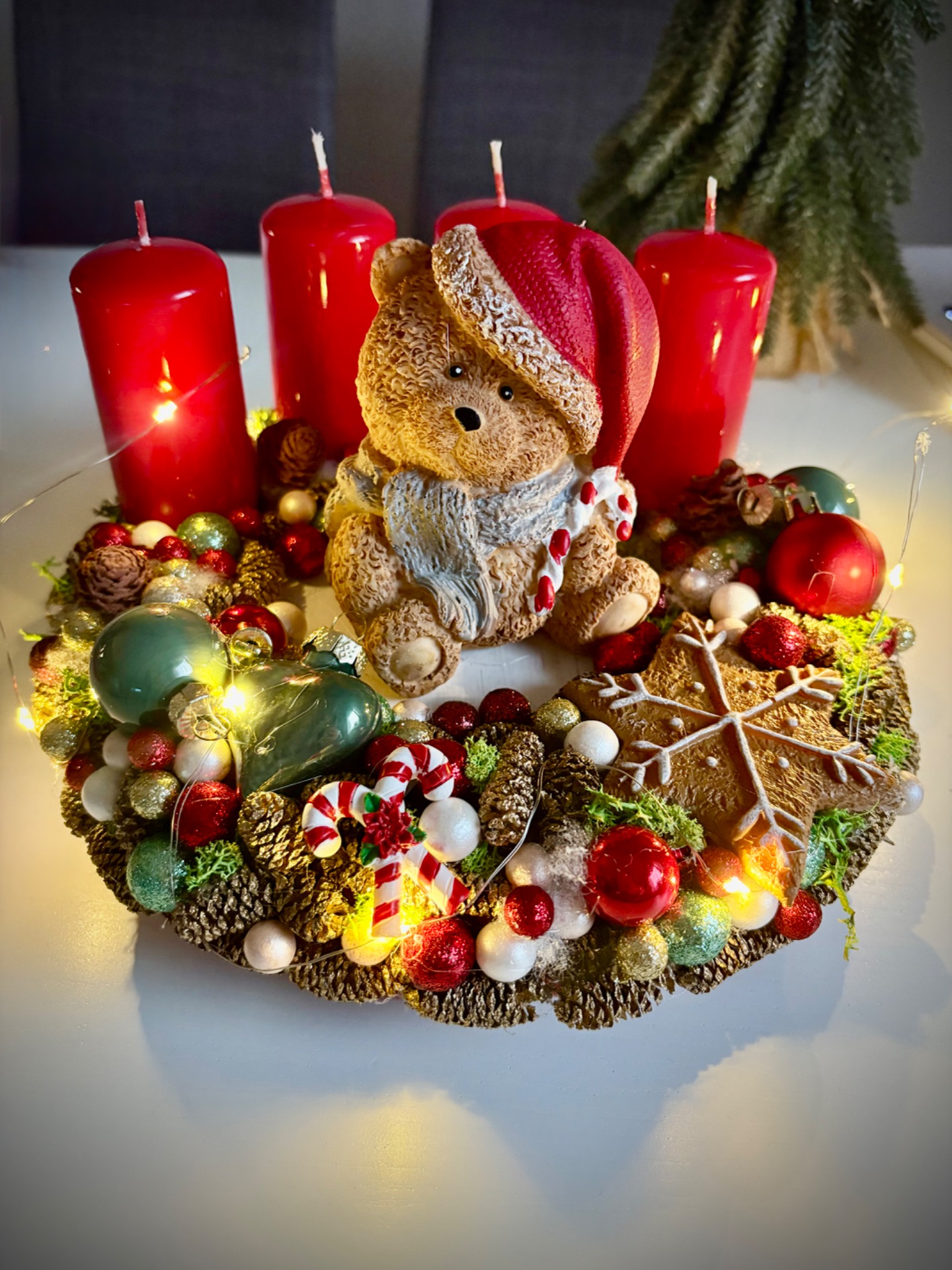 20 centis alappal dolgoztam, plüssel vontam be. A koszorú világítása elemmel működik, 3 féle valasztható világítási móddal! A gyertyákat gyertytüskékkel rögzítettem, így később cserélhető.