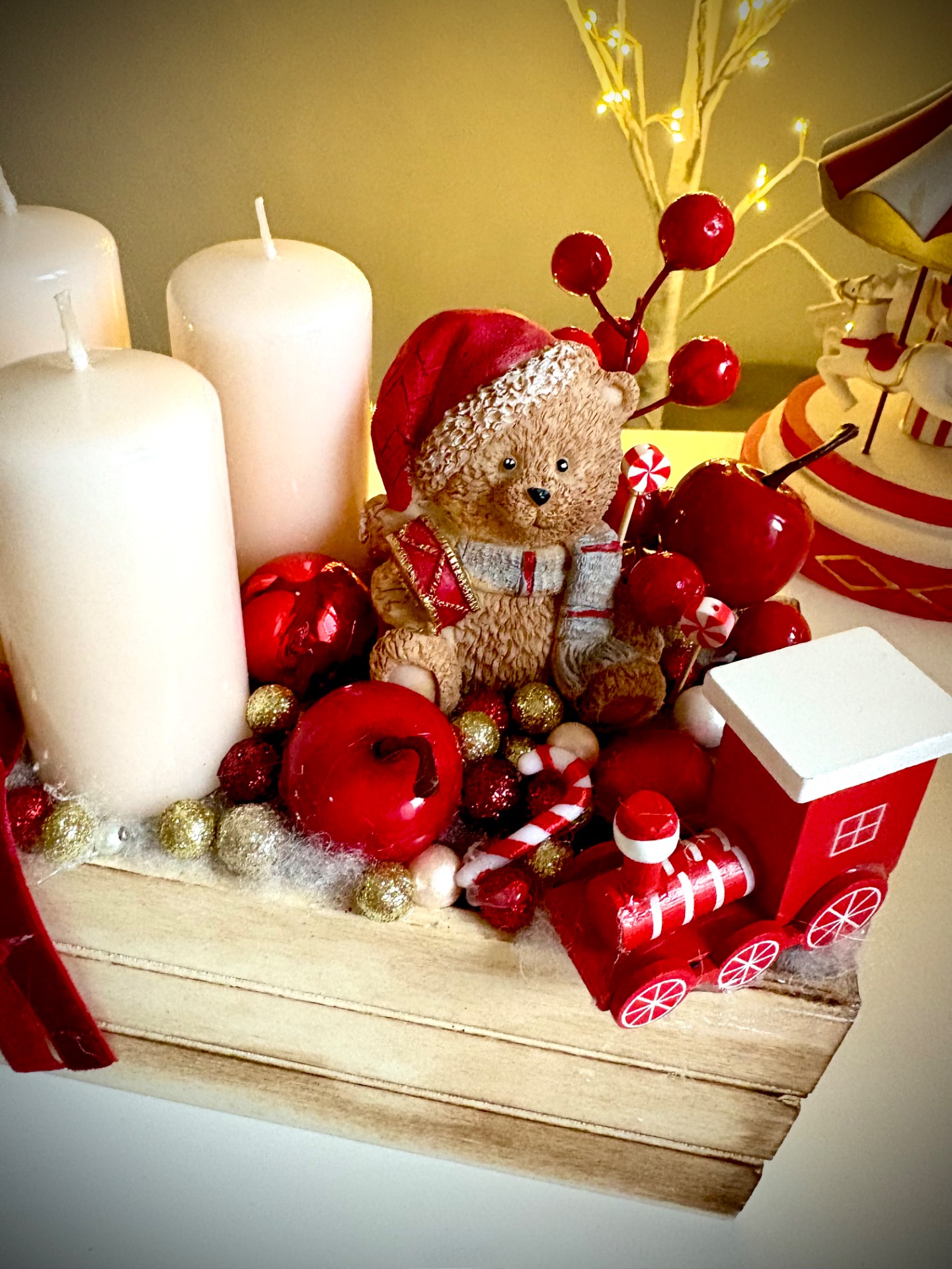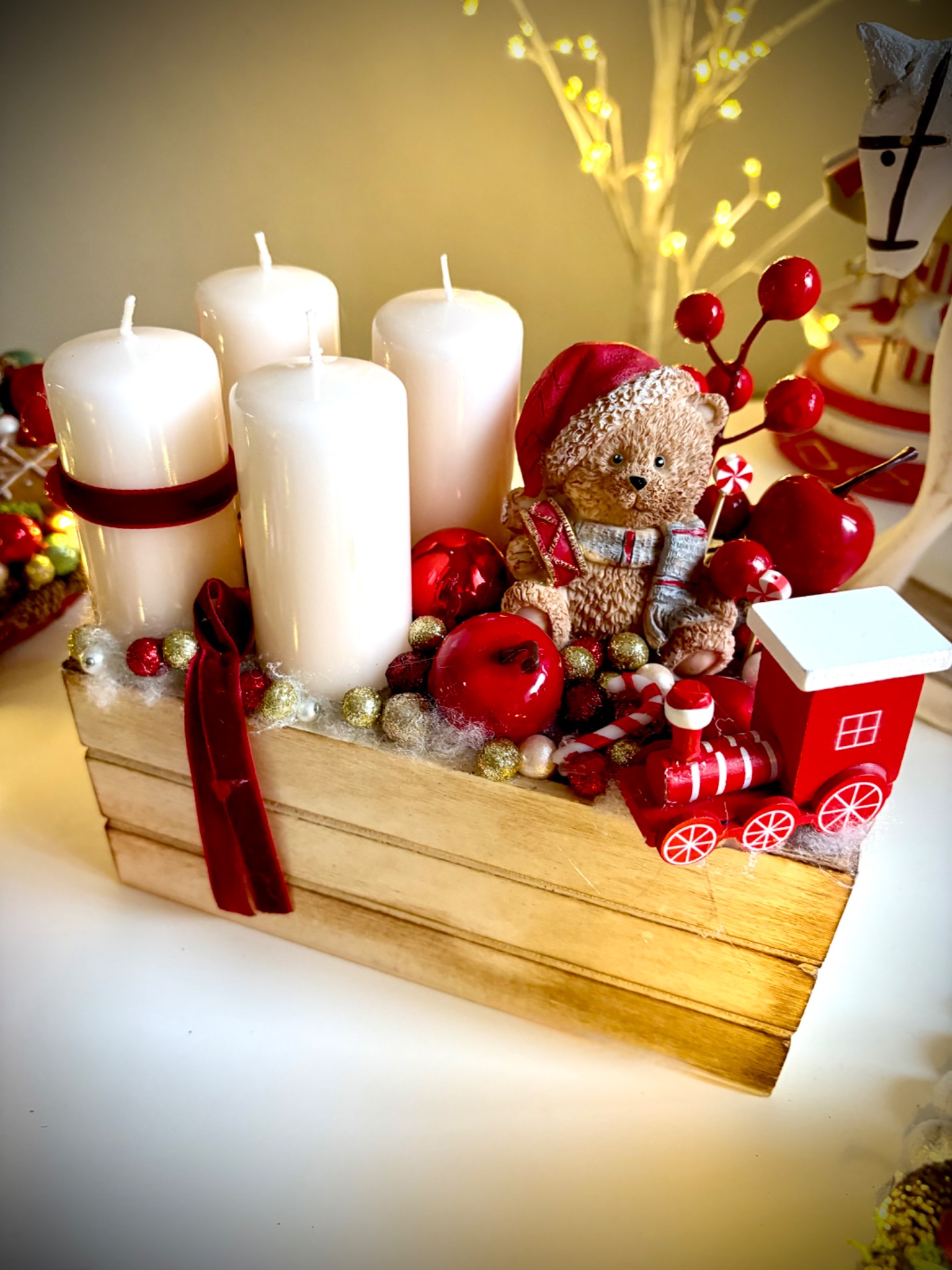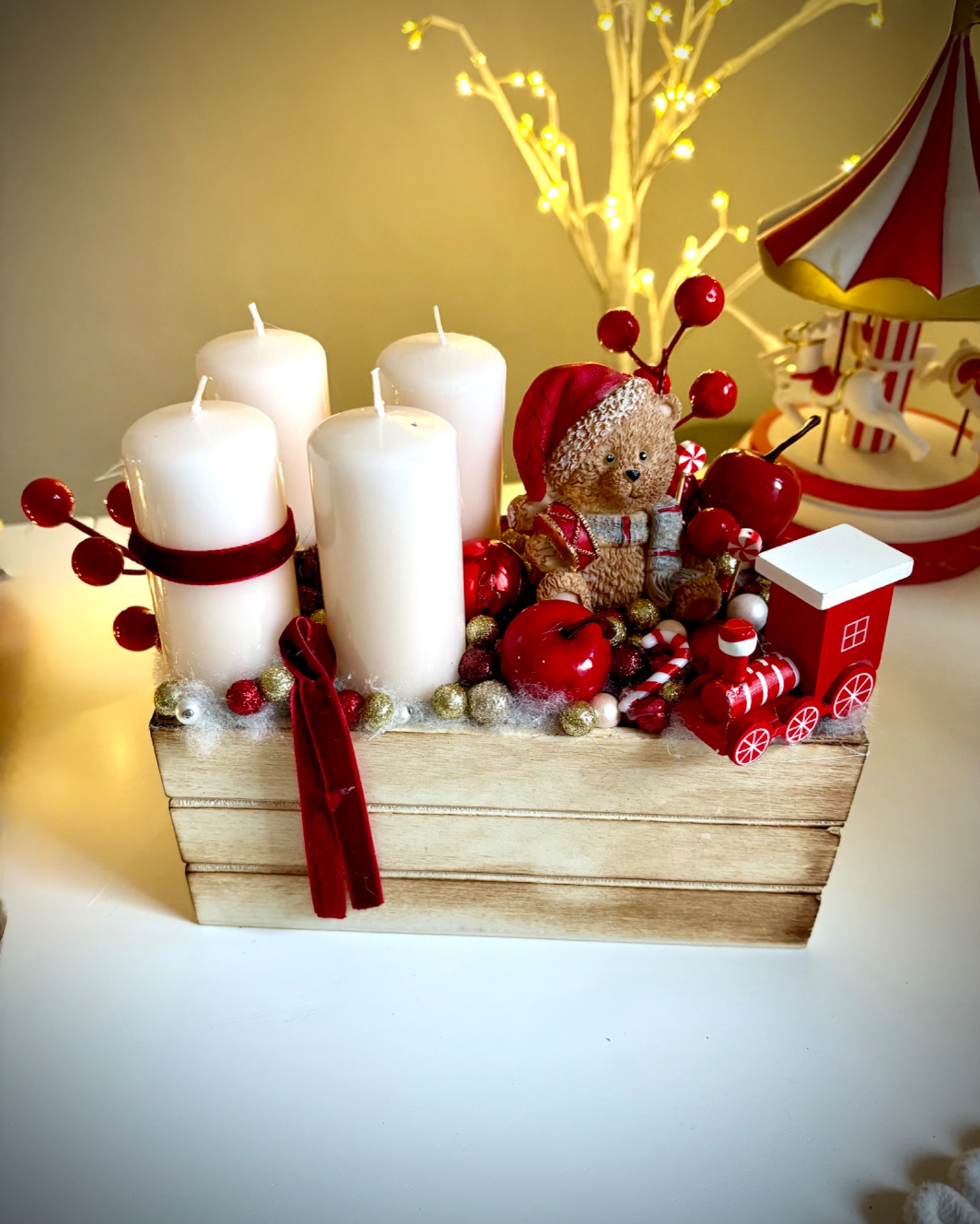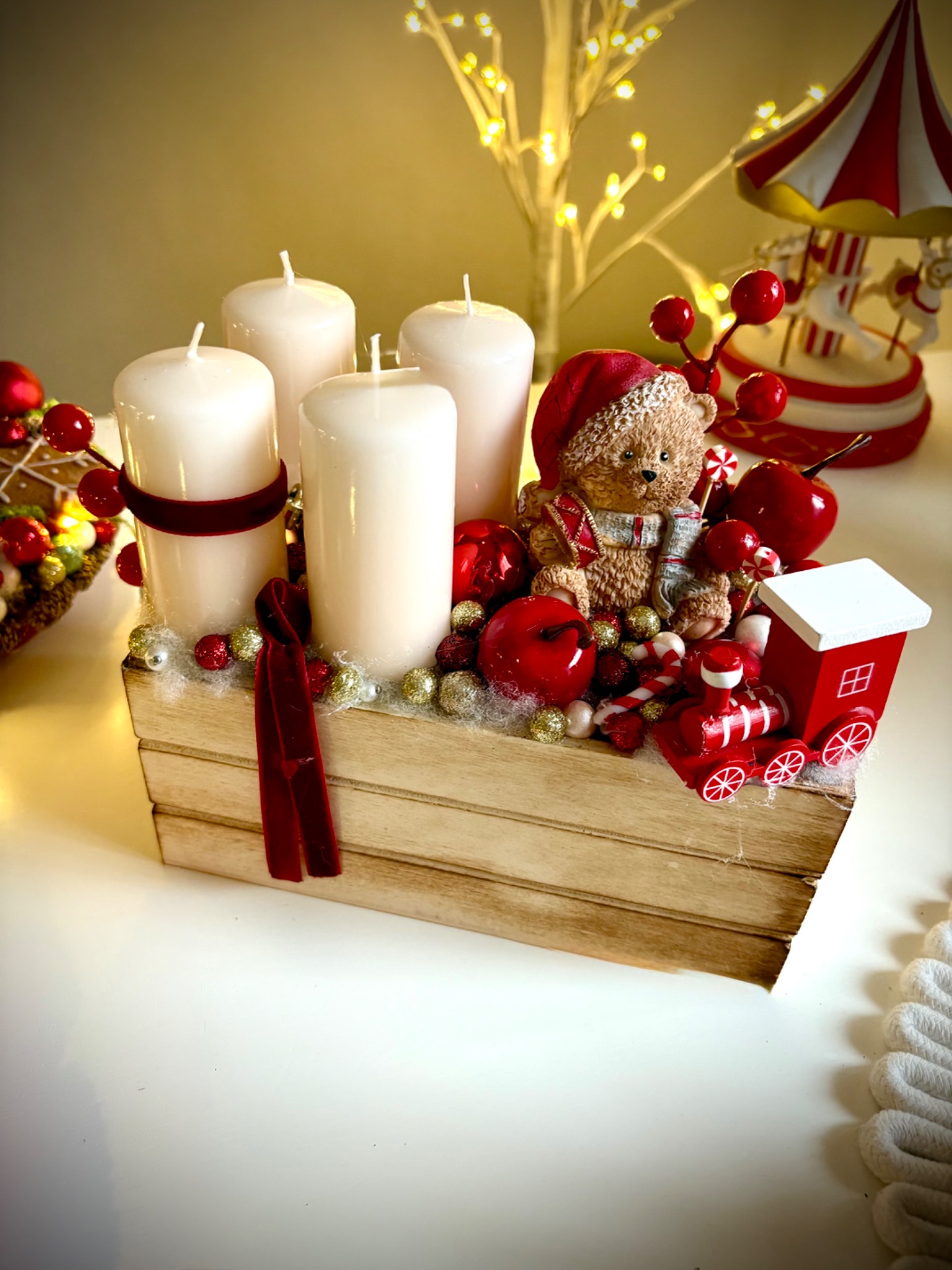 A láda mérete Kb.11*20*8,7cm, ezt építettem. A gyertyákat gyertytüskékkel rögzítettem, így később cserélhető. A koszorú világítása elemmel működik.