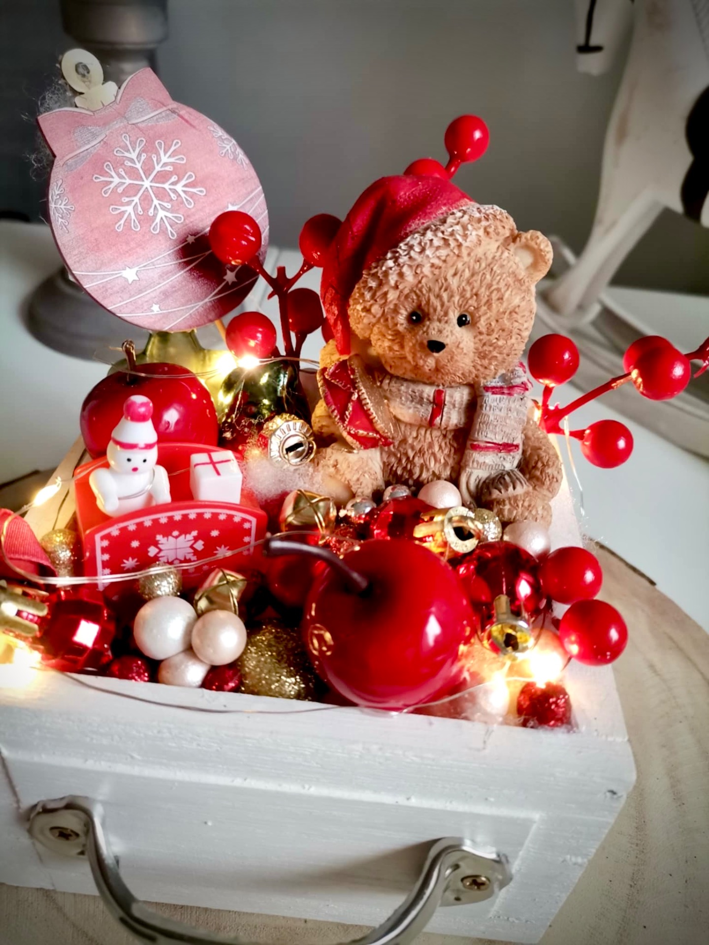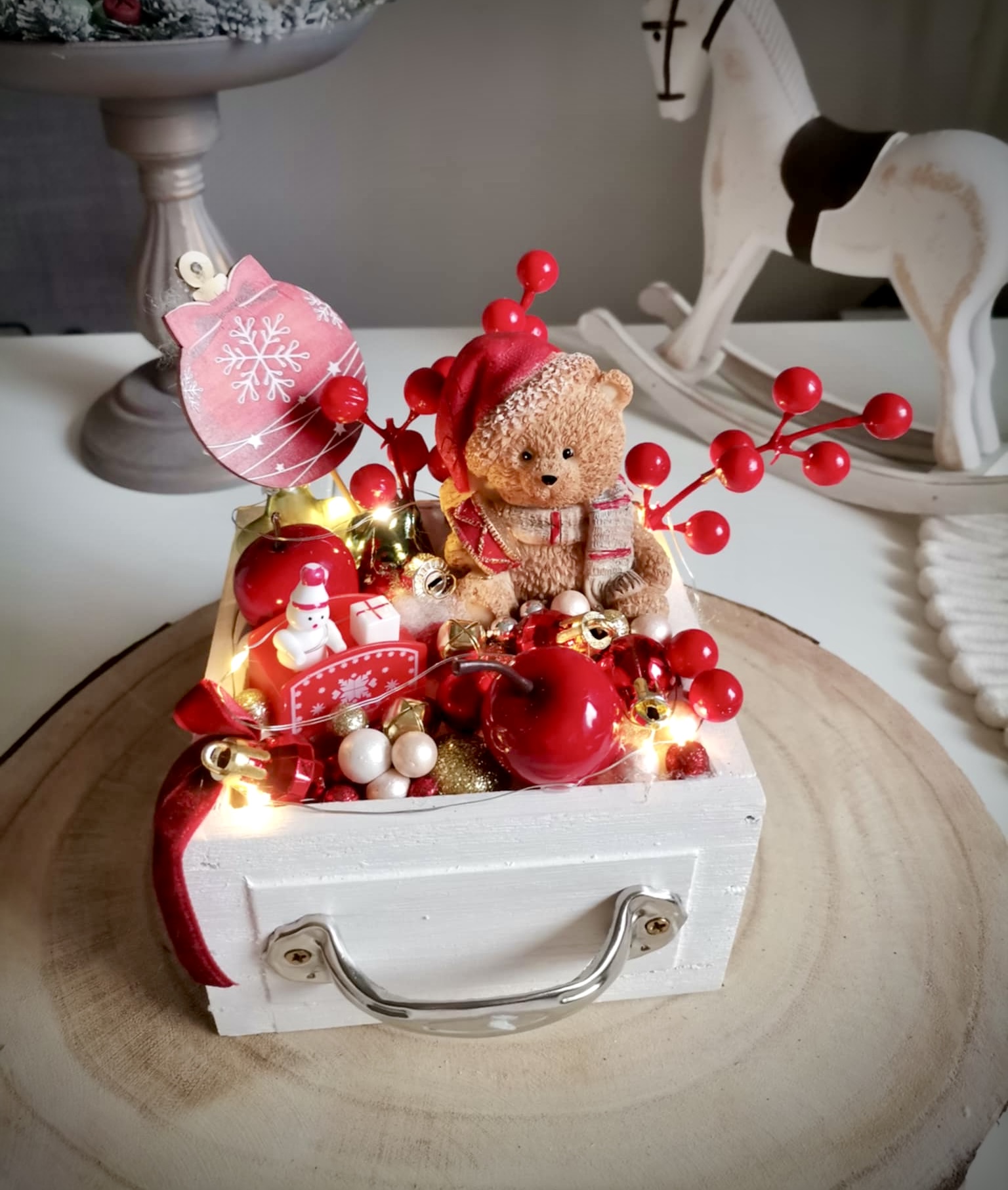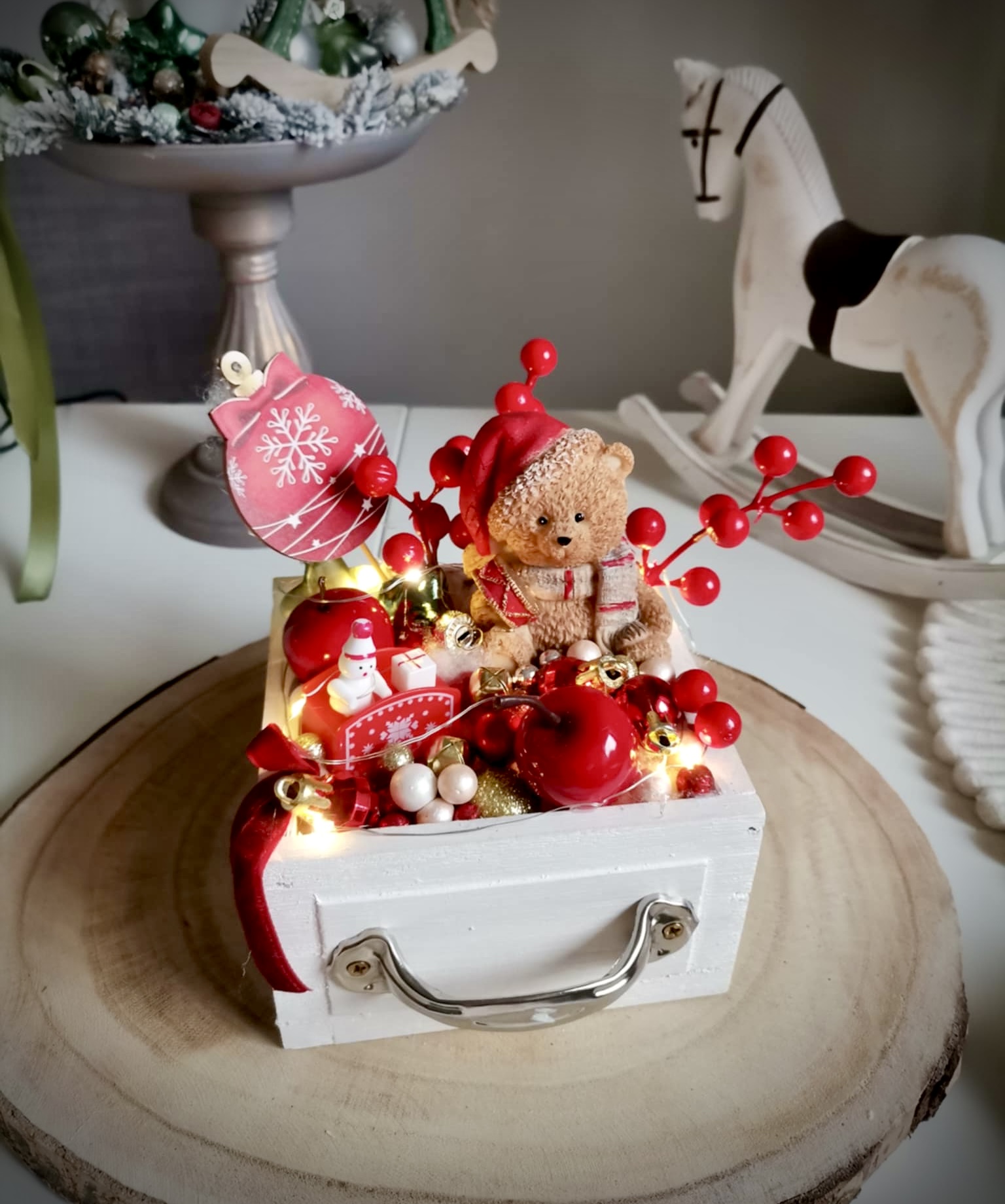 Különleges, karácsonyi hangulatú Mackó adventi. Vintage fiókban. A fiók méretei kb.13*14,5*7,5 cm. A világítás elemmel működik, 3 féle választható világítási móddal! Minden része maradandó! Vásárlás utàn emailben veszem fel a kapcsolatot a vásárlómmal!