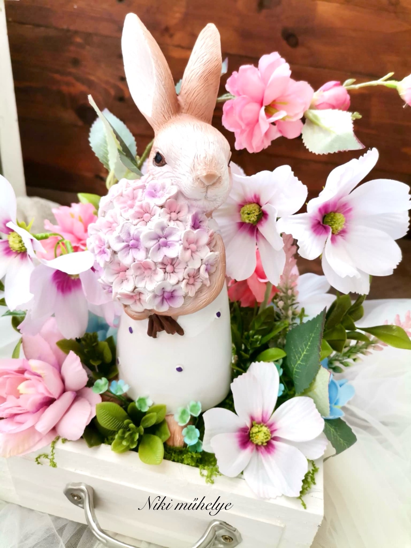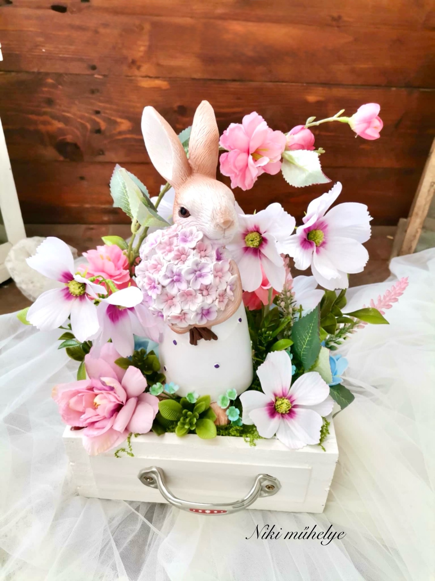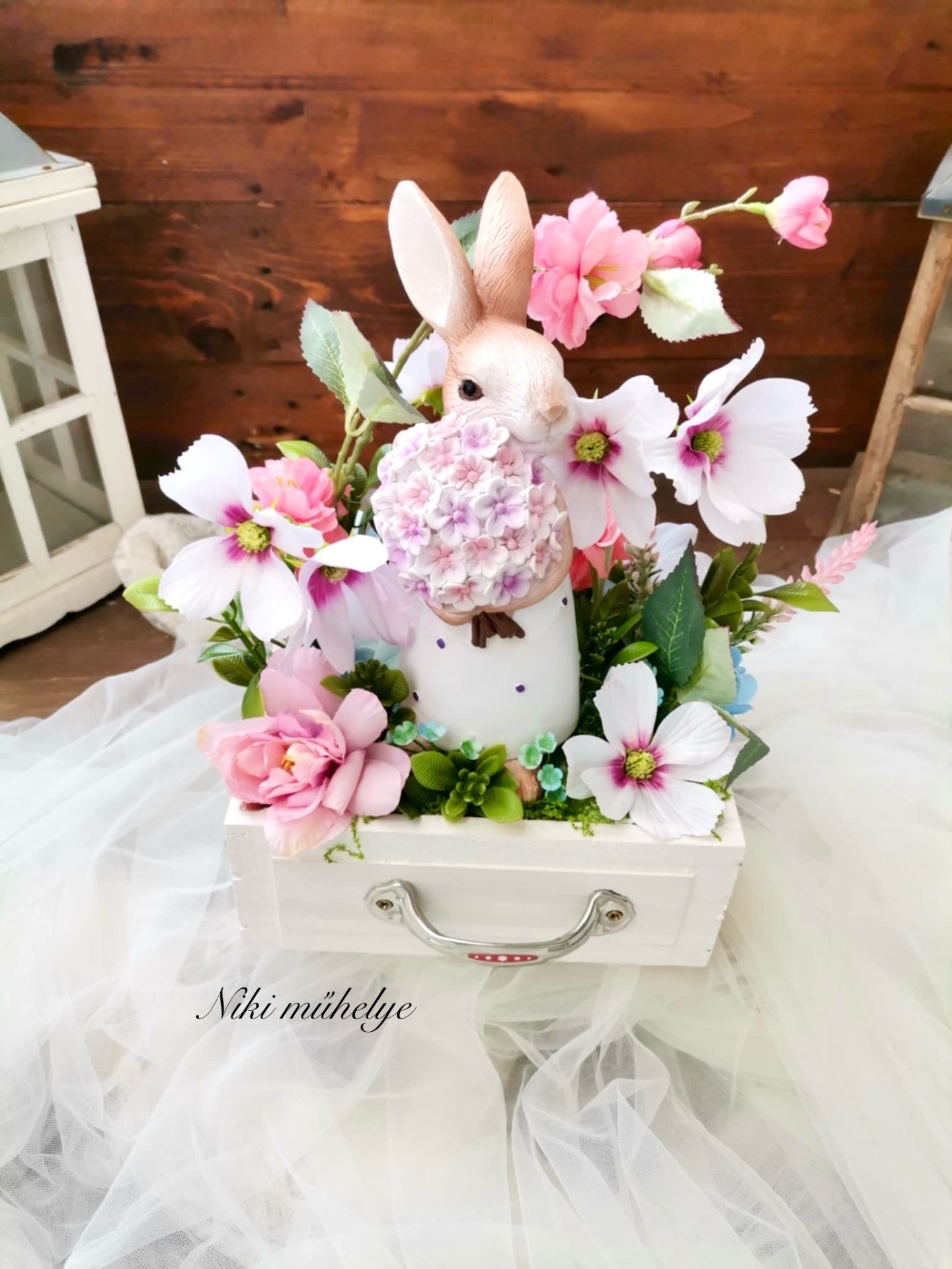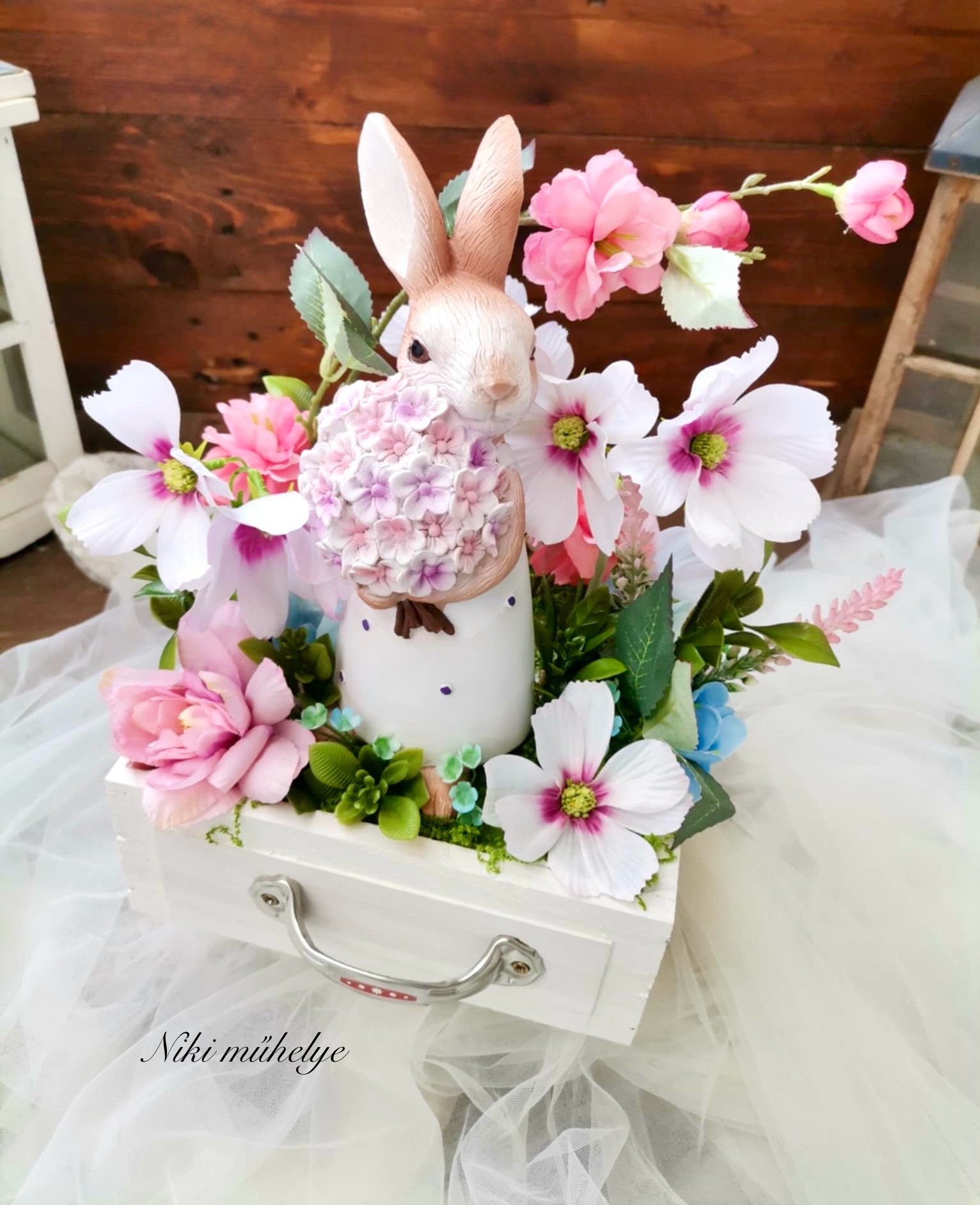 Különleges, tavaszi asztaldísz vintage fiókban.