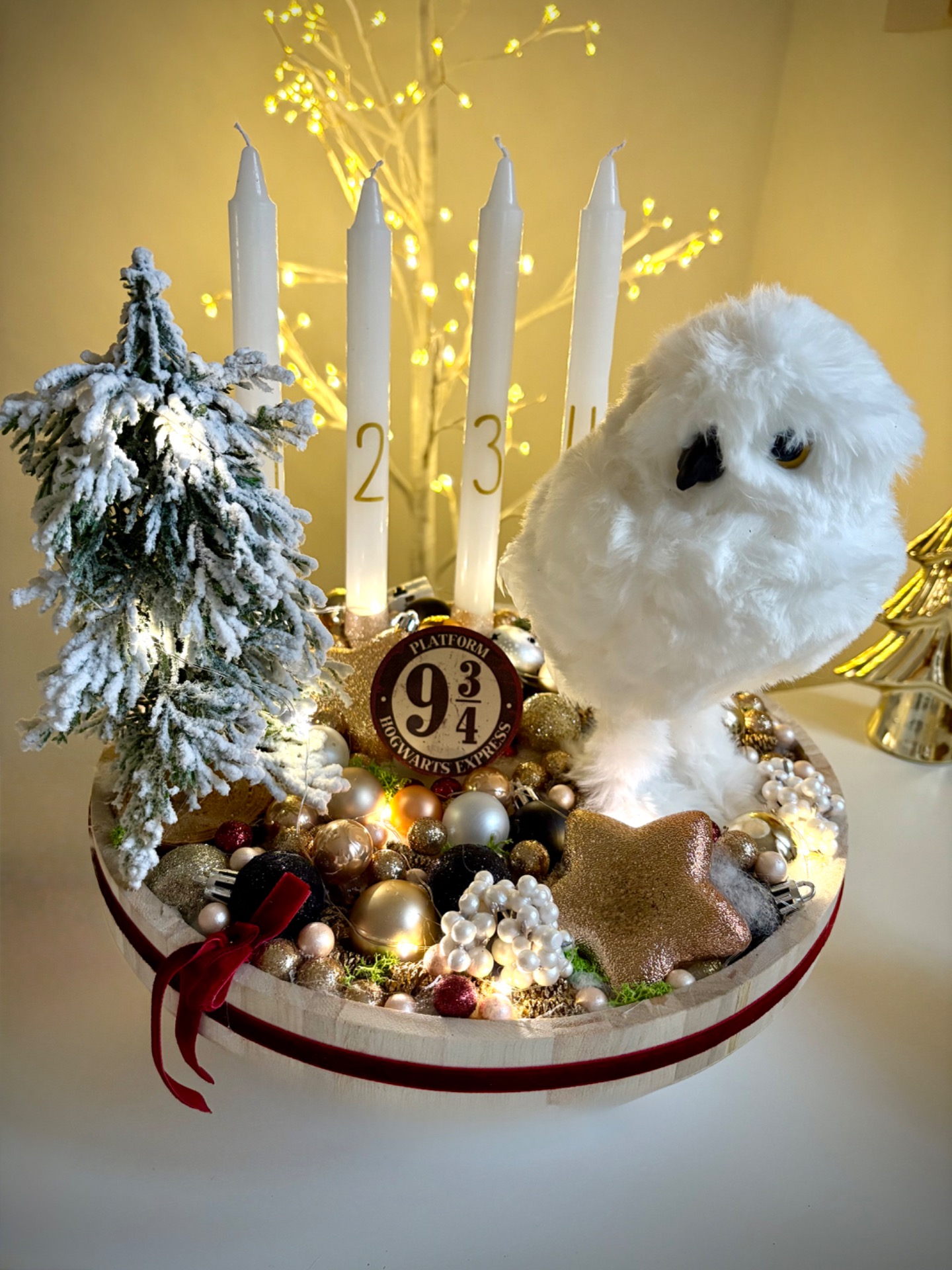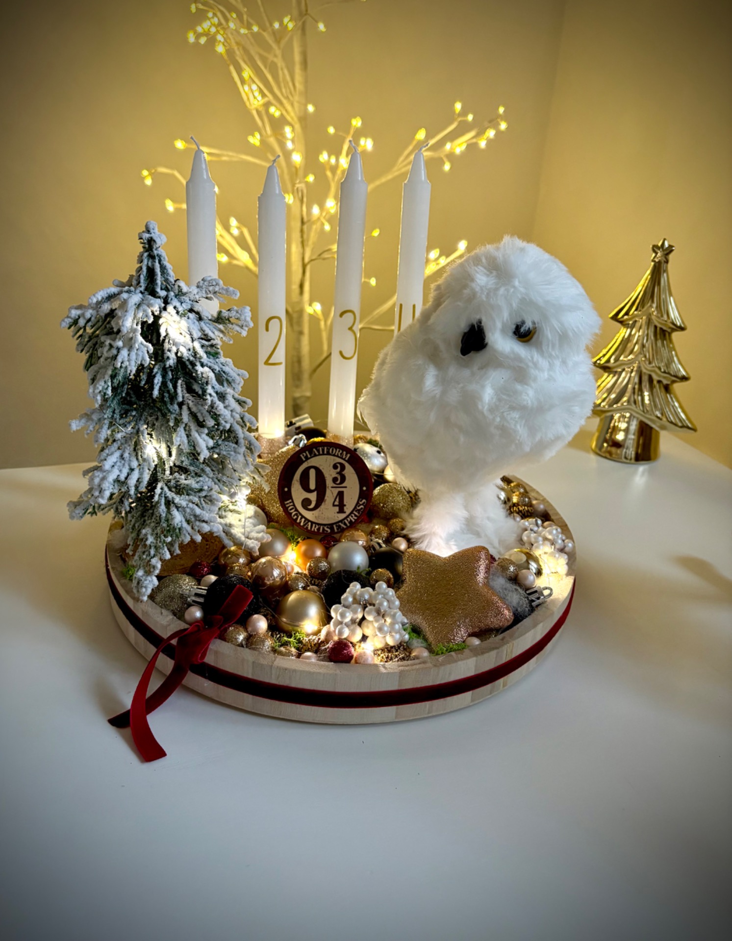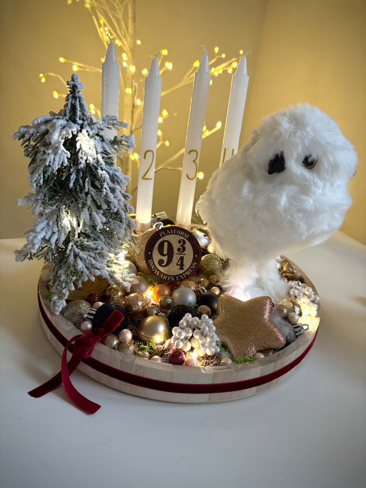 Az alap átmérője 30 cm. A gyertyákat gyertytüskékkel rögzítettem, így később cserélhető. Az dekoráció világítása elemmel működik, 3 féle valasztható világítási móddal!
