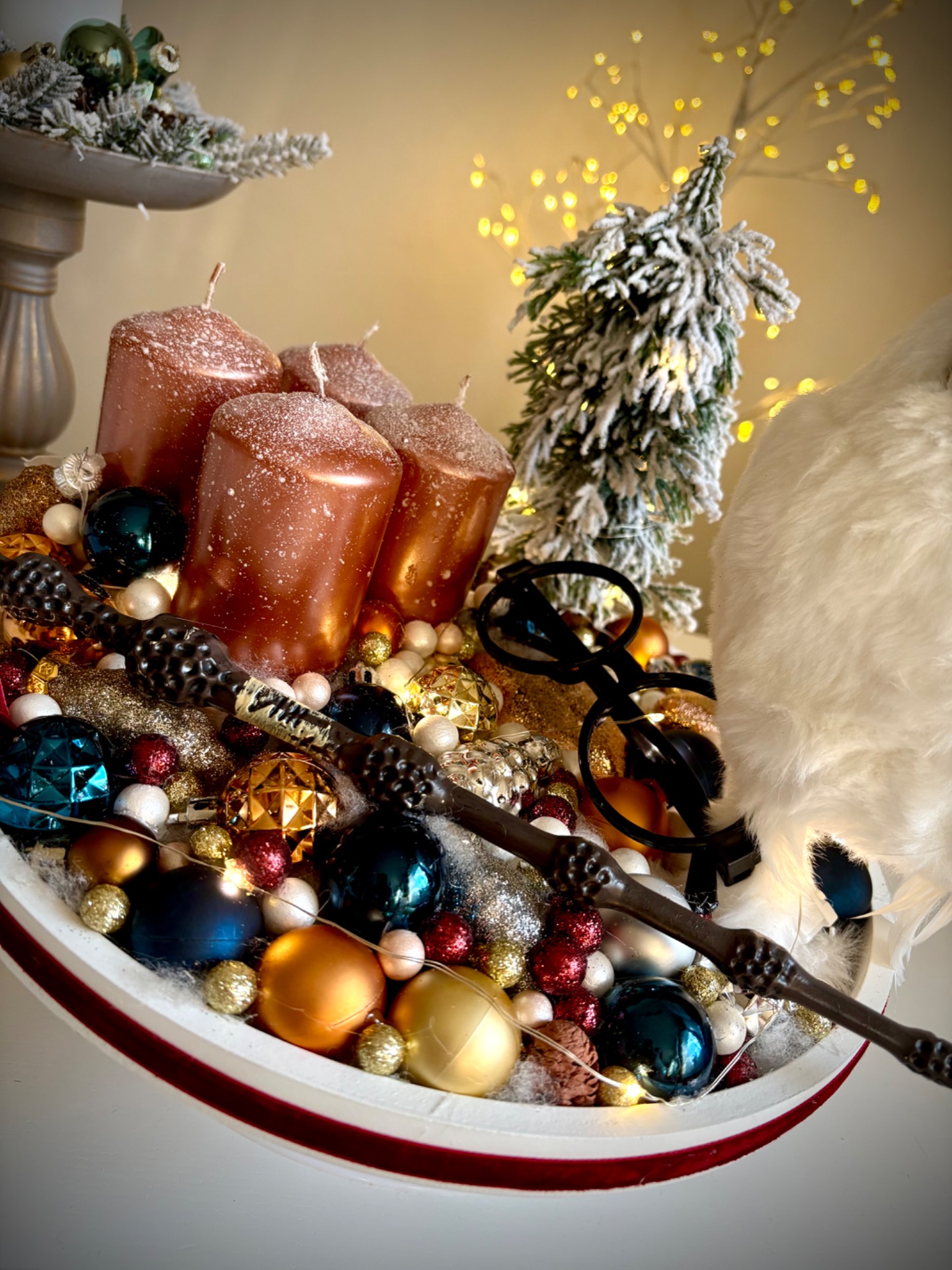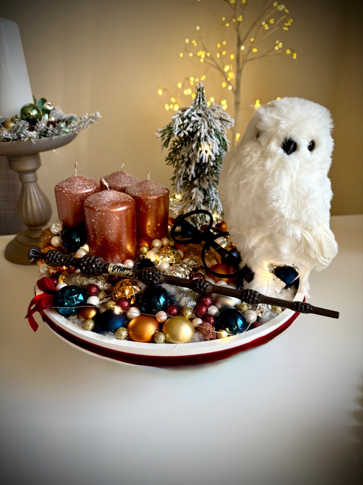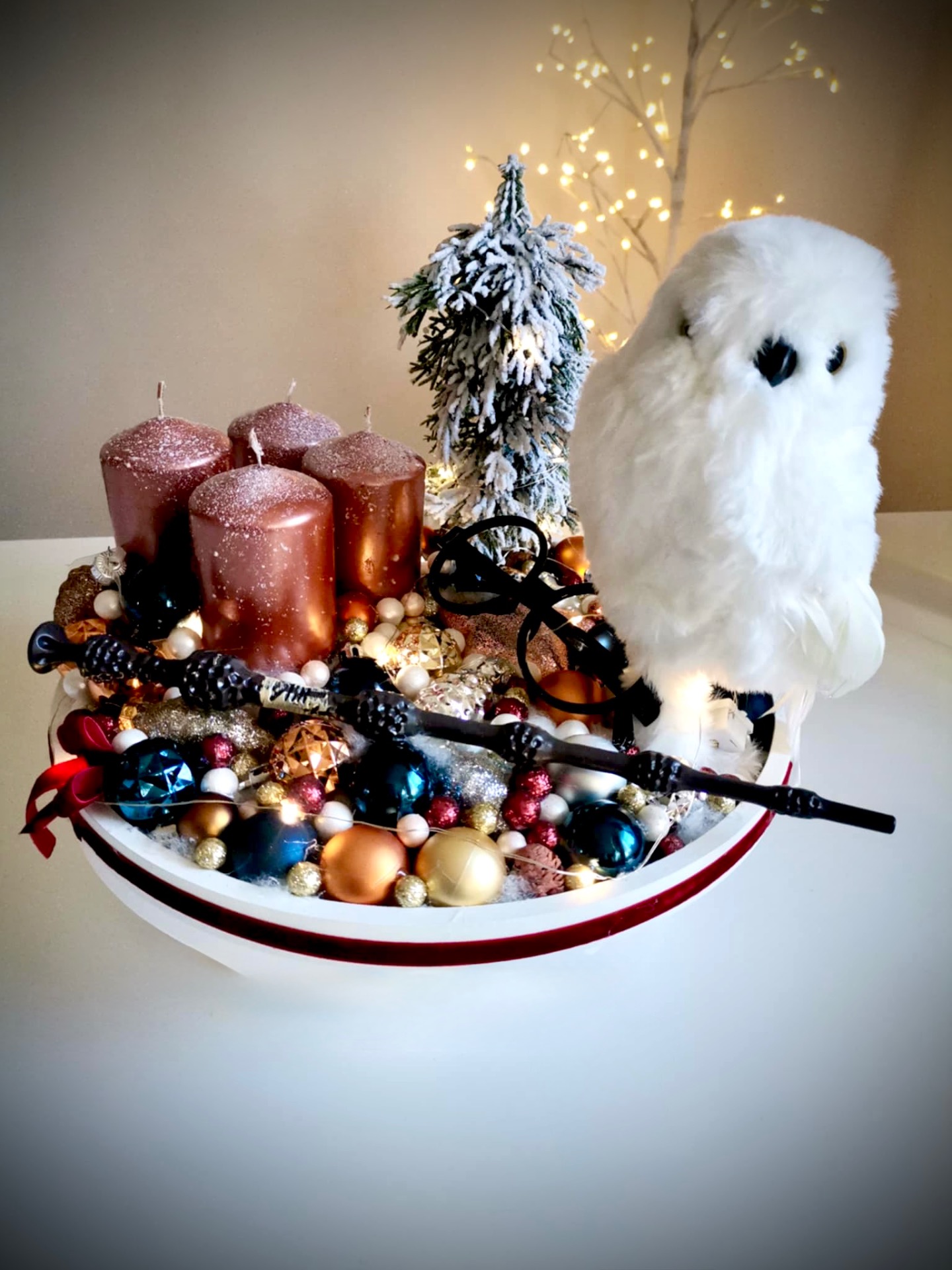 Az alap átmérője 30 cm. A gyertyákat gyertytüskékkel rögzítettem, így később cserélhető. Az dekoráció világítása elemmel működik, 3 féle valasztható világítási móddal!