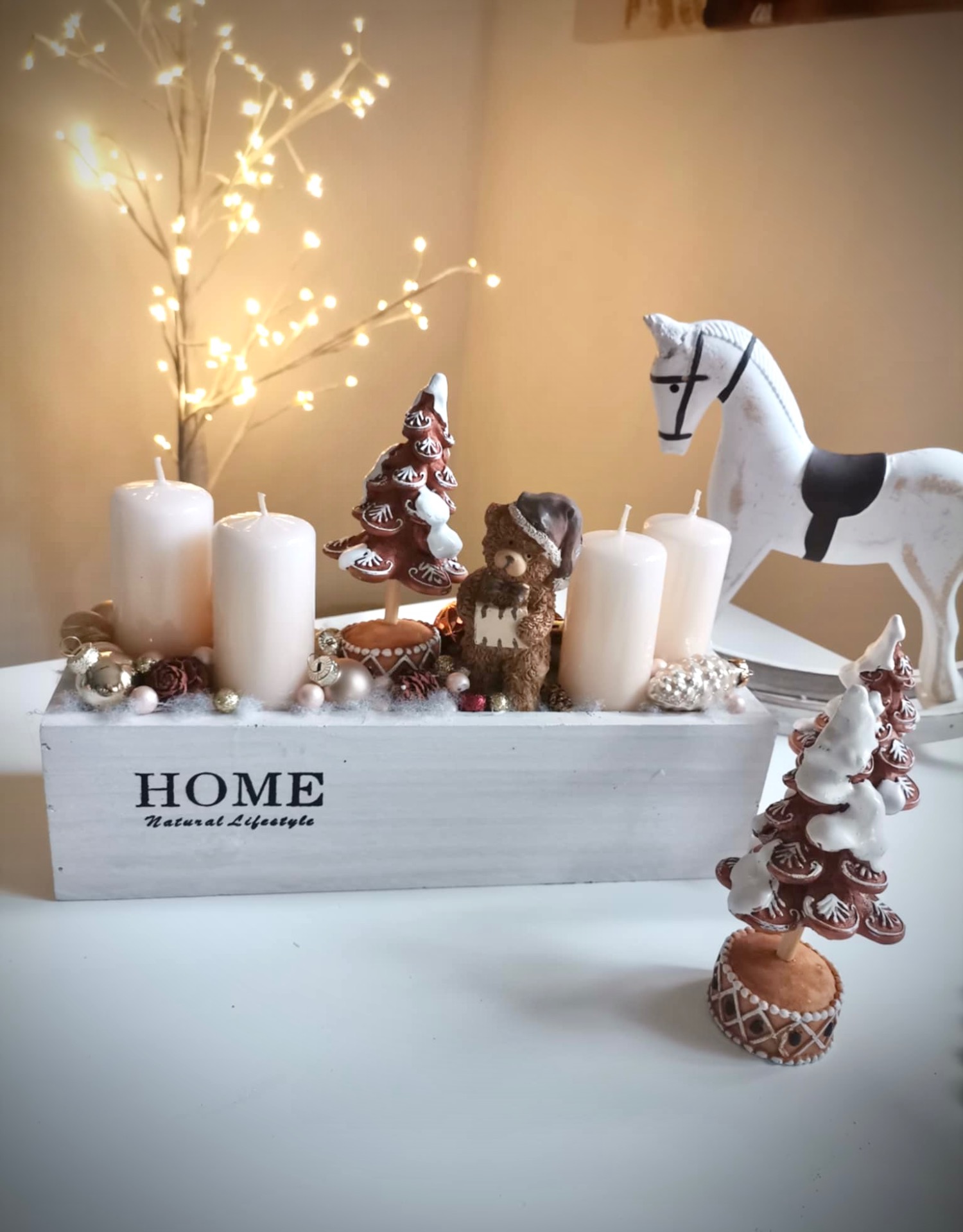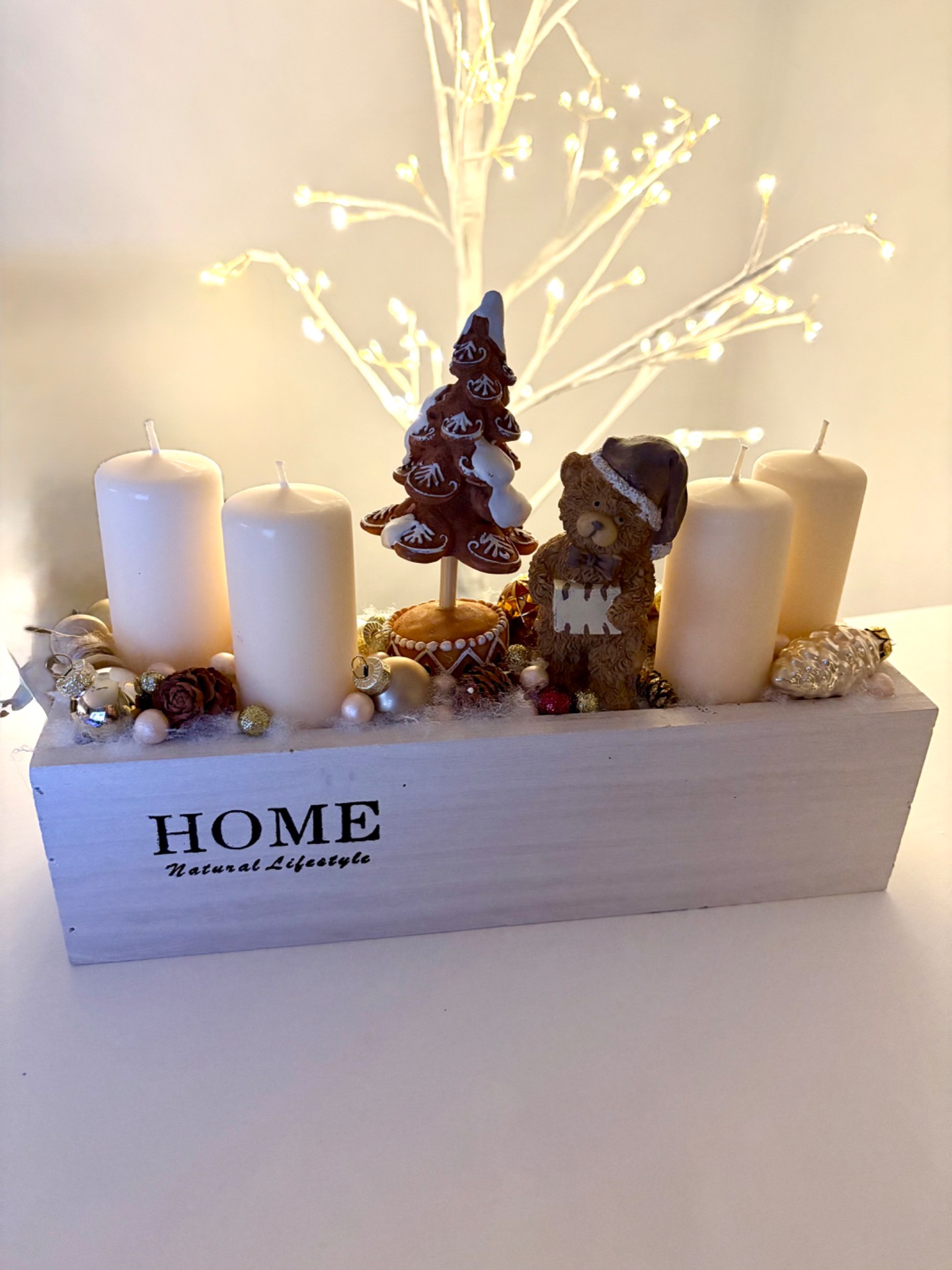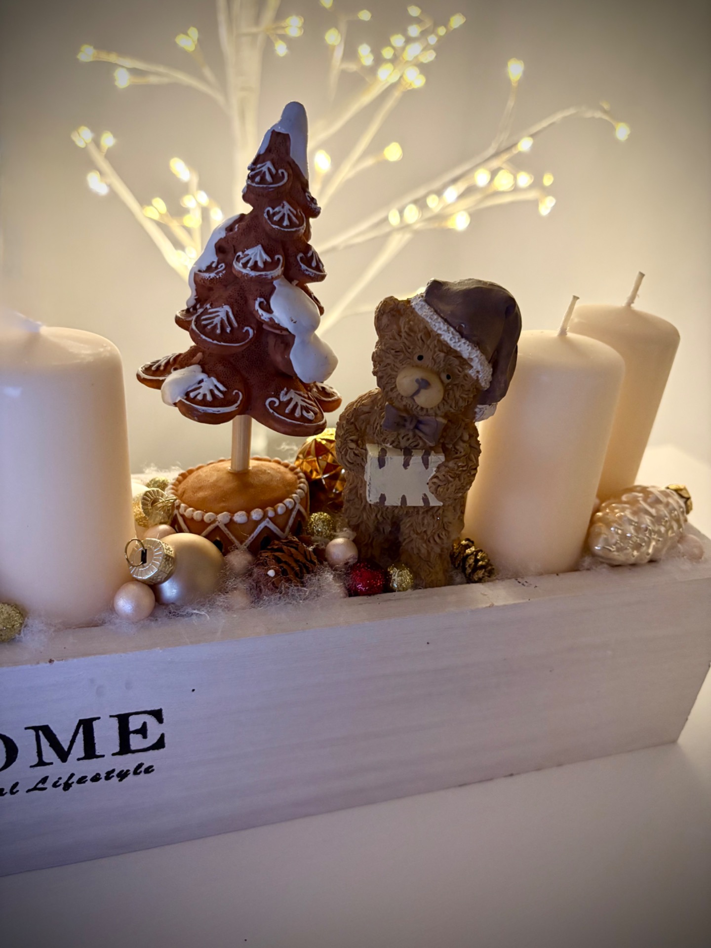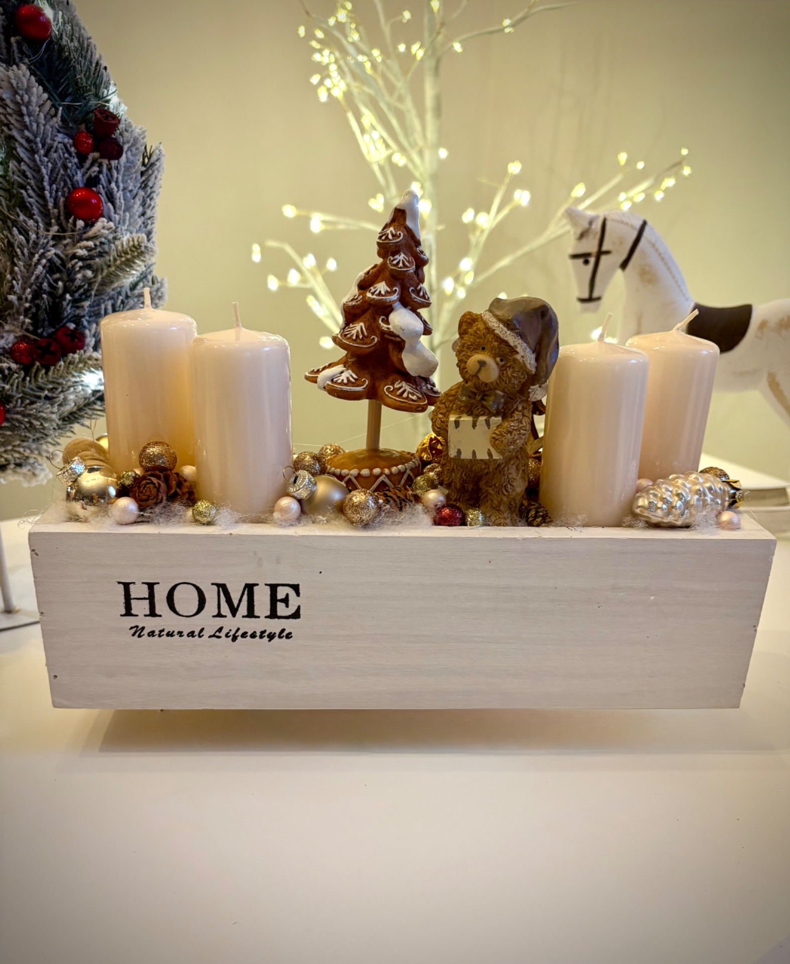 Fa ládikóban készült adventi dekoráció.