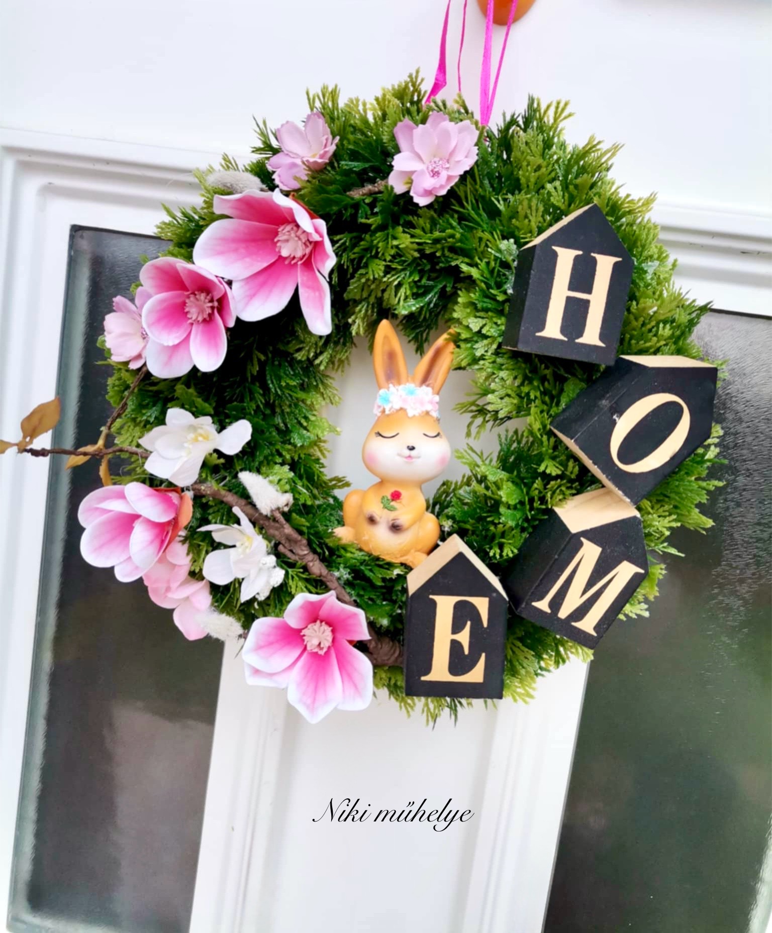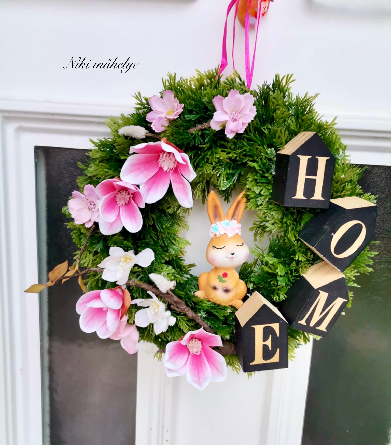 Tuja alapon készült ajtódísz. Az alap átmérője 25 cm, ezt építettem be. Selyemvirágokkal, minőségi magnóliával, pozsgás zöldekkel dolgoztam. Minden része maradandó!