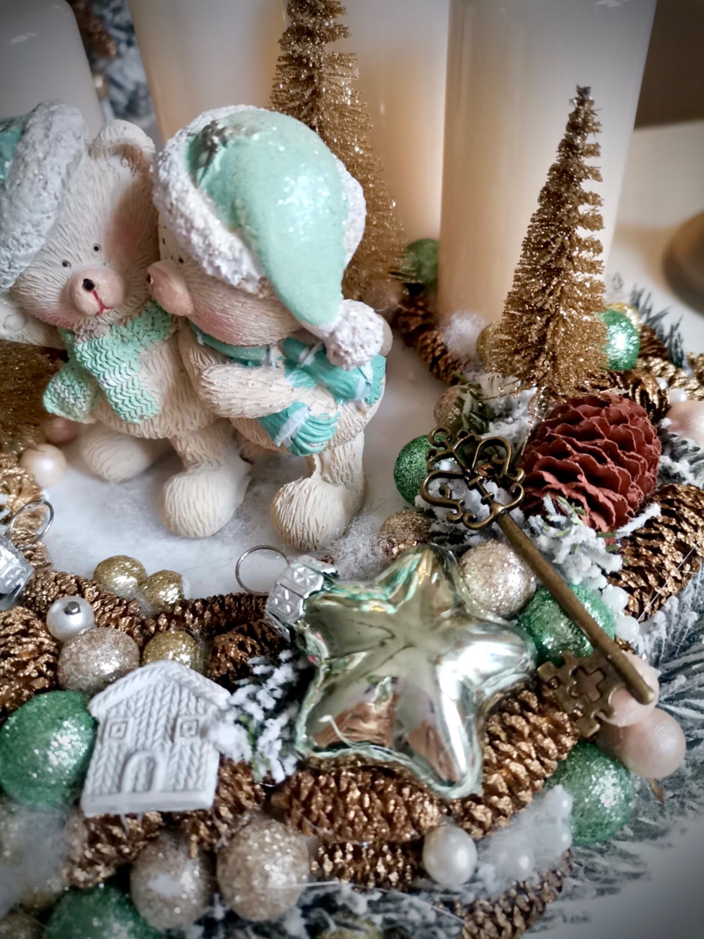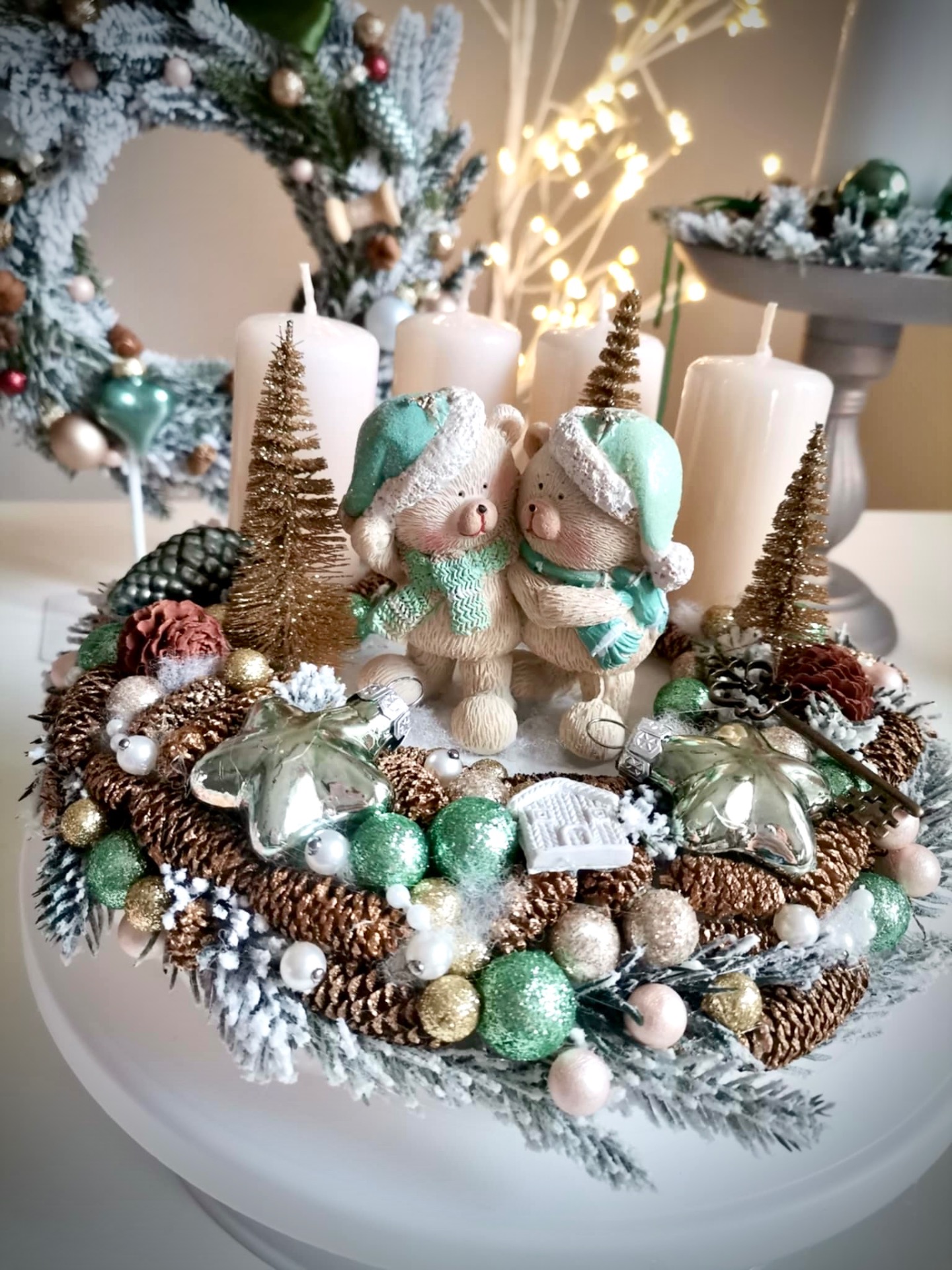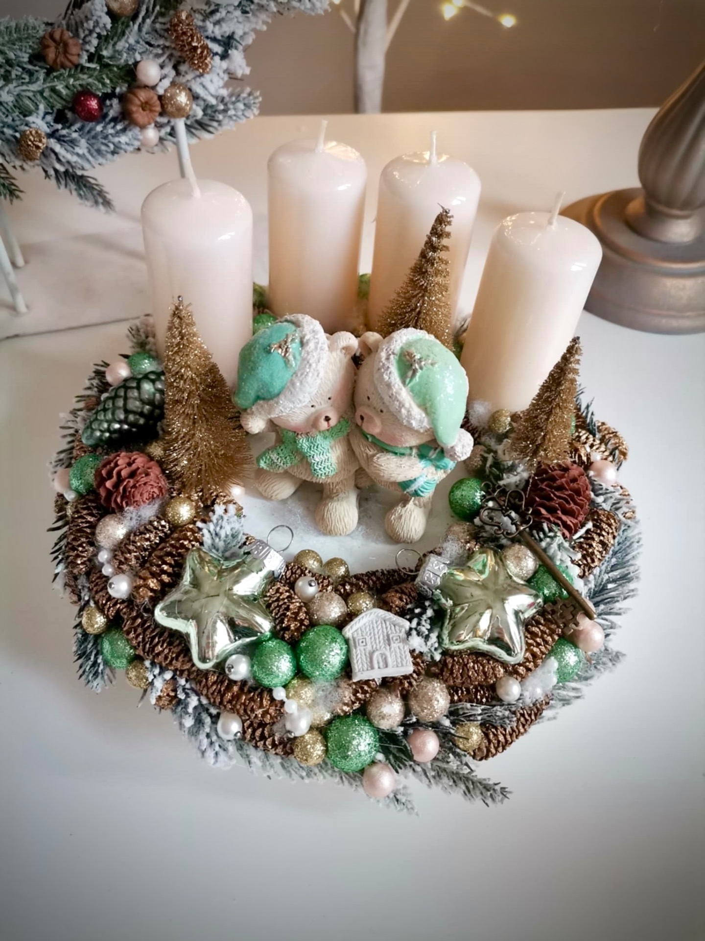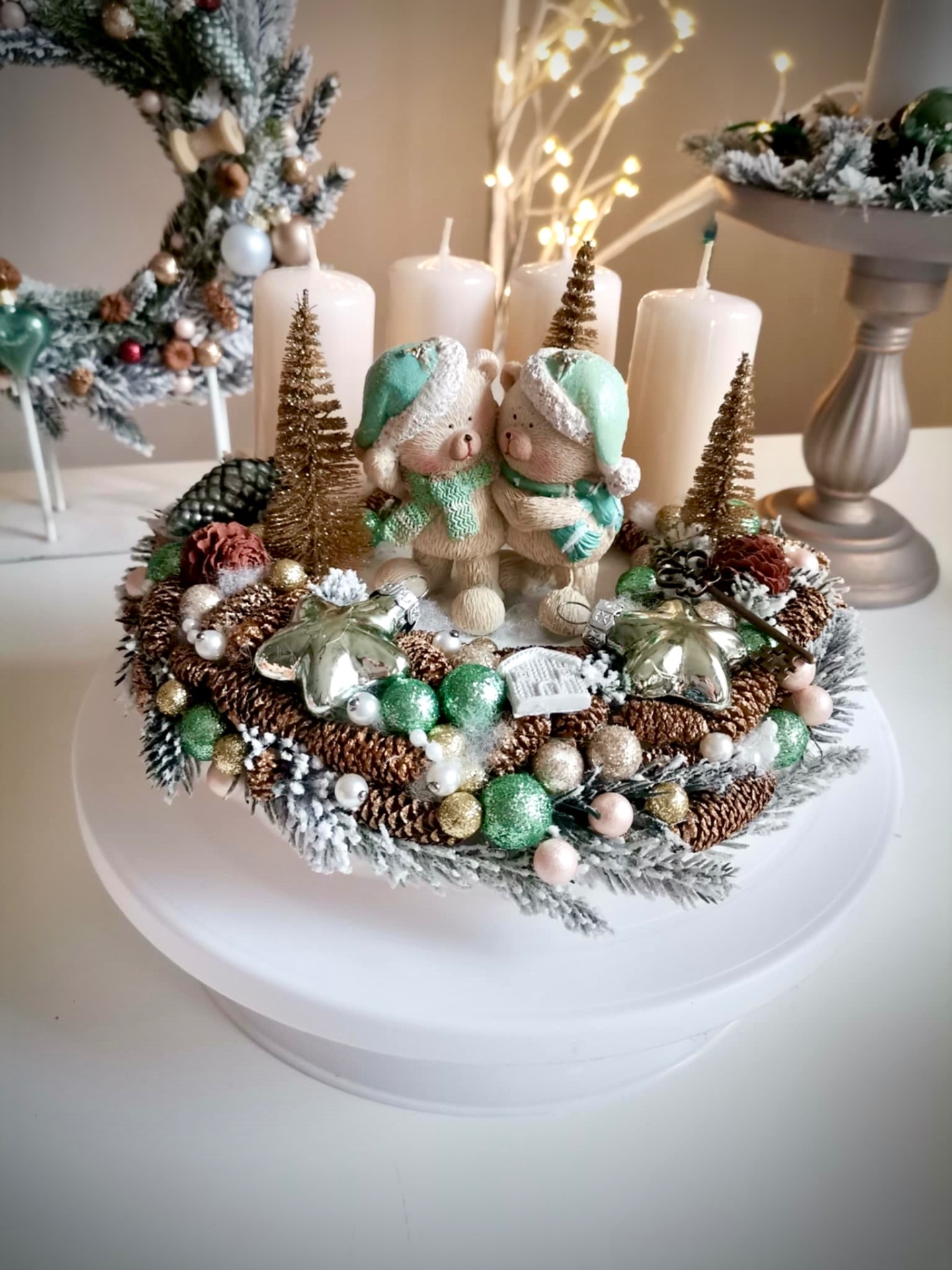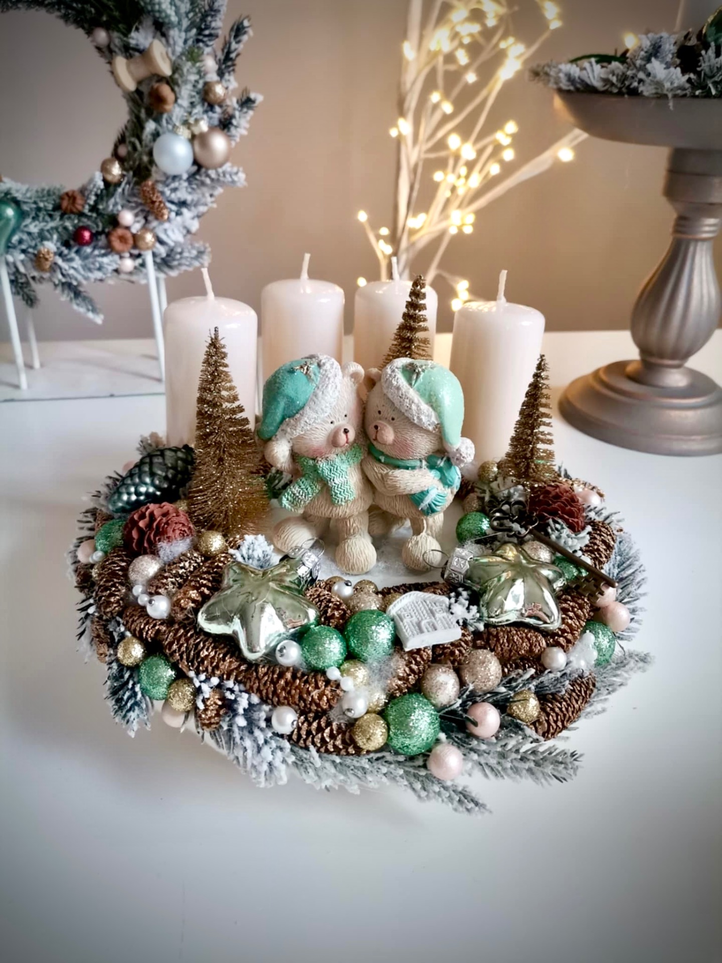 Letisztult, menta színekben készült adventi koszorú. 20 centis alappal dolgoztam, plüssel vontam be.