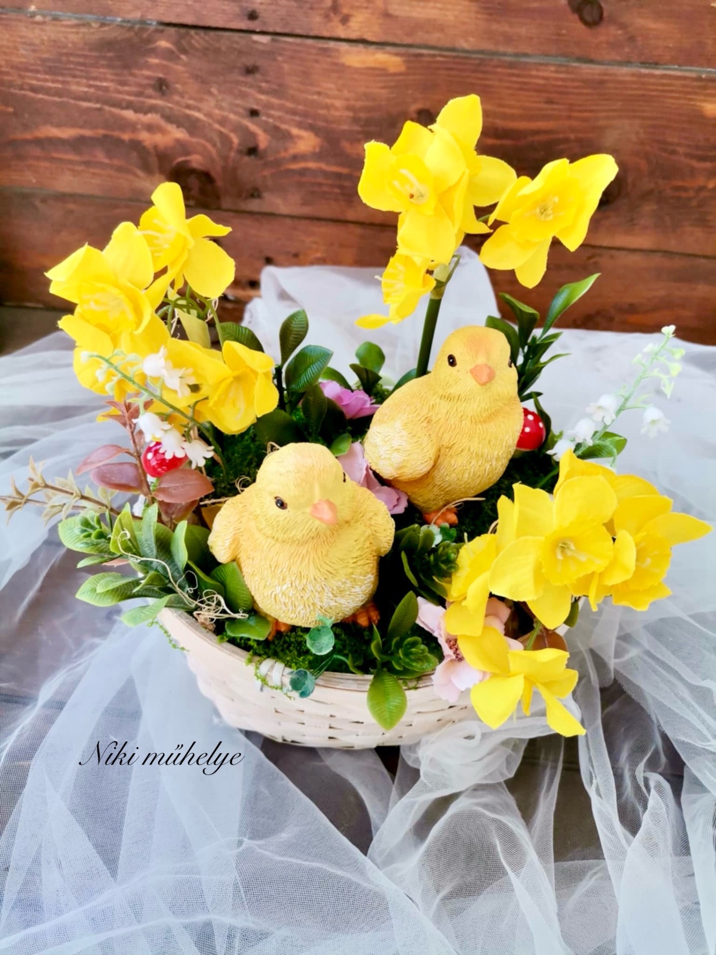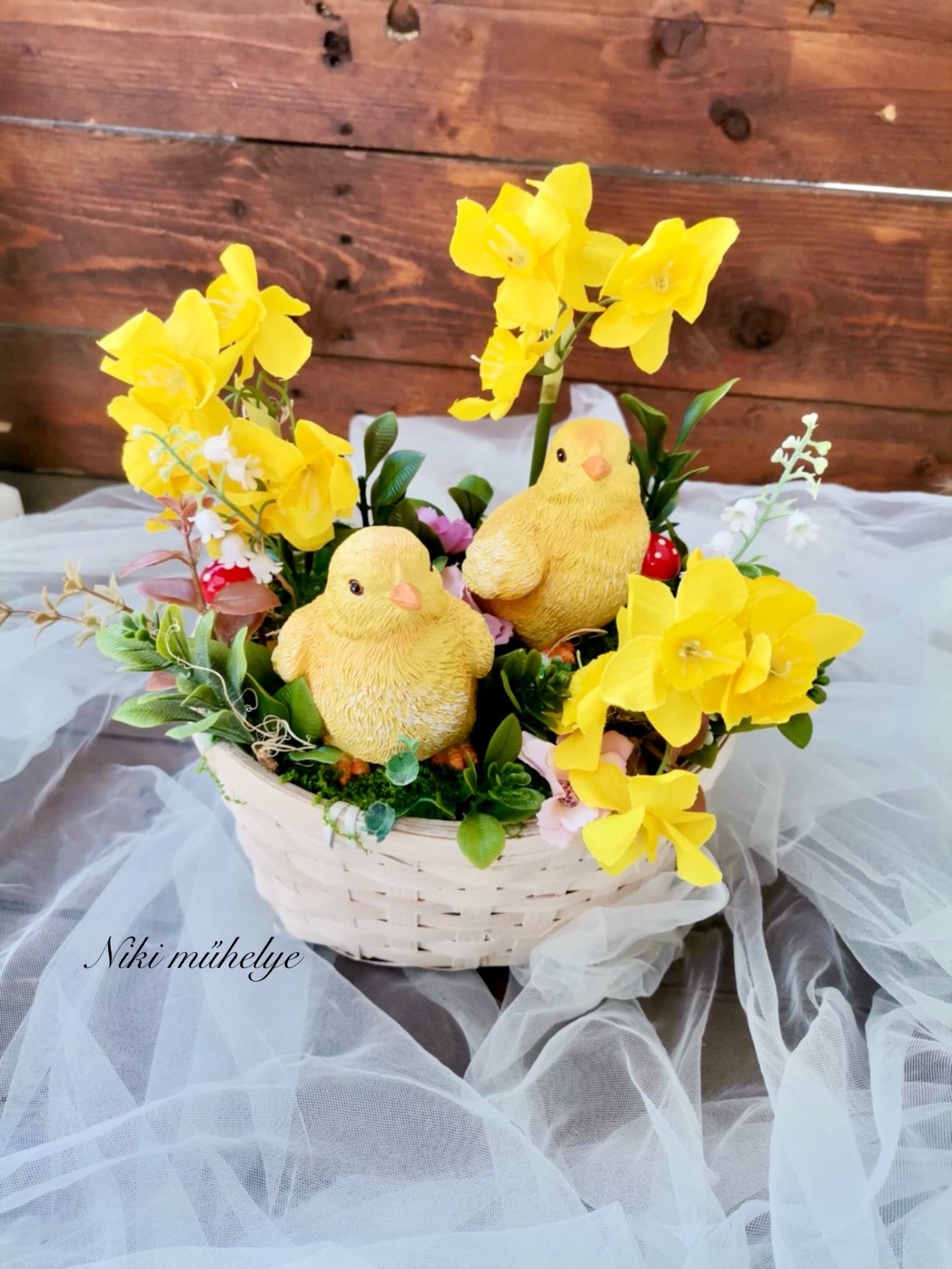 Különleges, tavaszi asztaldísz bambusz kosárban.