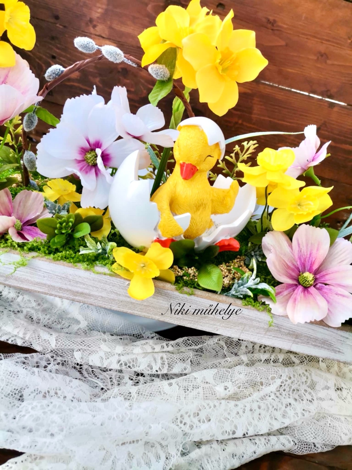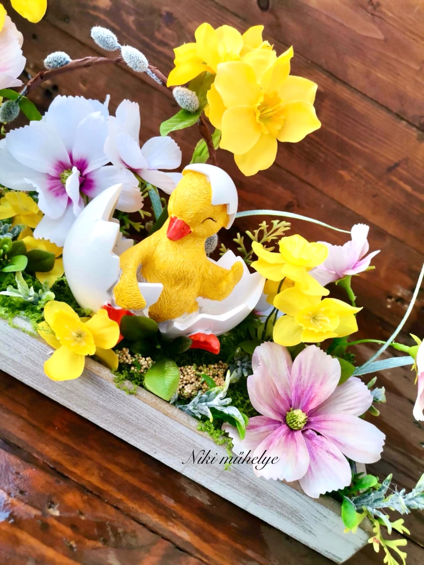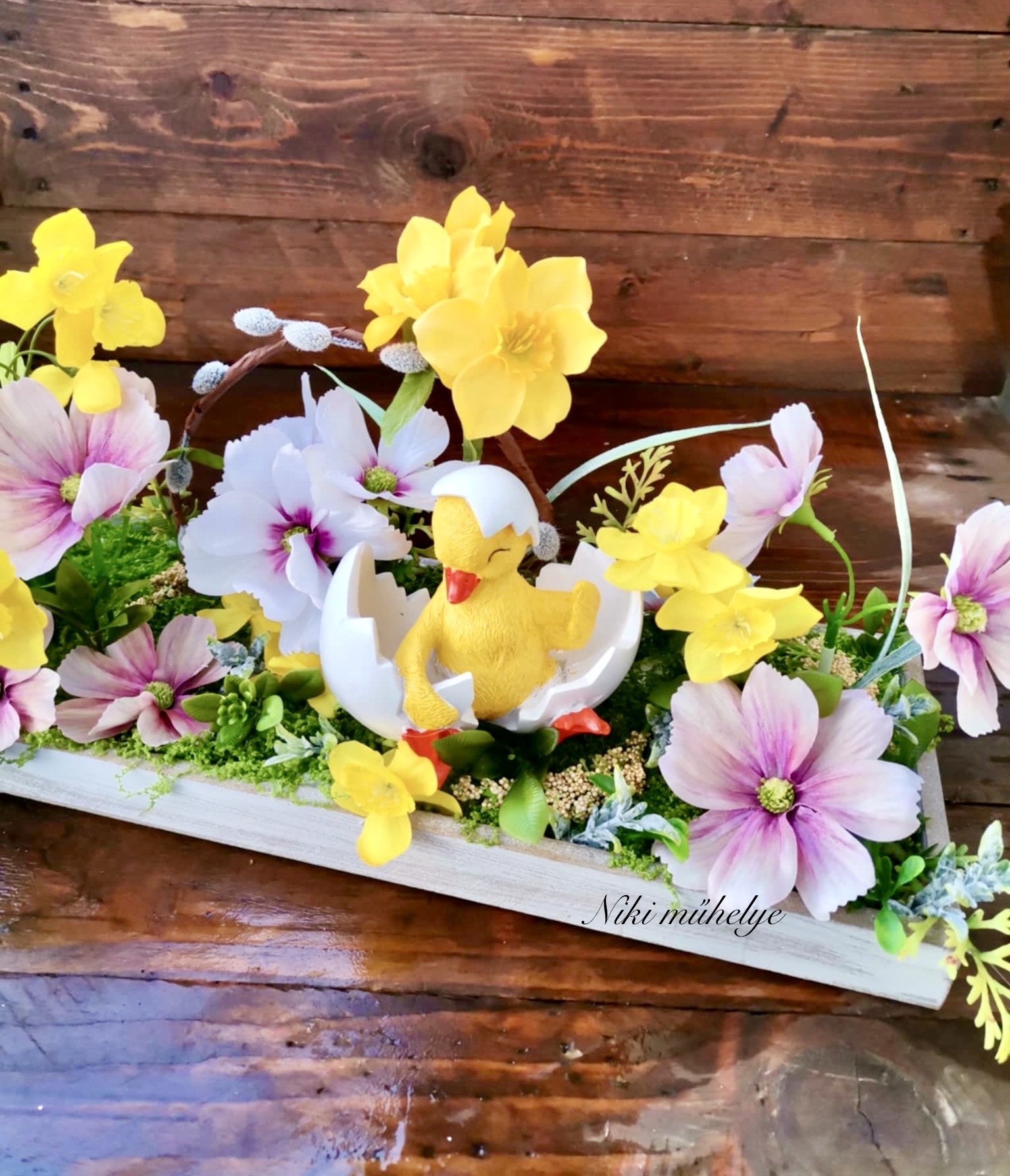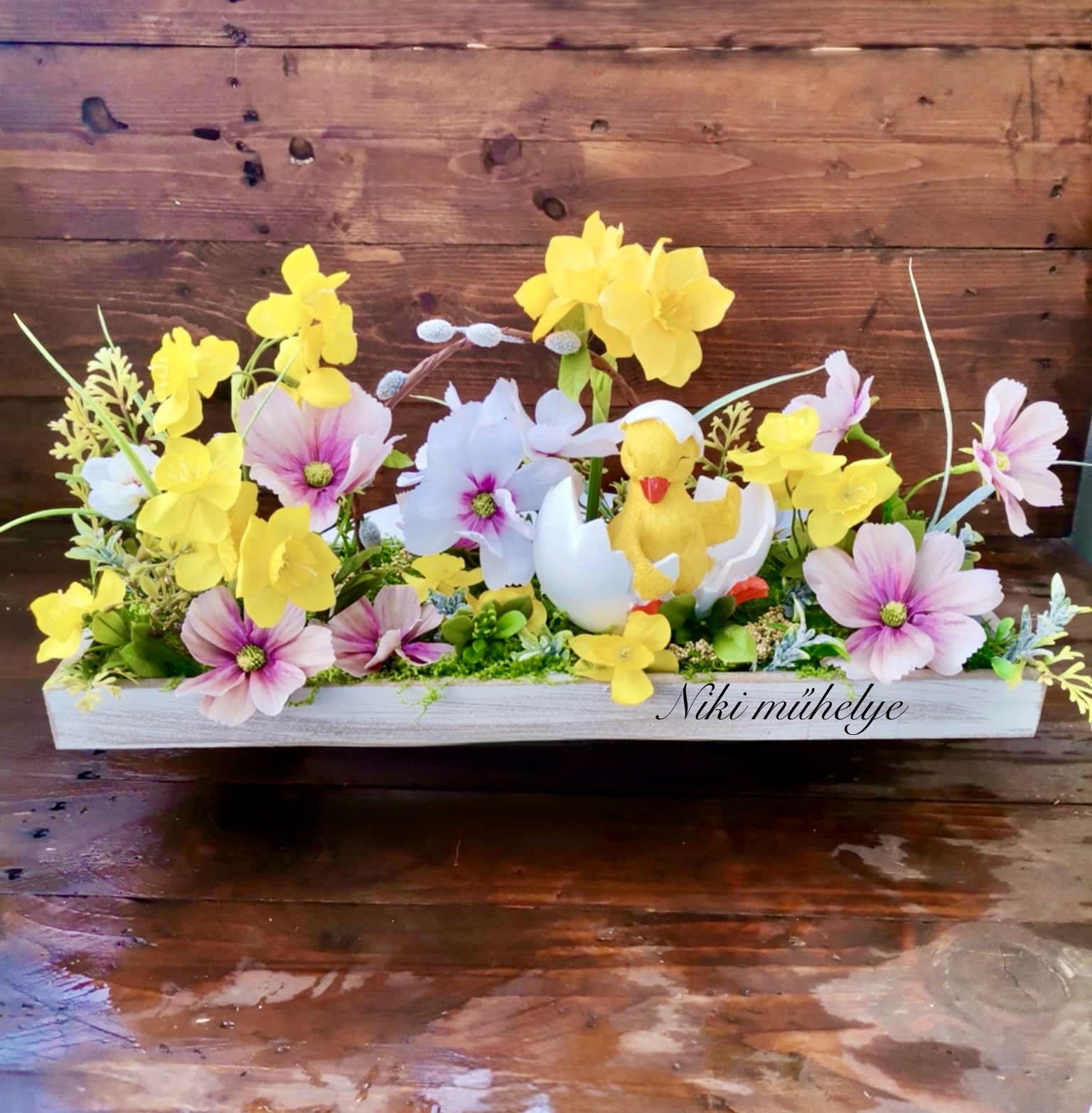 A láda hossza 40 cm. Minőségi nárciszokkal, pillangóvirágokkal, barkàval és pozsgás zöldekkel dolgoztam.