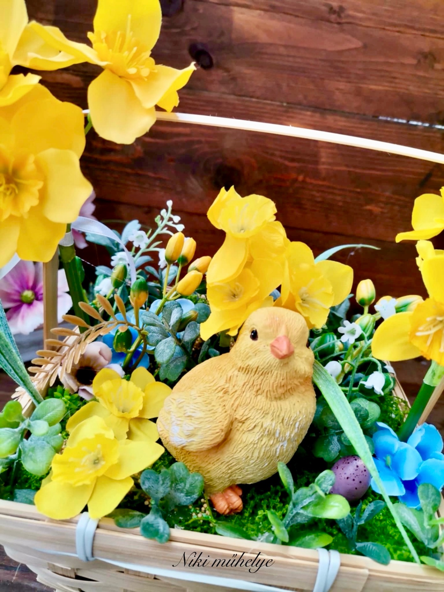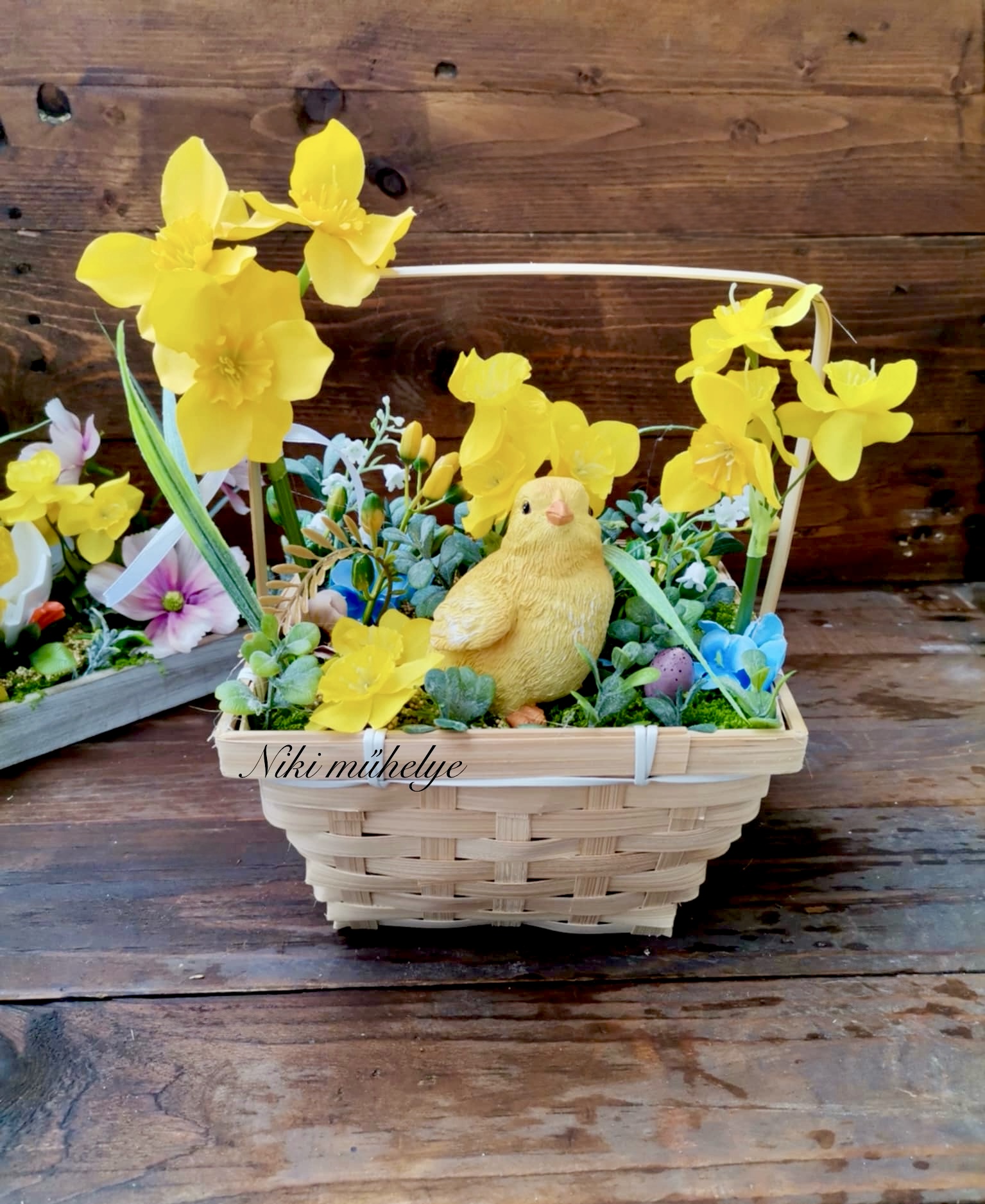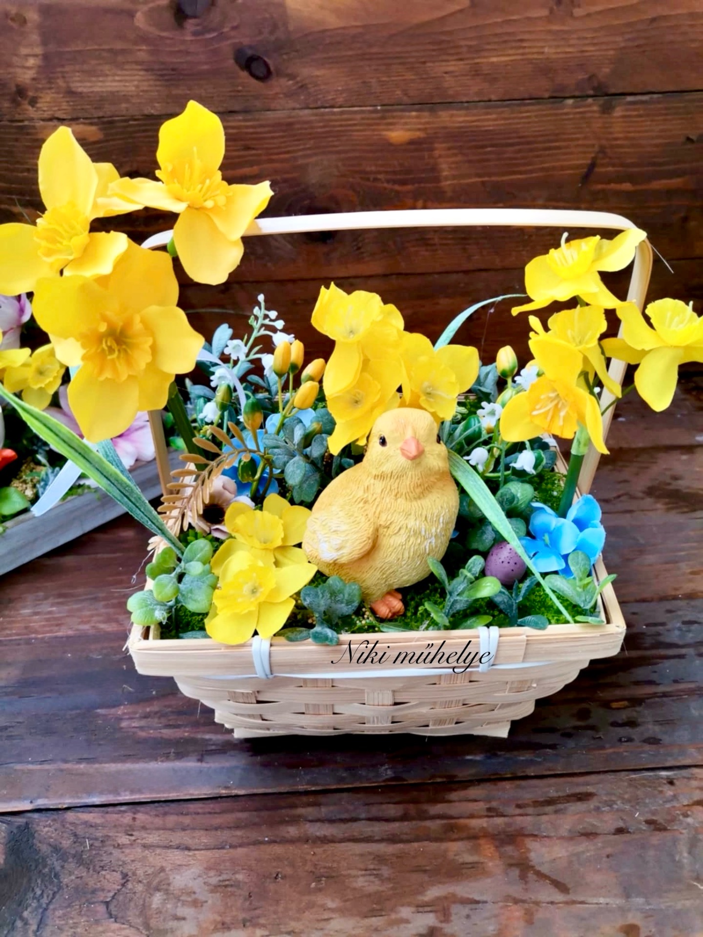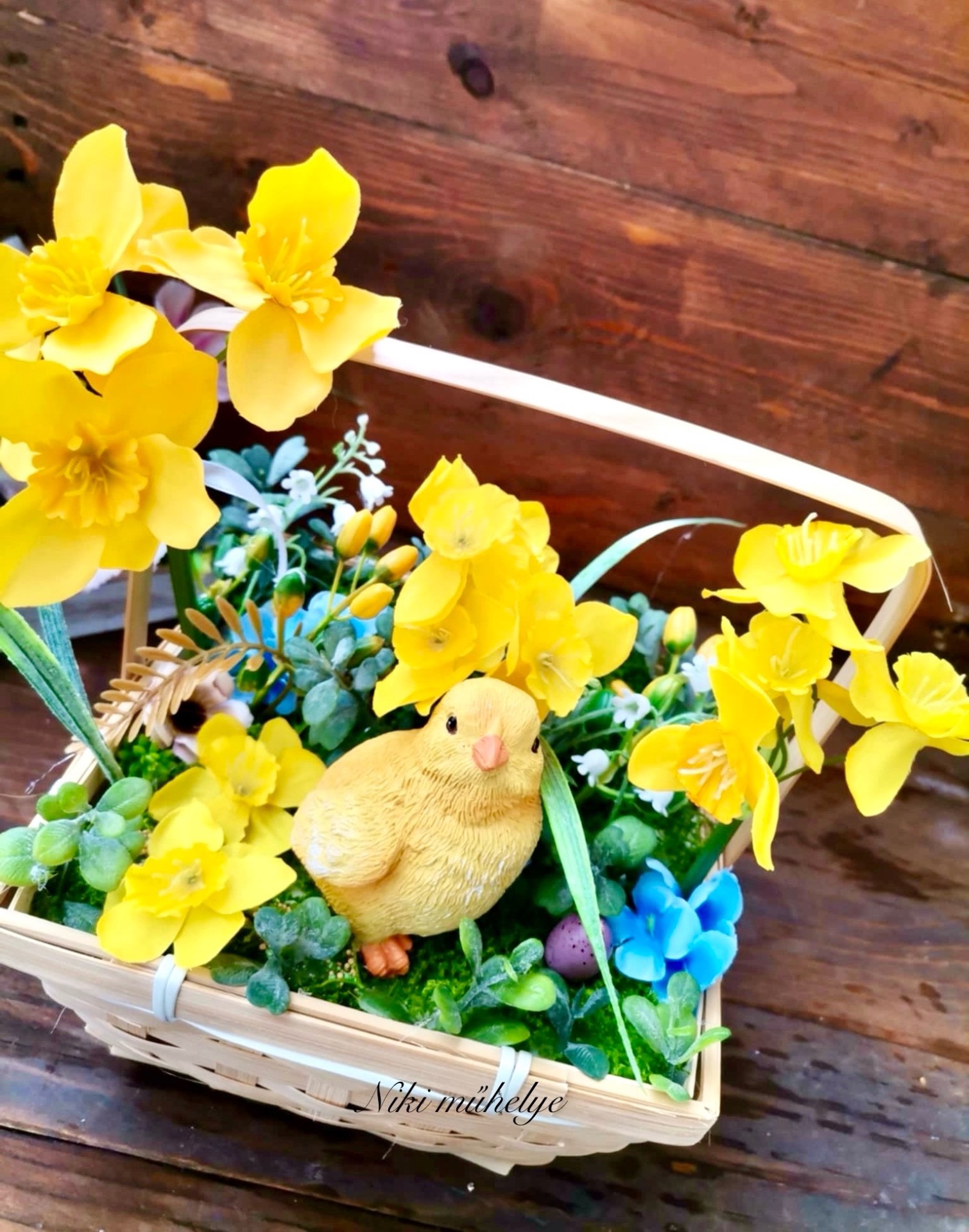Fonott bambusz alapban készült tavaszi dekoráció. Kosár alapja kb.18*18*11 cm, kész termék magassága kb 25 cm. Élethű nárciszokkal, pozsgázs zöldekkel és bogyókkal dolgoztam.Minden része maradandó!