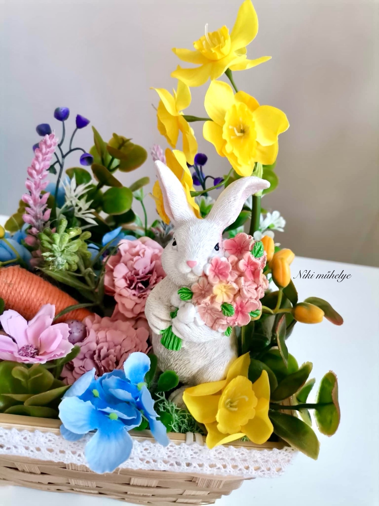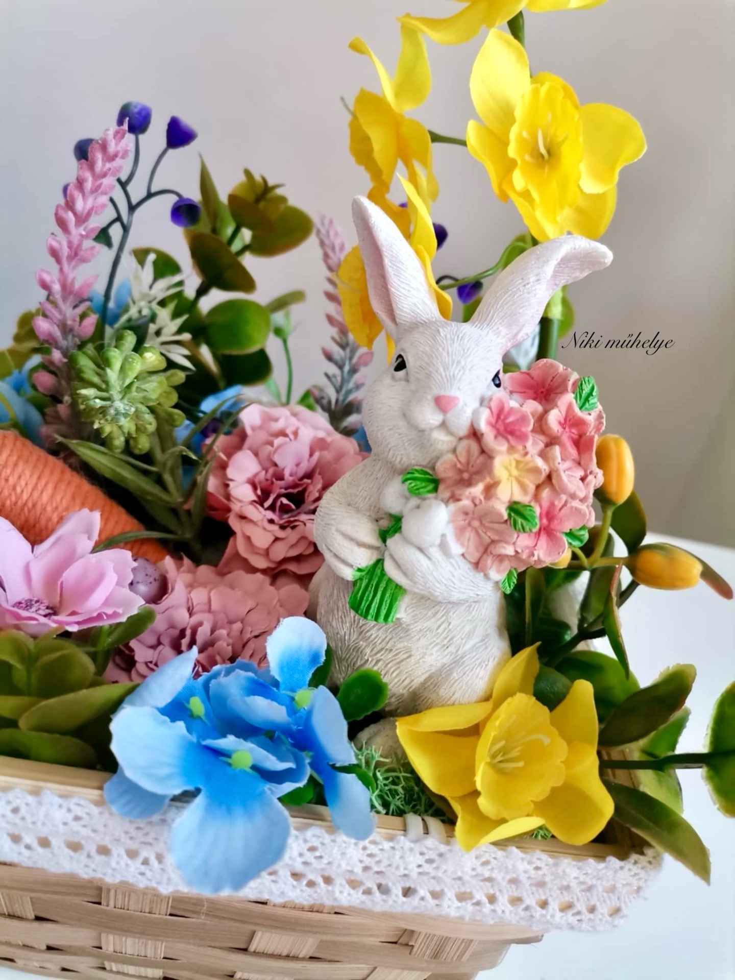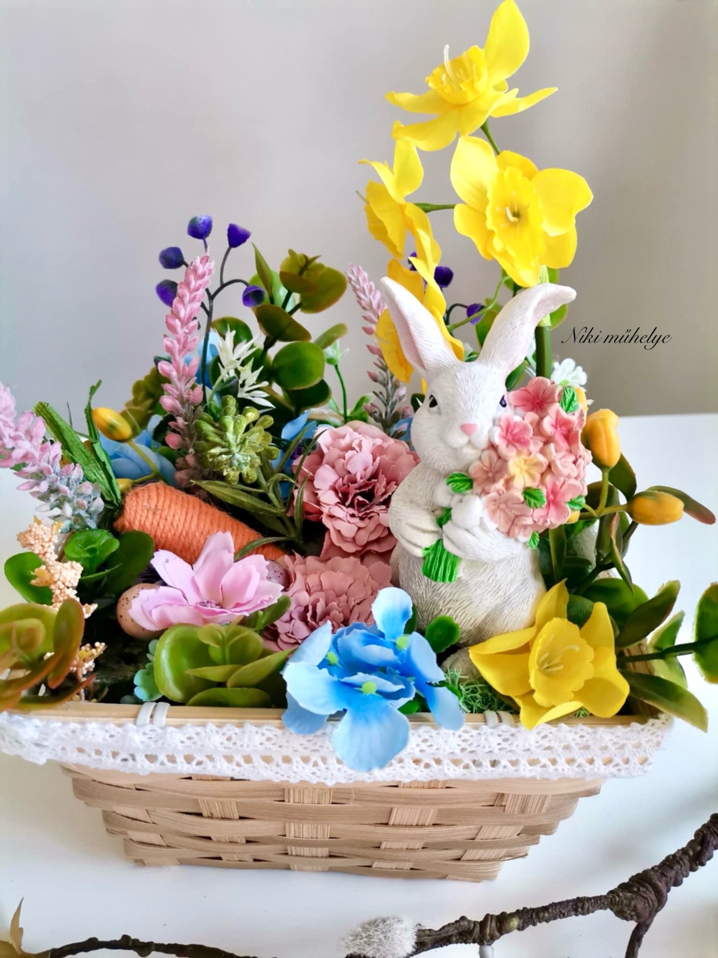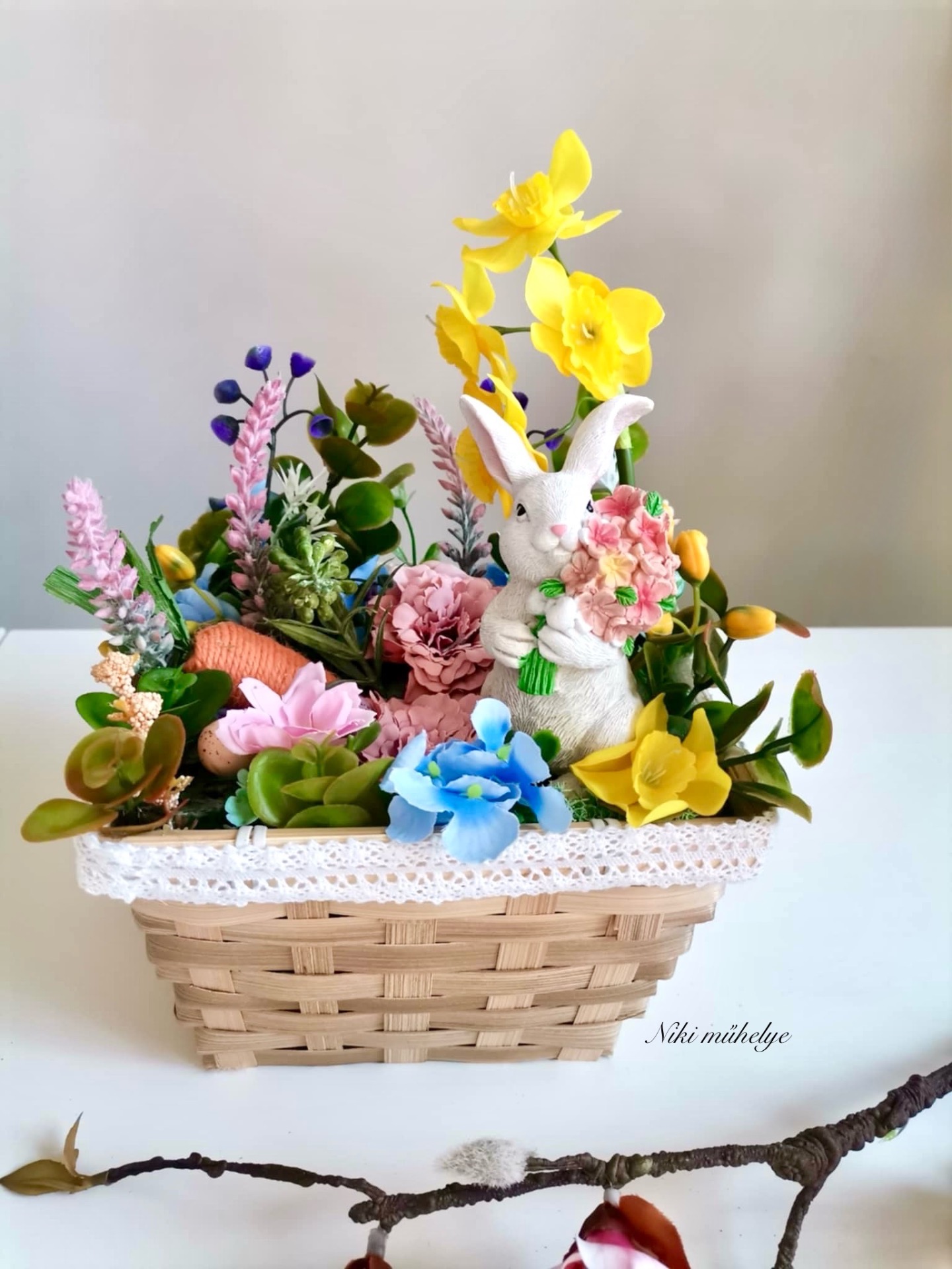 Fonott bambusz alapban készült tavaszi dekoráció. Kosár alapja kb.18*18*11 cm, kész termék magassága kb 25 cm. Élethű magnóliával, levendulával, pozsgázs zöldekkel és bogyókkal dolgoztam.Minden része maradandó!