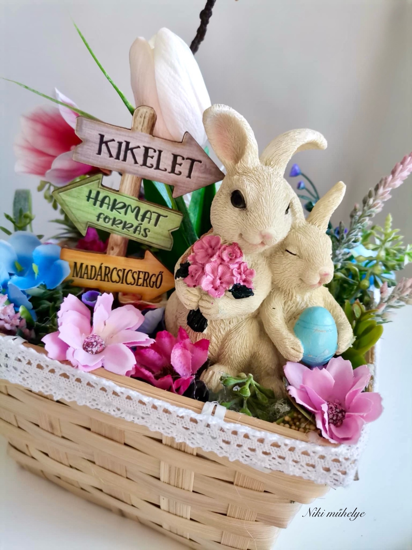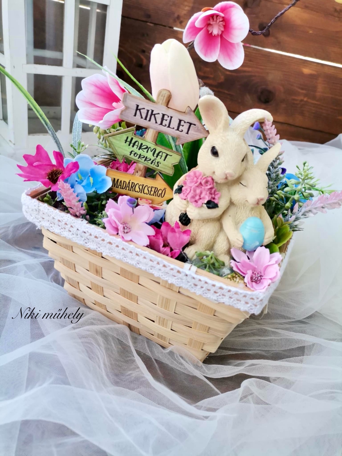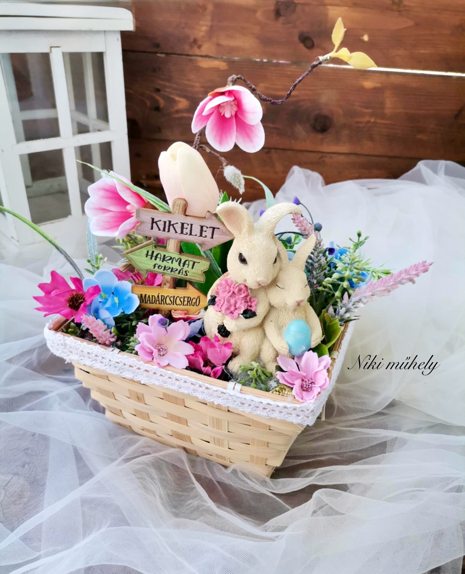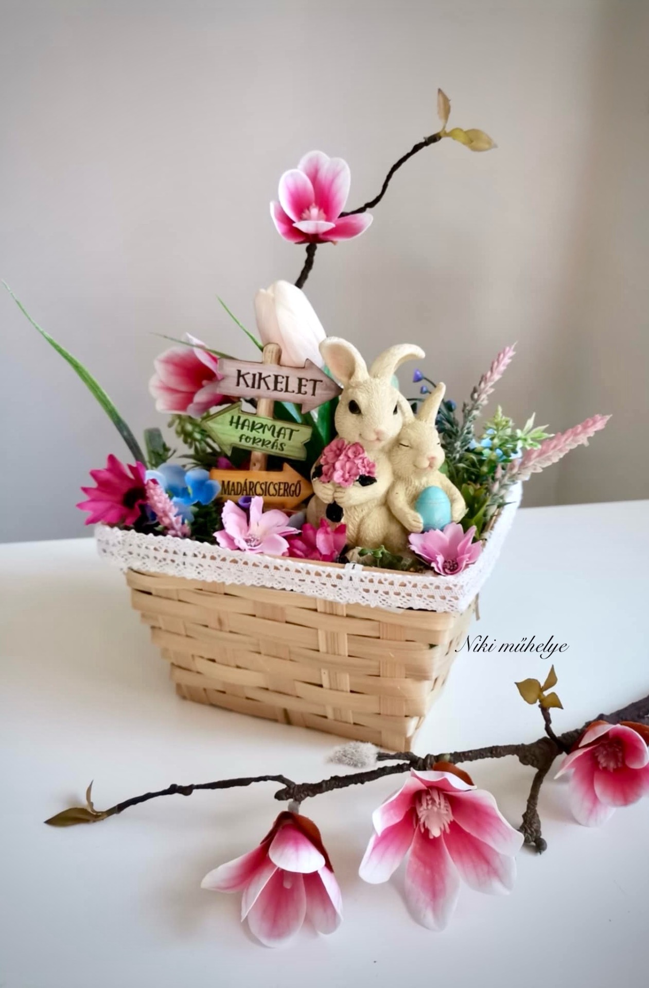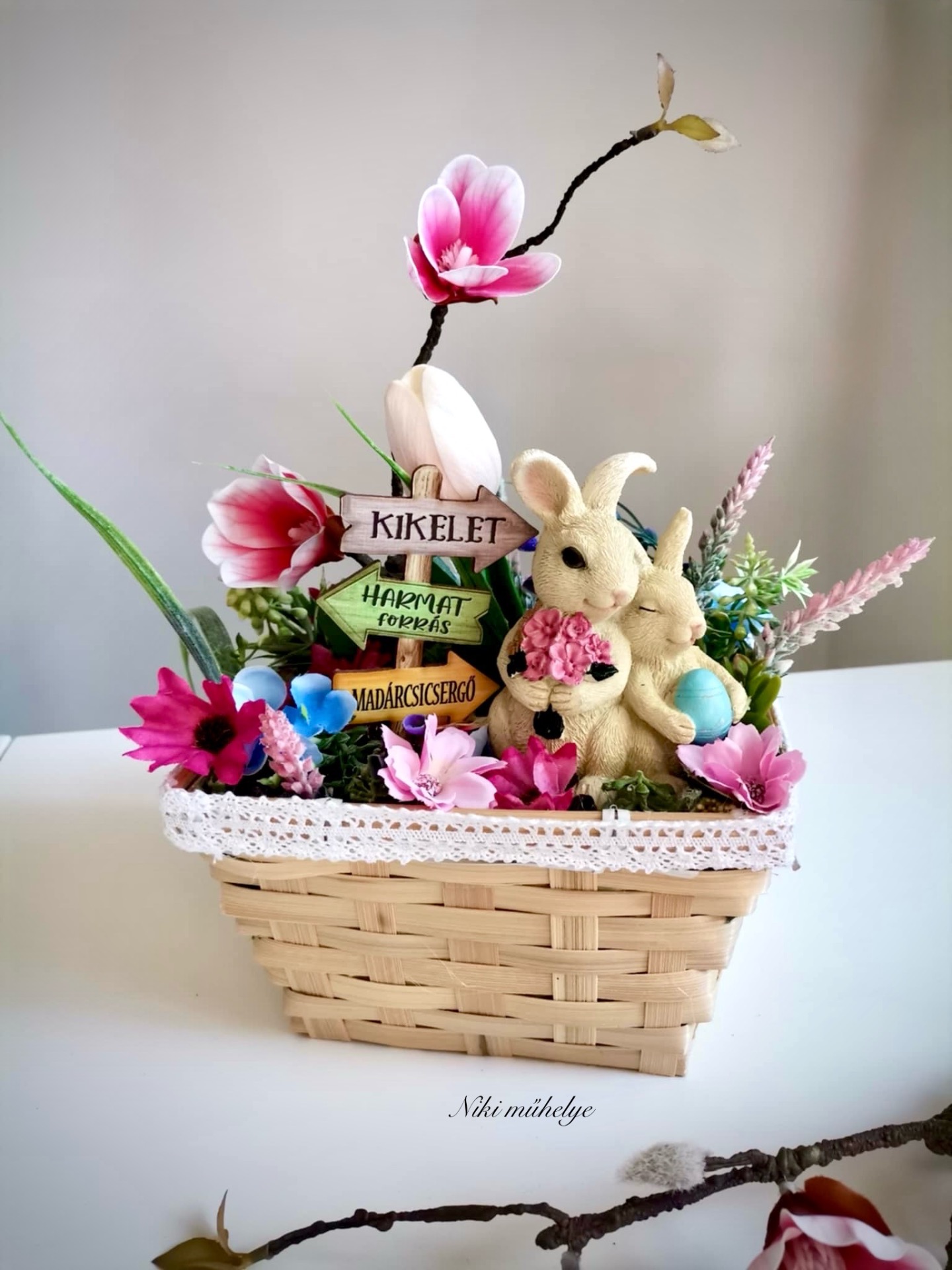 Fonott bambusz alapban készült tavaszi dekoráció. Kosár alapja kb.18*18*11 cm, kész termék magassága kb 28 cm. Élethű magnóliával, levendulával, pozsgázs zöldekkel és bogyókkal dolgoztam.Minden része maradandó!