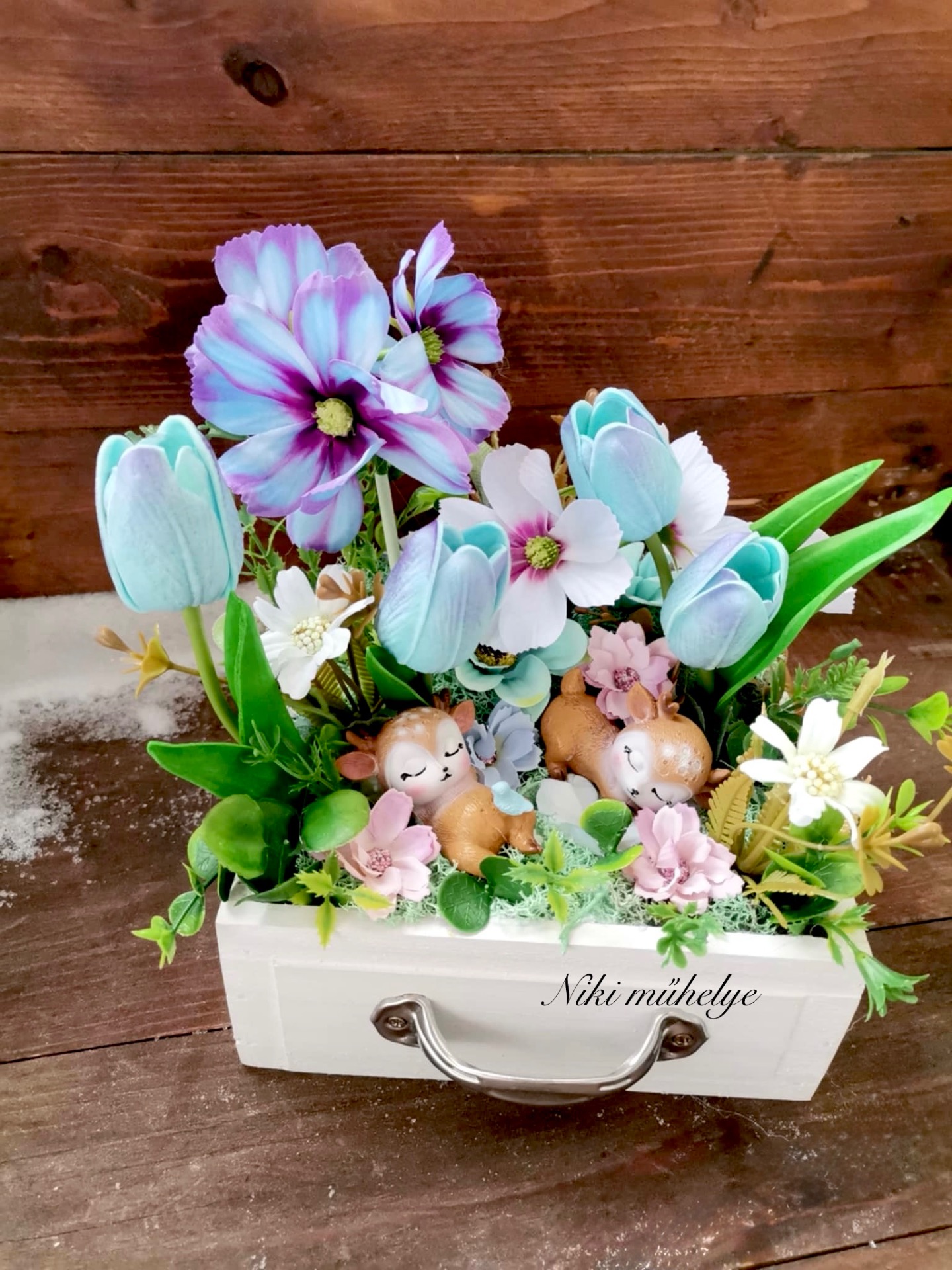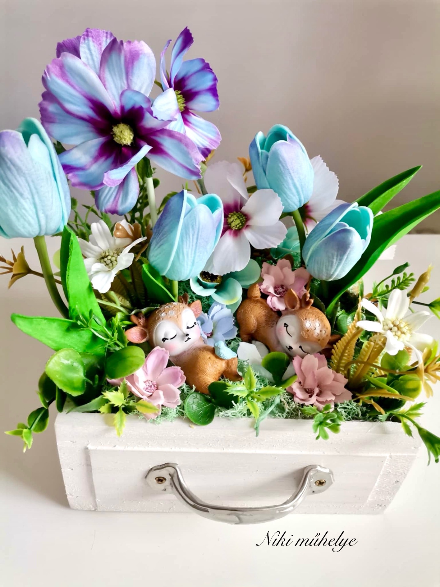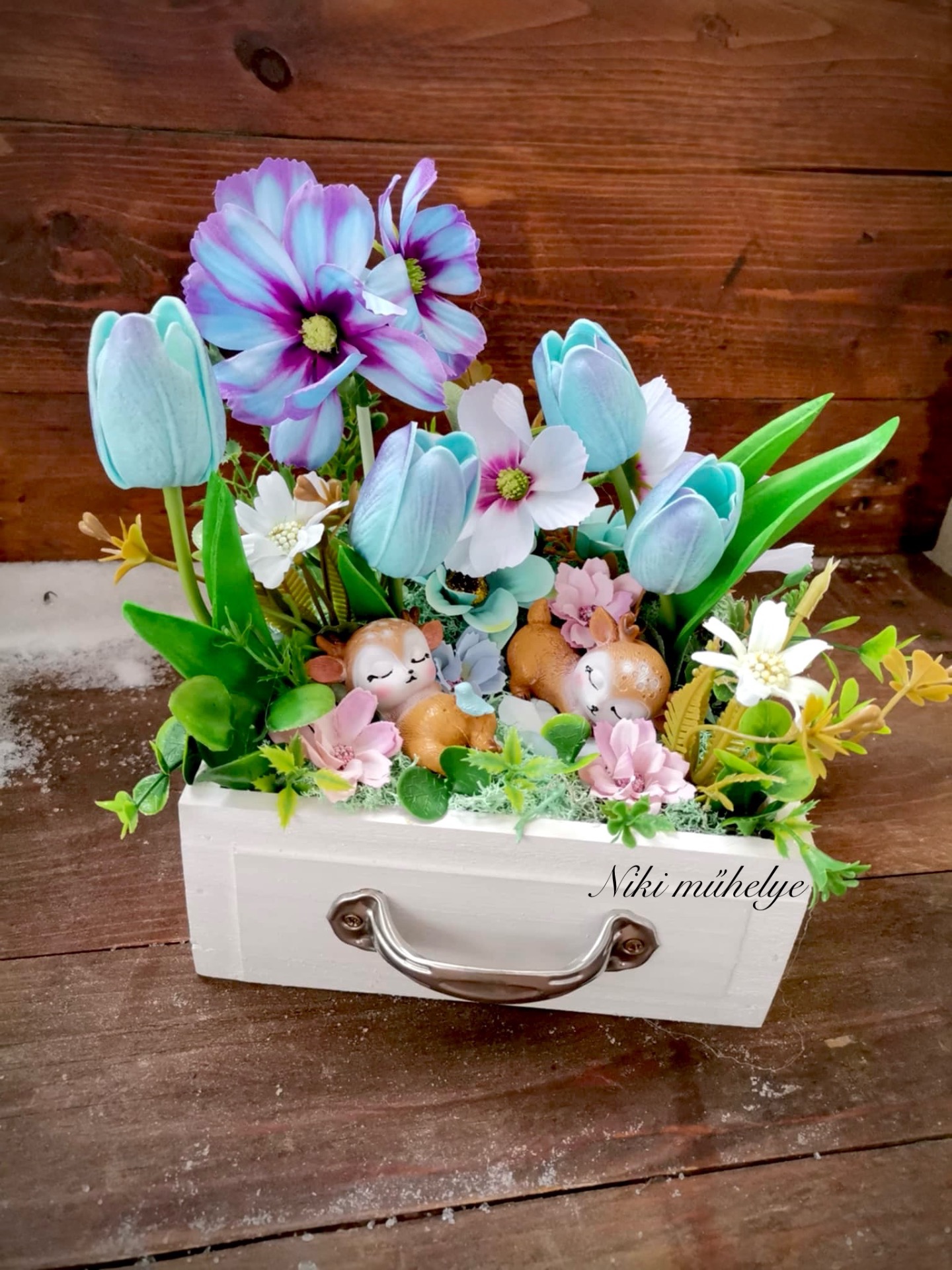 Különleges, tavaszi asztaldísz vintage fiókban.