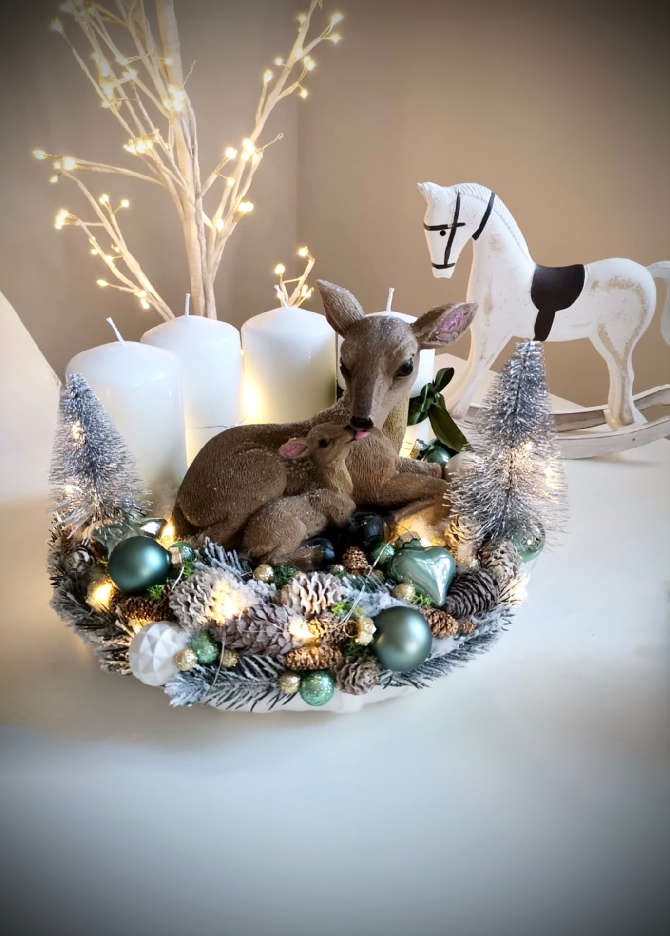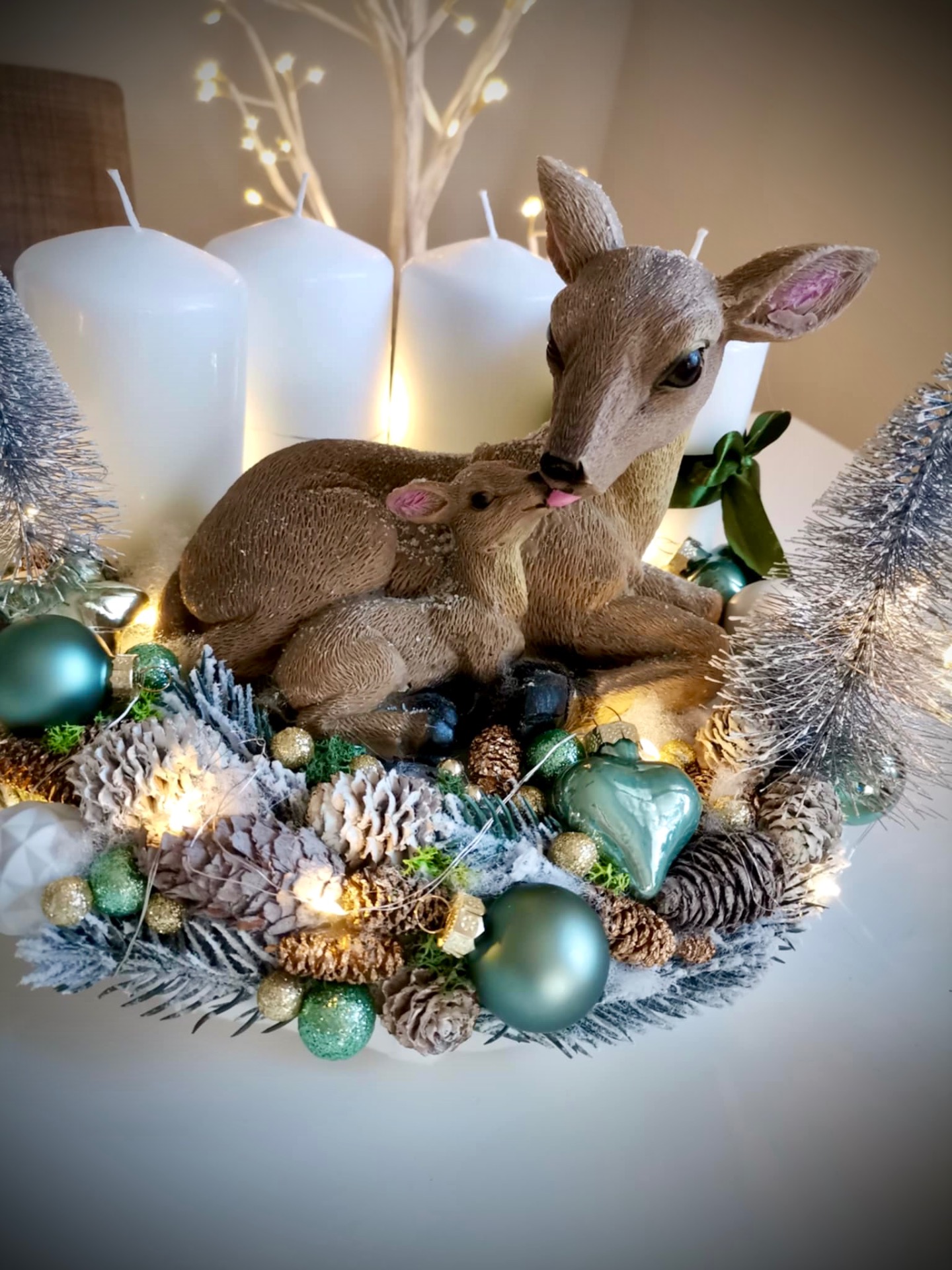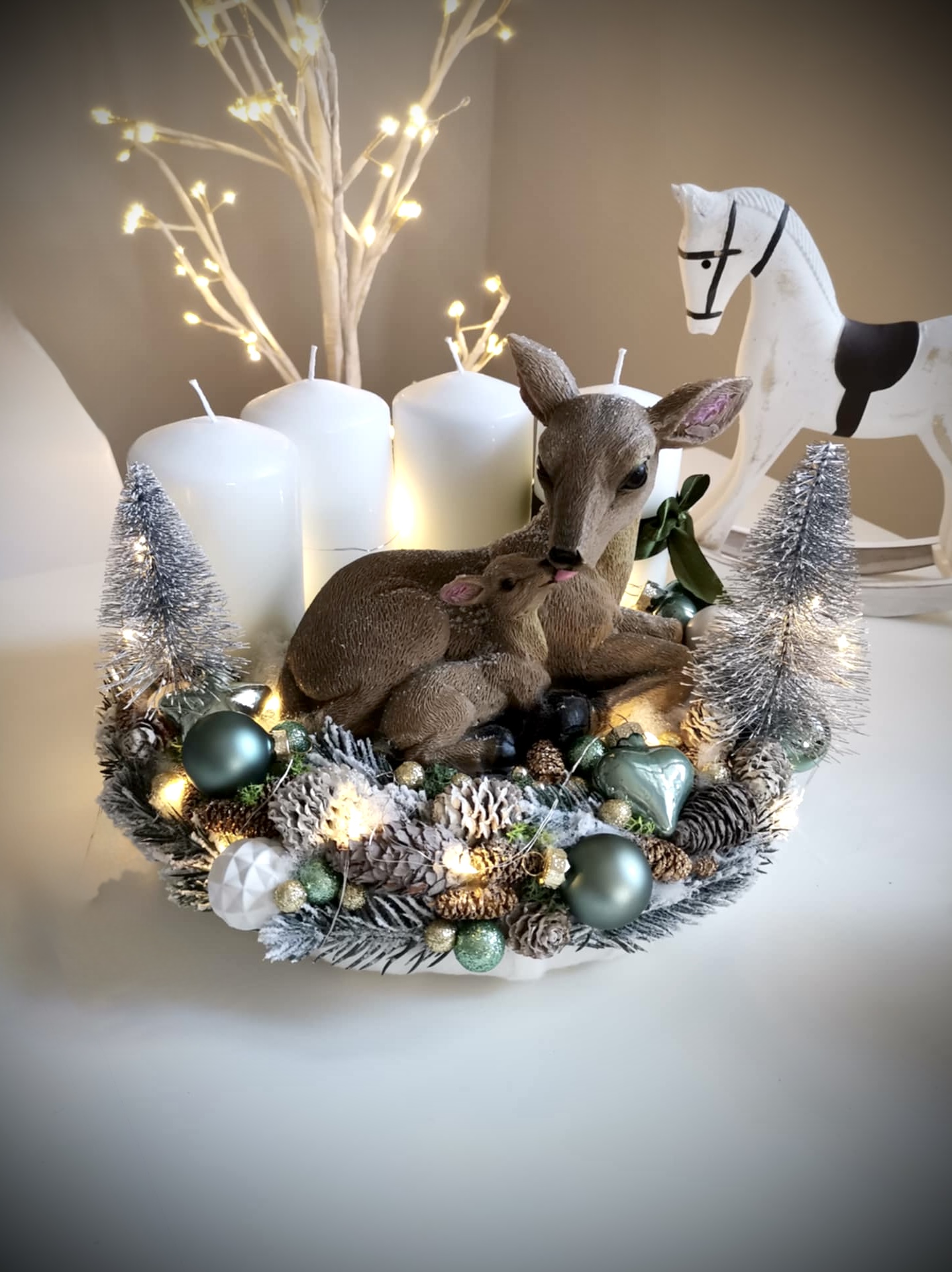 Igazán kedves erdei jelenet. Az adventi alapja plüssel bevont, a kész termék átmérője kb 30 cm. A koszorú világítása elemmel működik, 3 féle valasztható világítási móddal!