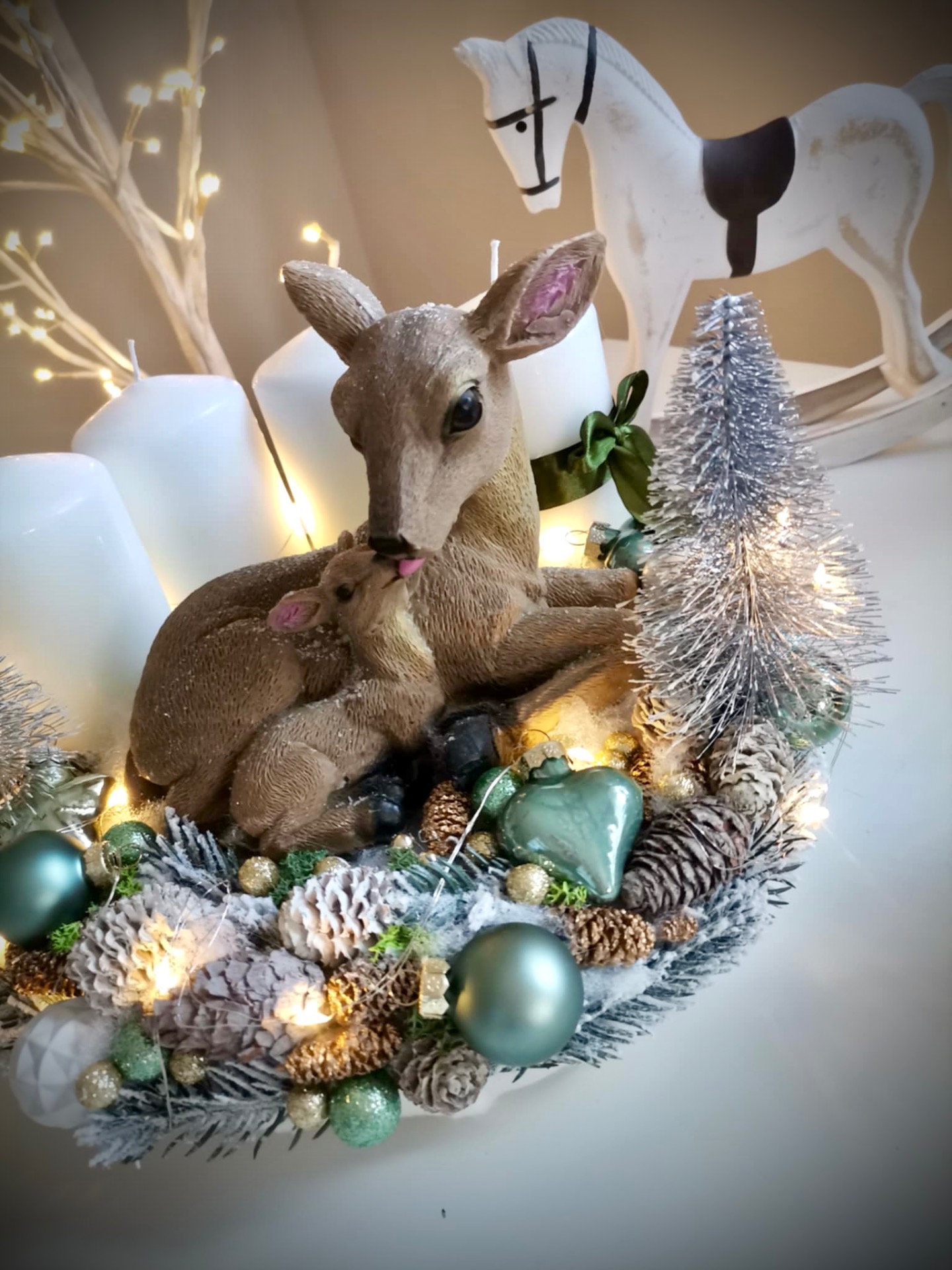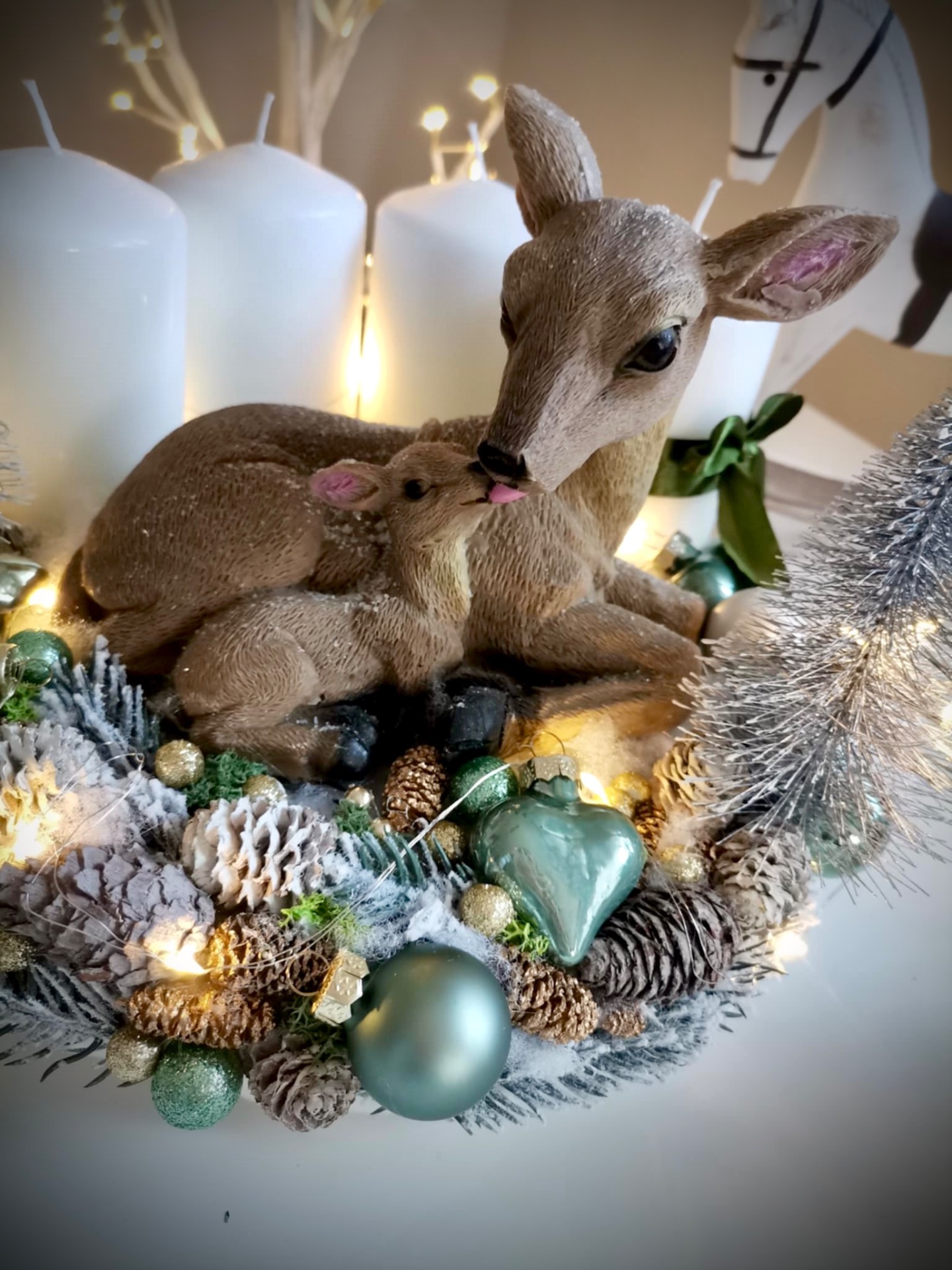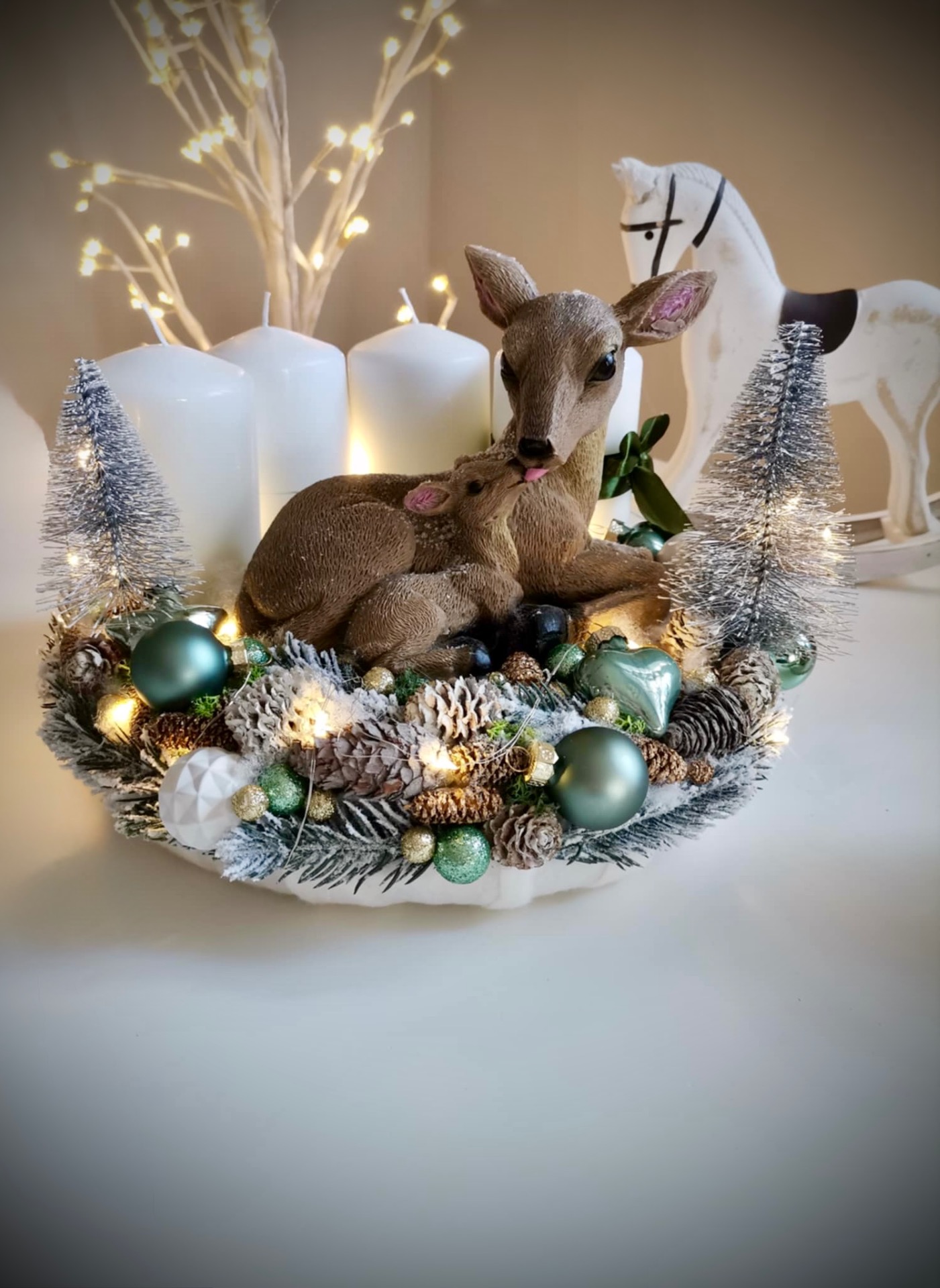 Igazán kedves erdei jelenet. Az adventi alapja plüssel bevont, a kész termék átmérője kb 30 cm. A koszorú világítása elemmel működik, 3 féle valasztható világítási móddal!