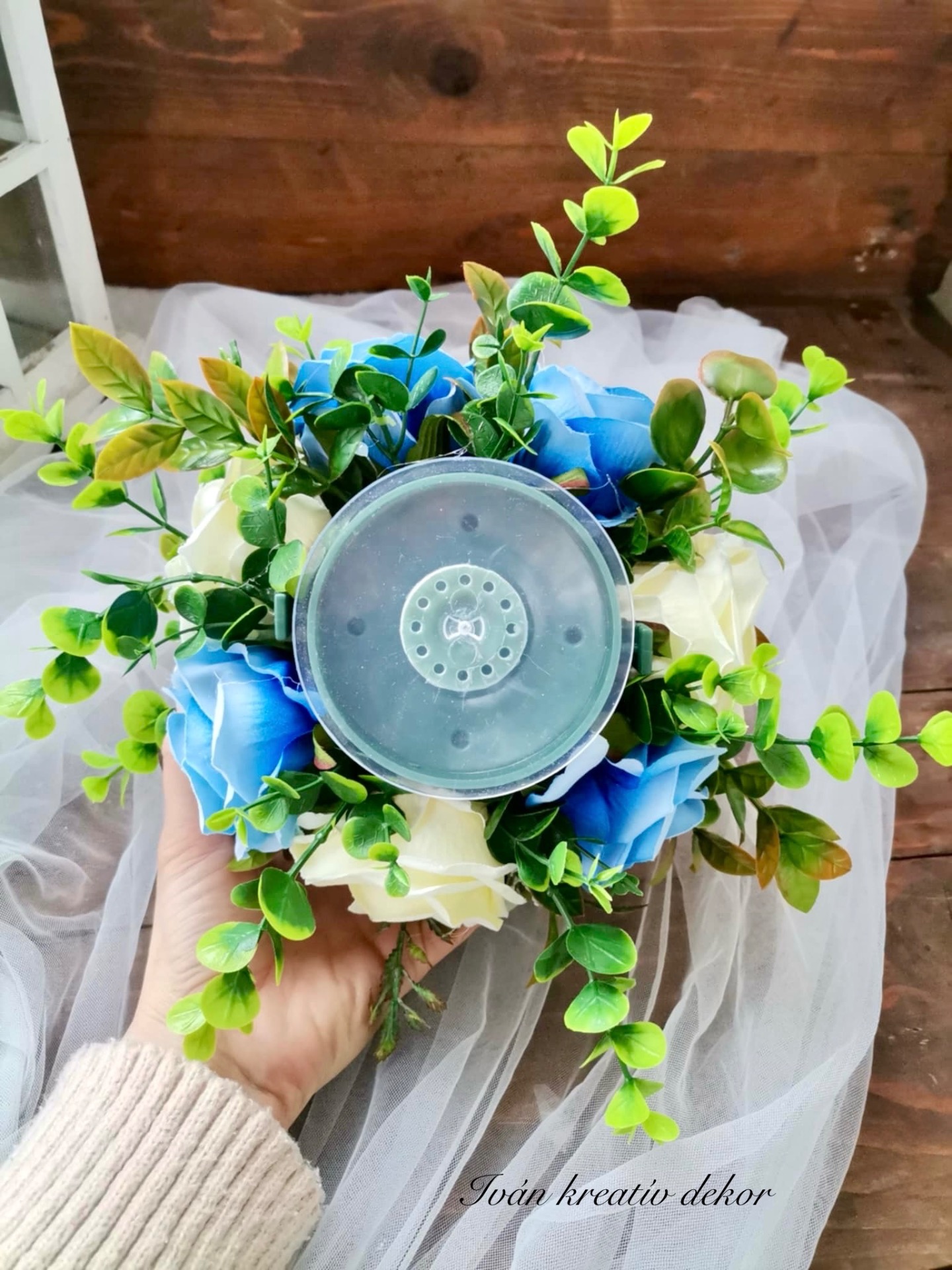 *Vákuumos autódísz: Selyemvirágokkal és pozsgás zöldekkel dolgoztam. Az alap vákuumos (tappancsos) , melynek mérete: 12cm