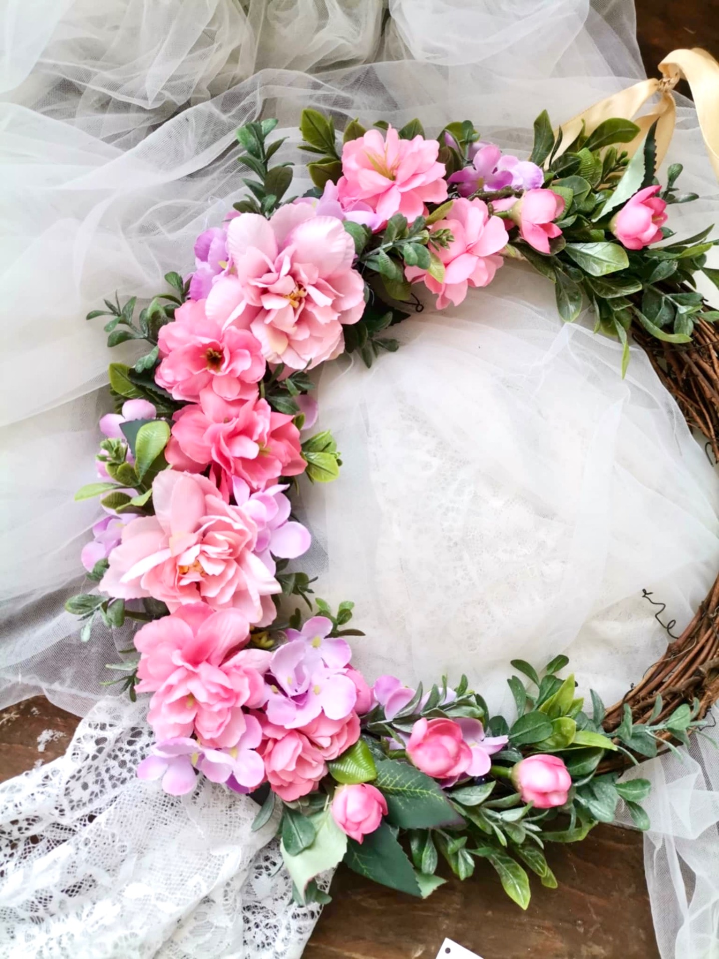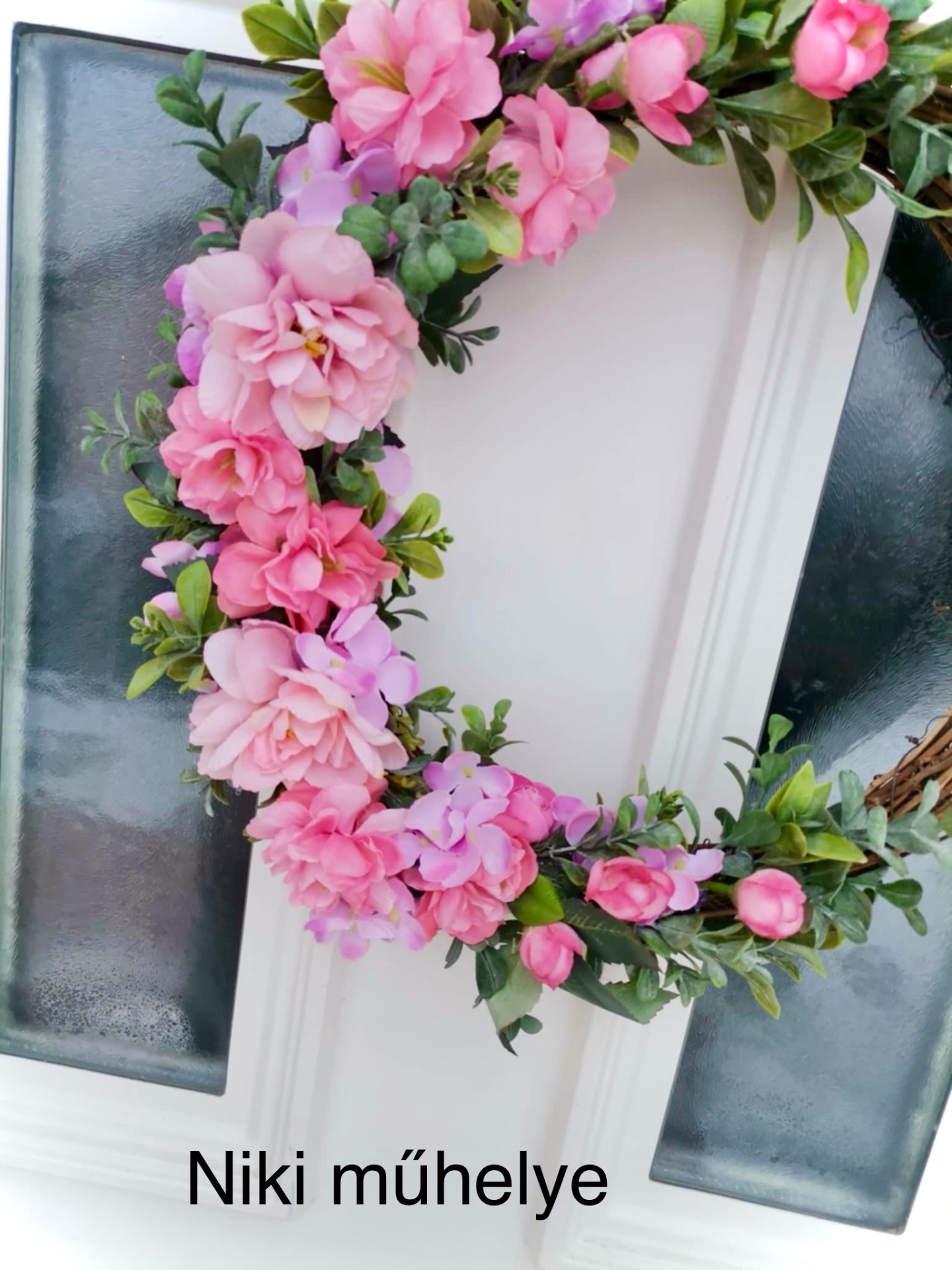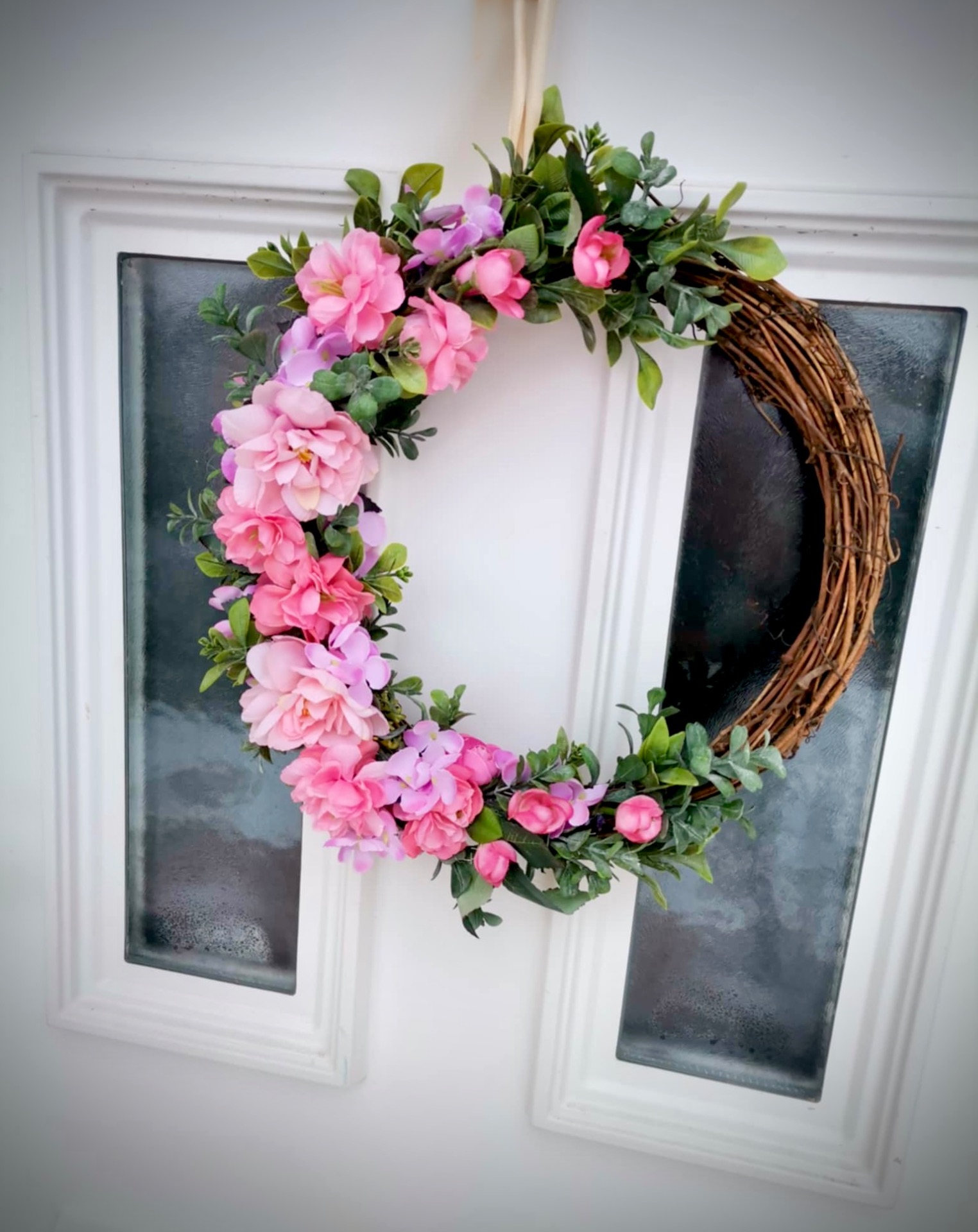 Vessző alapon készült ajtódísz, selyemvirágokkal díszítve.